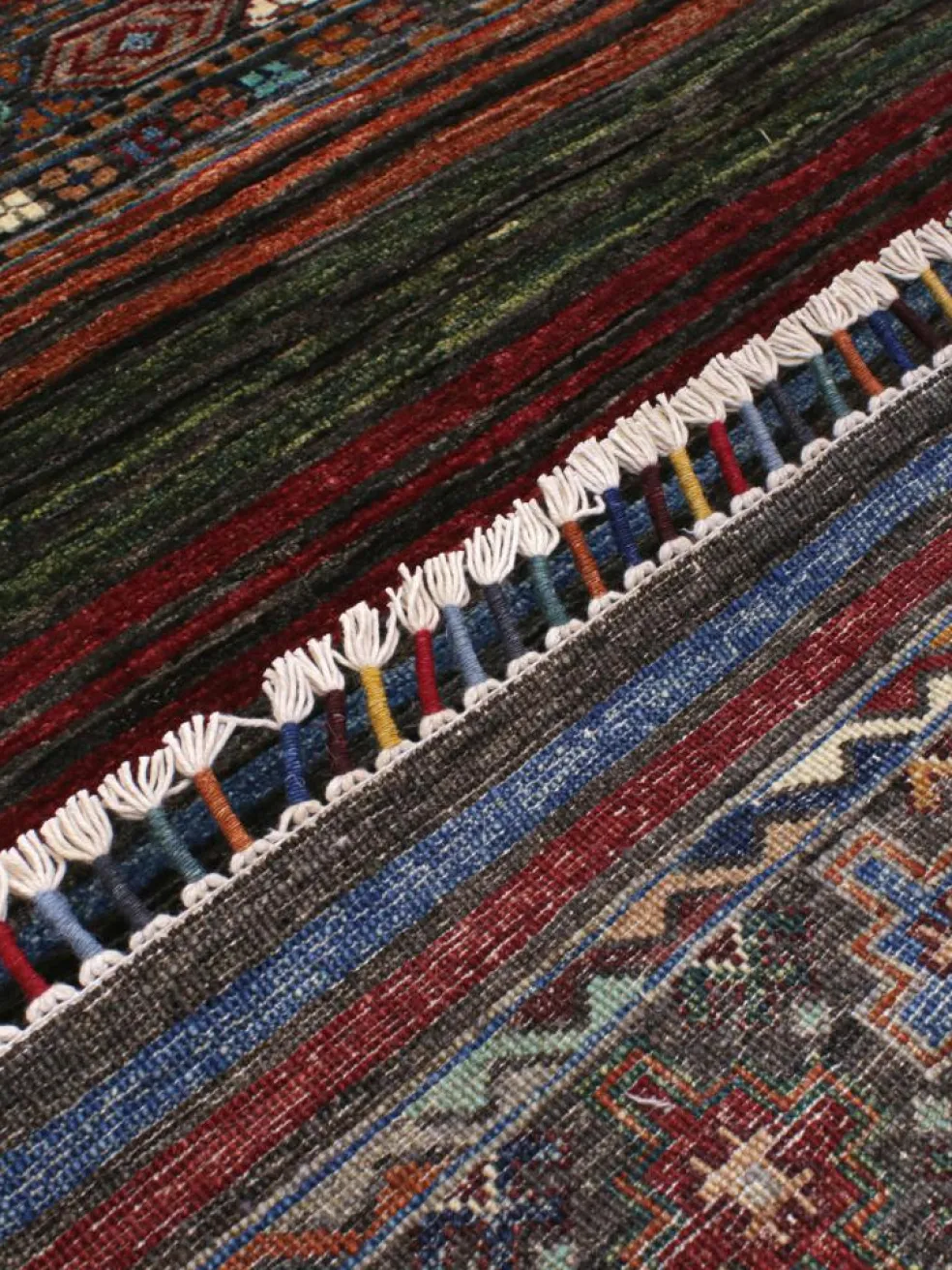 -Muster sind bunte Längsstreifen mit vielen verschiedenen Motiven gefüllt. Durch den flachen und festen Flor ist der Teppich unempfindlich gegenüber den Belastungen des Alltags. – Das Besondere an diesemOrientteppich