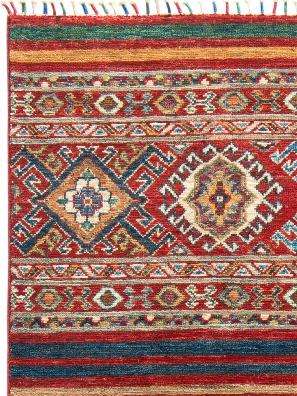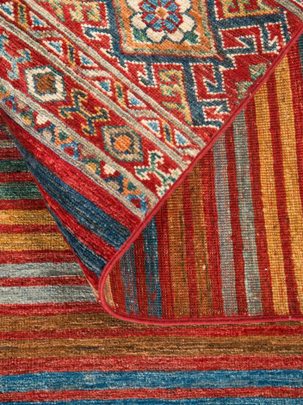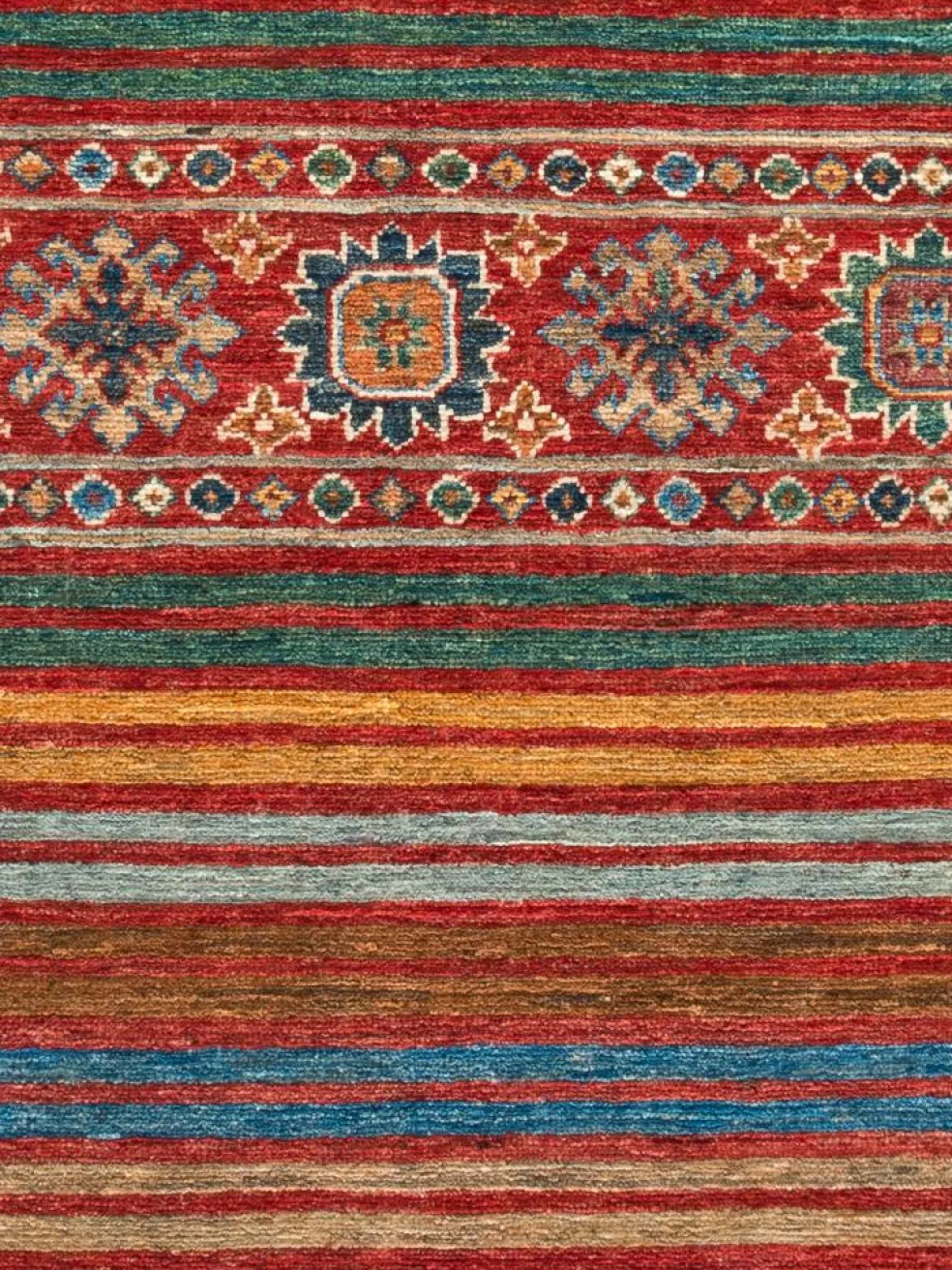 -Muster sind bunte Längsstreifen mit vielen verschiedenen Motiven gefüllt. Durch den flachen und festen Flor ist der Teppich unempfindlich gegenüber den Belastungen des Alltags.- Das Besondere an diesemOrientteppich