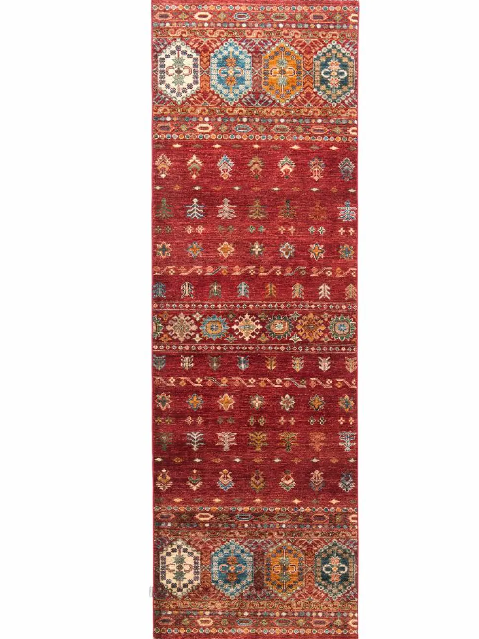 -Muster sind bunte Längsstreifen mit vielen verschiedenen Motiven gefüllt. Durch den flachen und festen Flor ist der Teppich unempfindlich gegenüber den Belastungen des Alltags.- Das Besondere an diesemOrientteppich