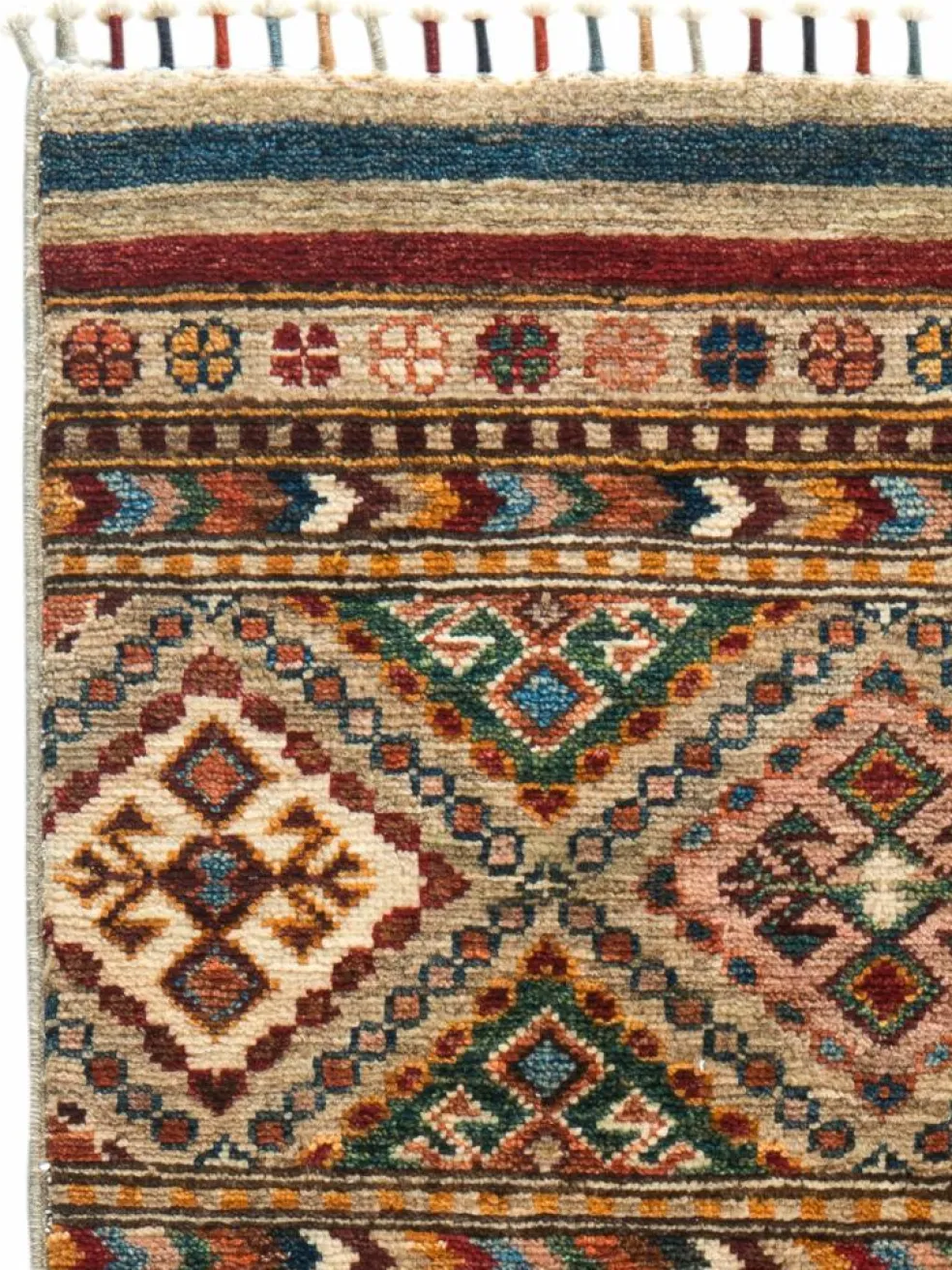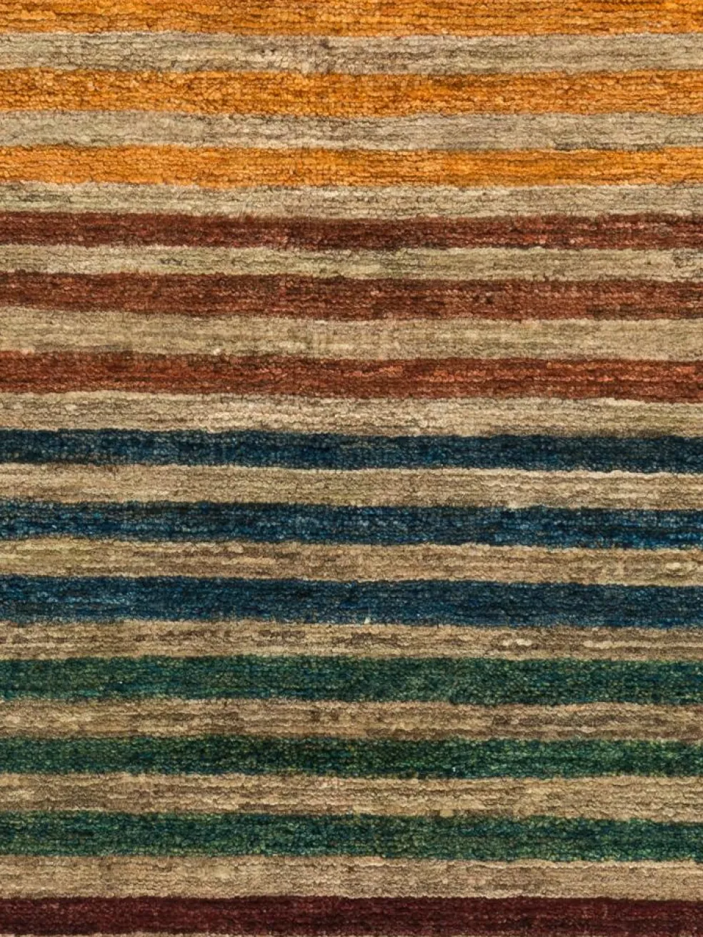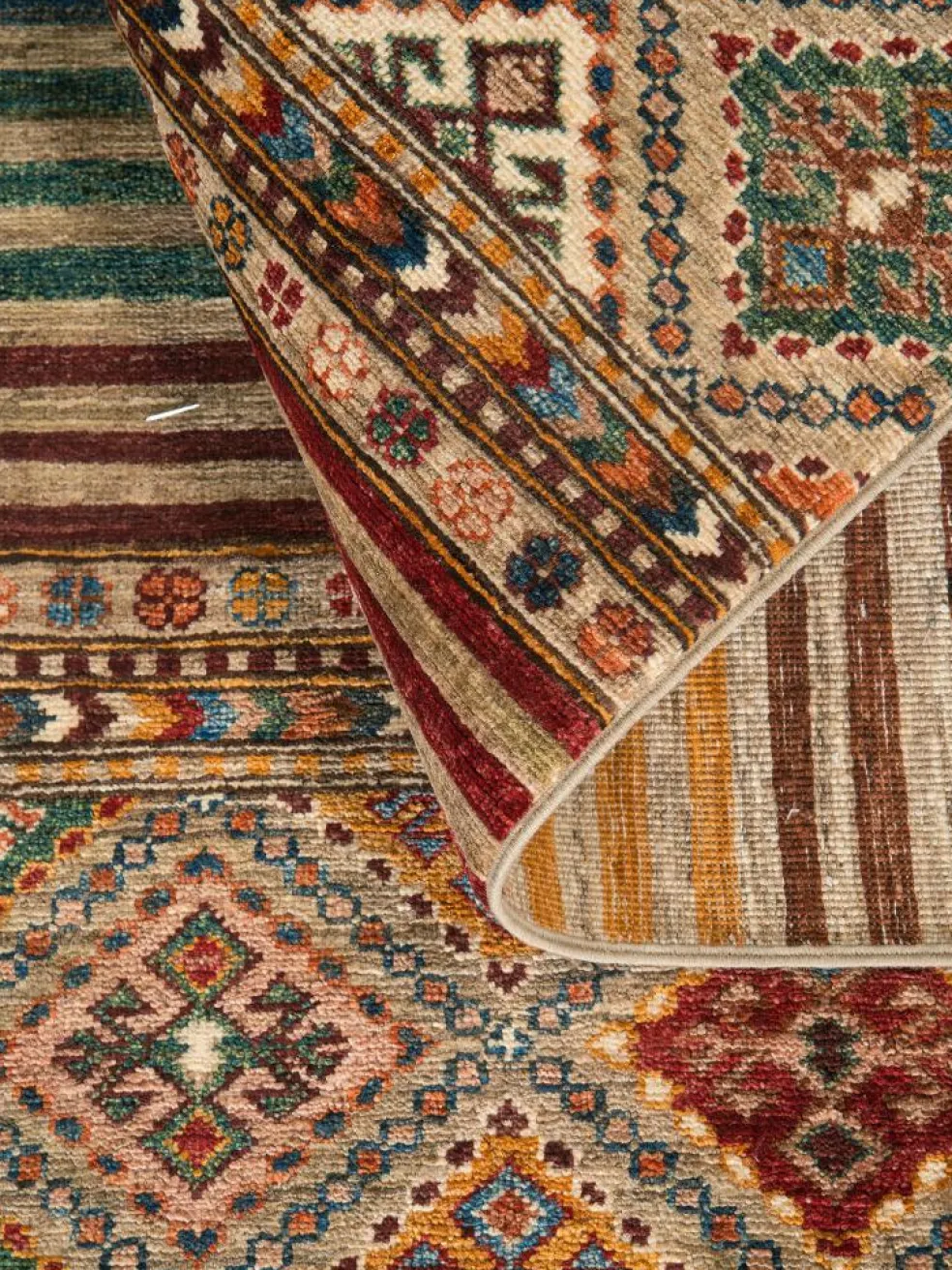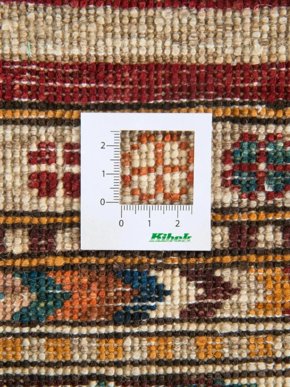 -Muster sind bunte Längsstreifen mit vielen verschiedenen Motiven gefüllt. Durch den flachen und festen Flor ist der Teppich unempfindlich gegenüber den Belastungen des Alltags.- Das Besondere an diesemOrientteppich