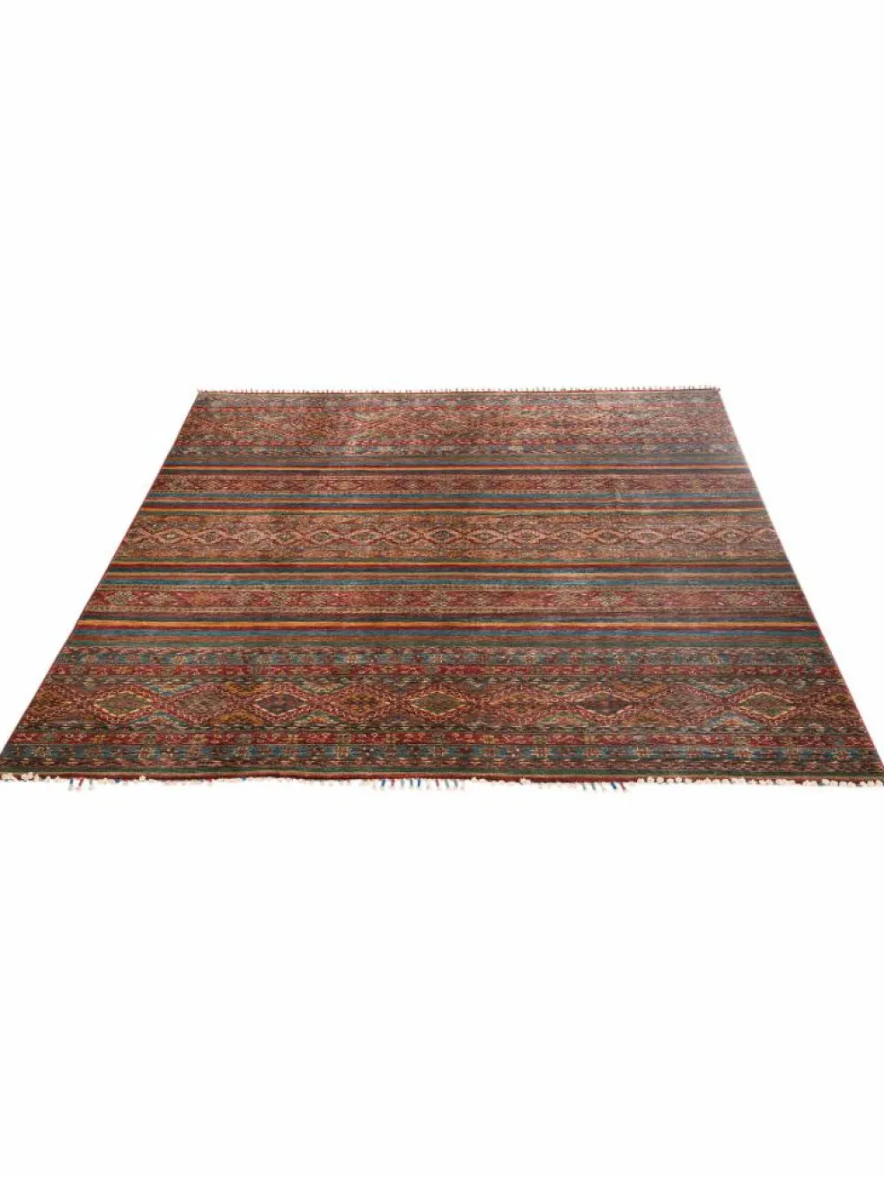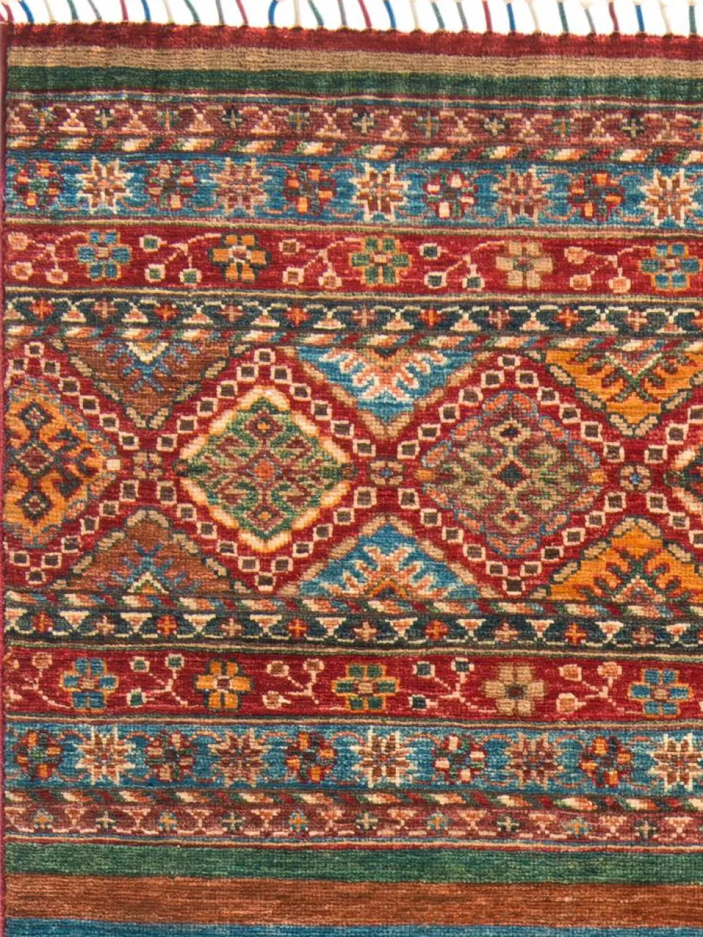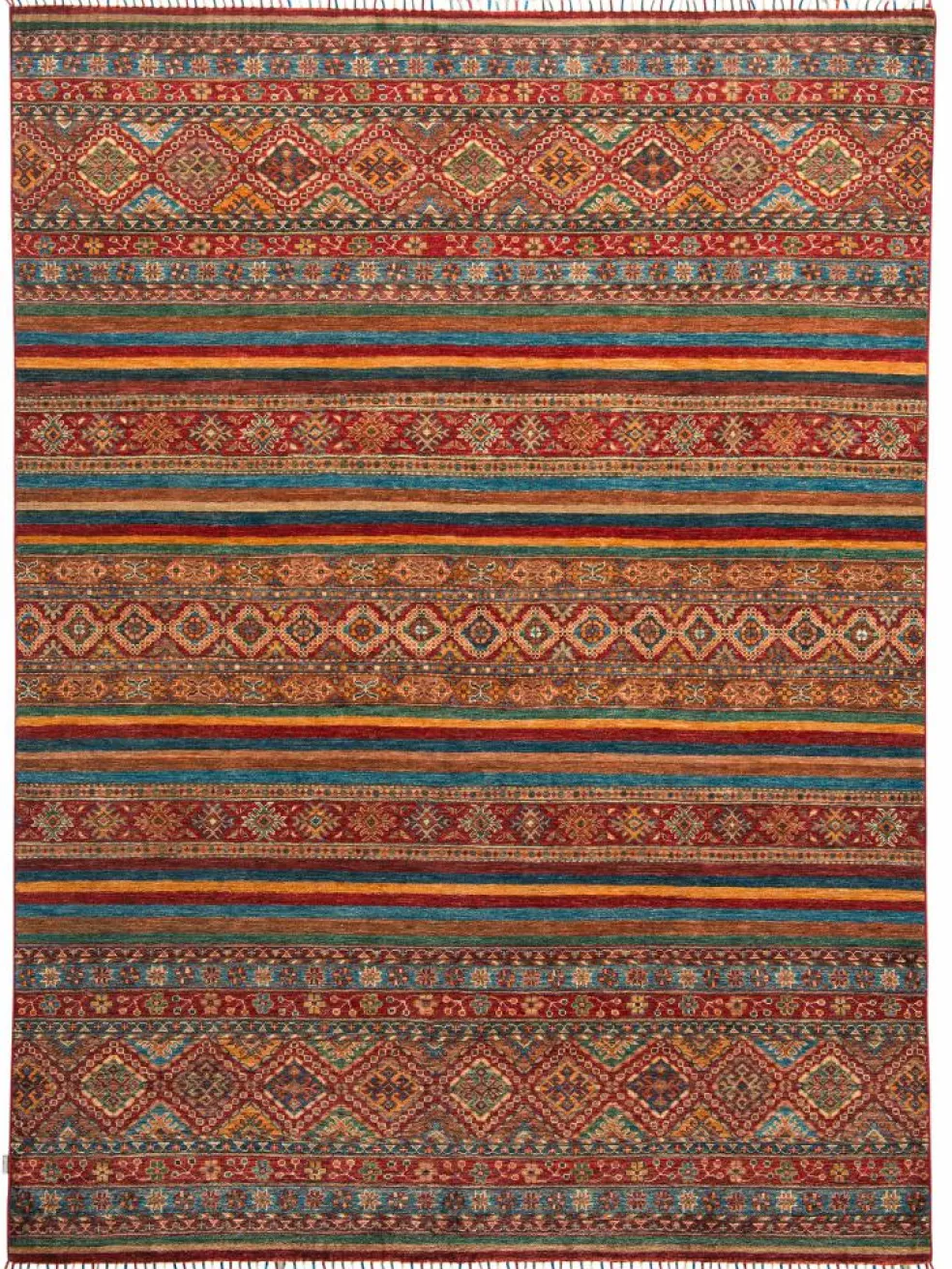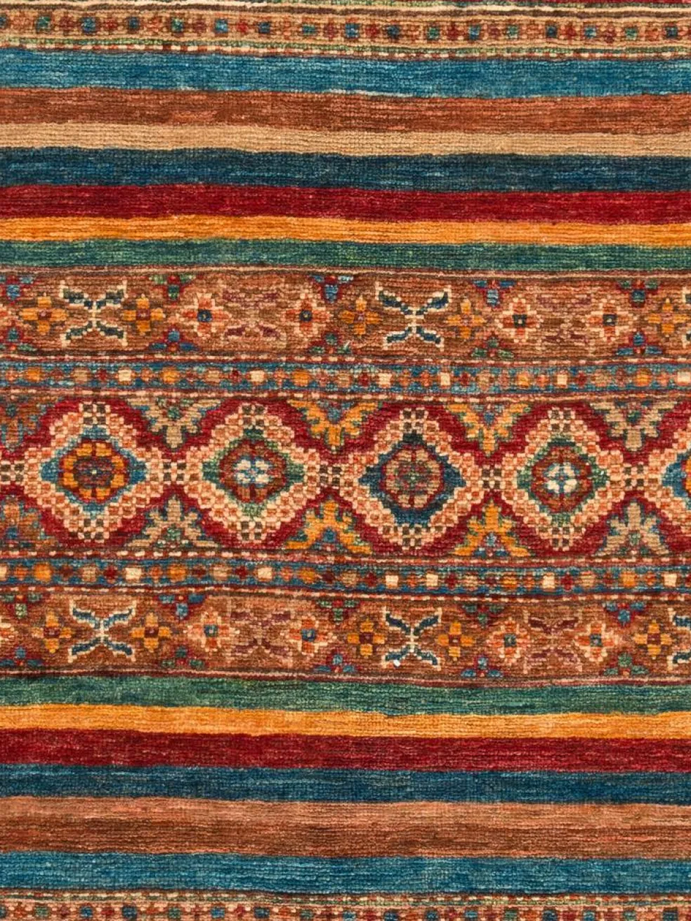 -Muster sind bunte Längsstreifen mit vielen verschiedenen Motiven gefüllt. Durch den flachen und festen Flor ist der Teppich unempfindlich gegenüber den Belastungen des Alltags.- Das Besondere an diesemOrientteppich