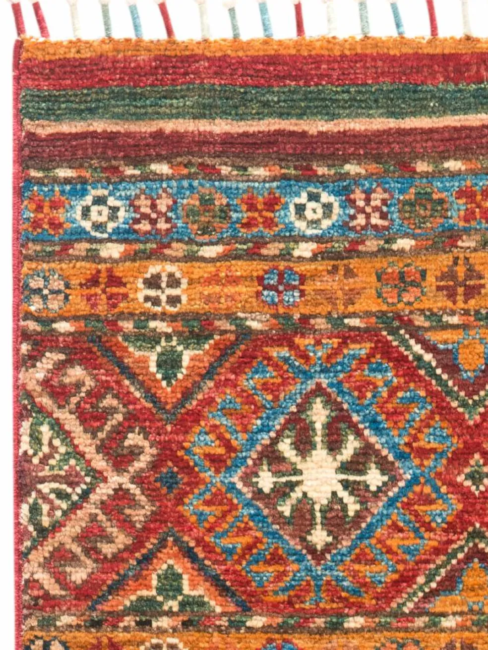 -Muster sind bunte Längsstreifen mit vielen verschiedenen Motiven gefüllt. Durch den flachen und festen Flor ist der Teppich unempfindlich gegenüber den Belastungen des Alltags.- Das Besondere an diesemOrientteppich