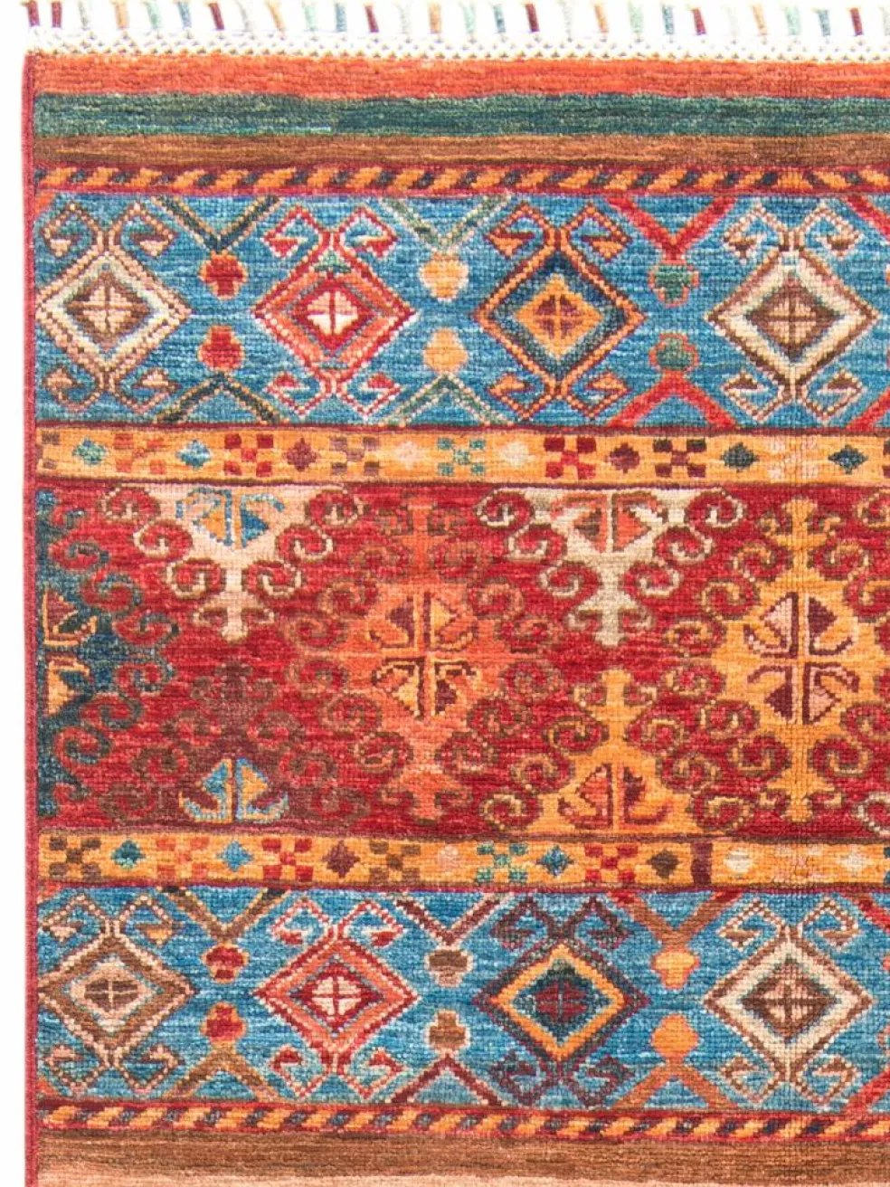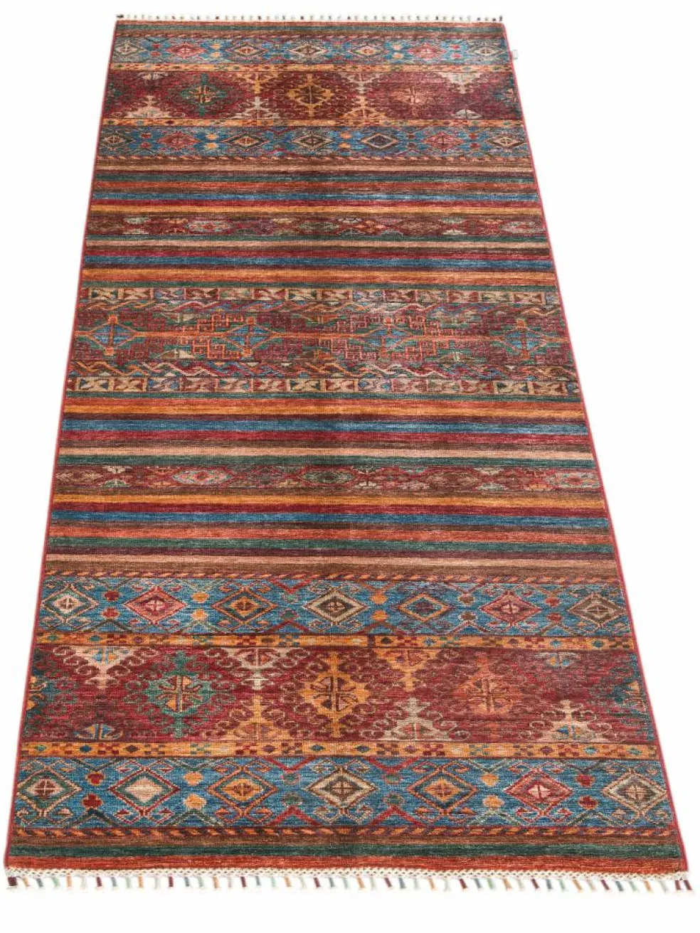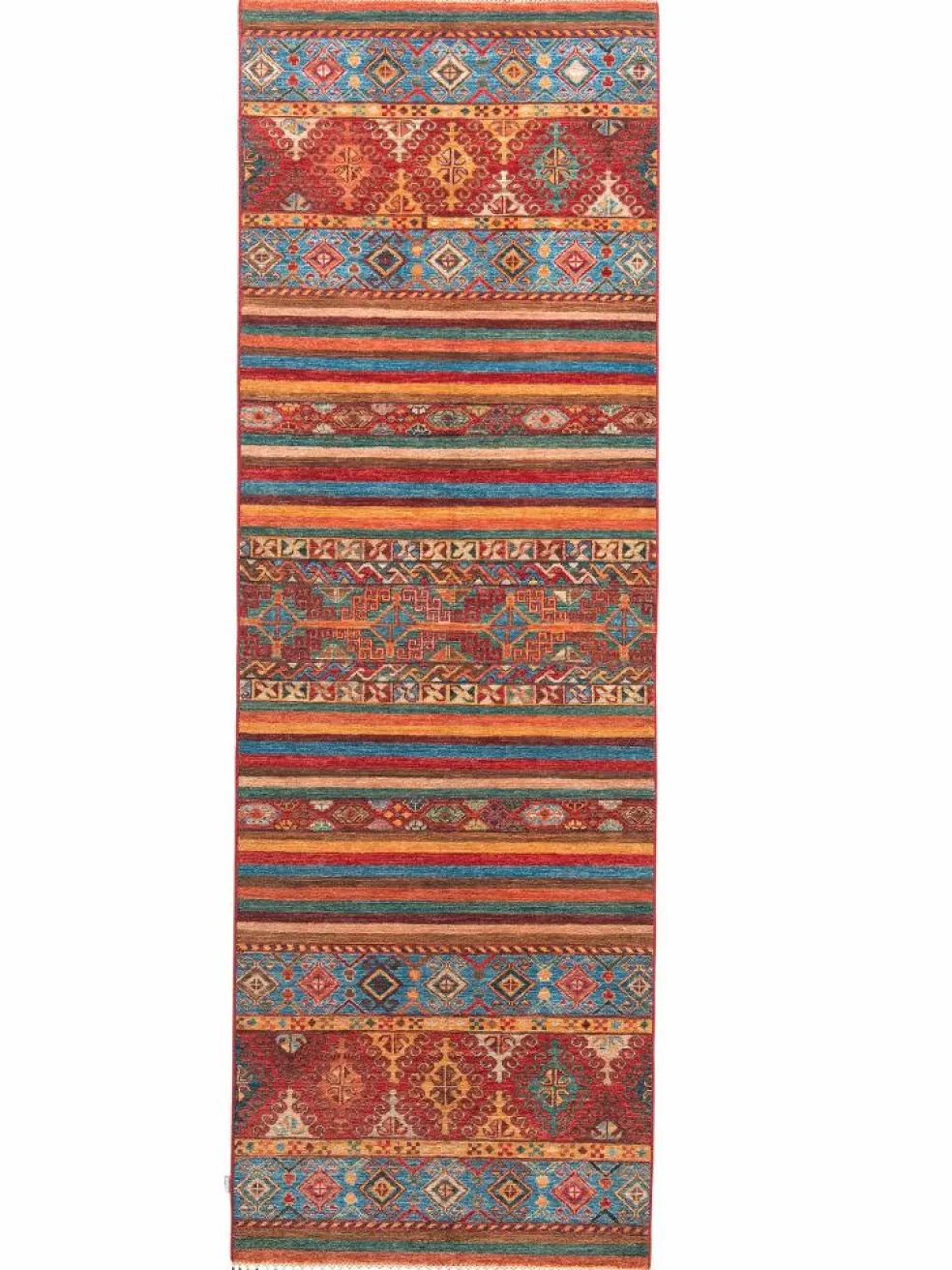 -Muster sind bunte Längsstreifen mit vielen verschiedenen Motiven gefüllt. Durch den flachen und festen Flor ist der Teppich unempfindlich gegenüber den Belastungen des Alltags.- Das Besondere an diesemOrientteppich