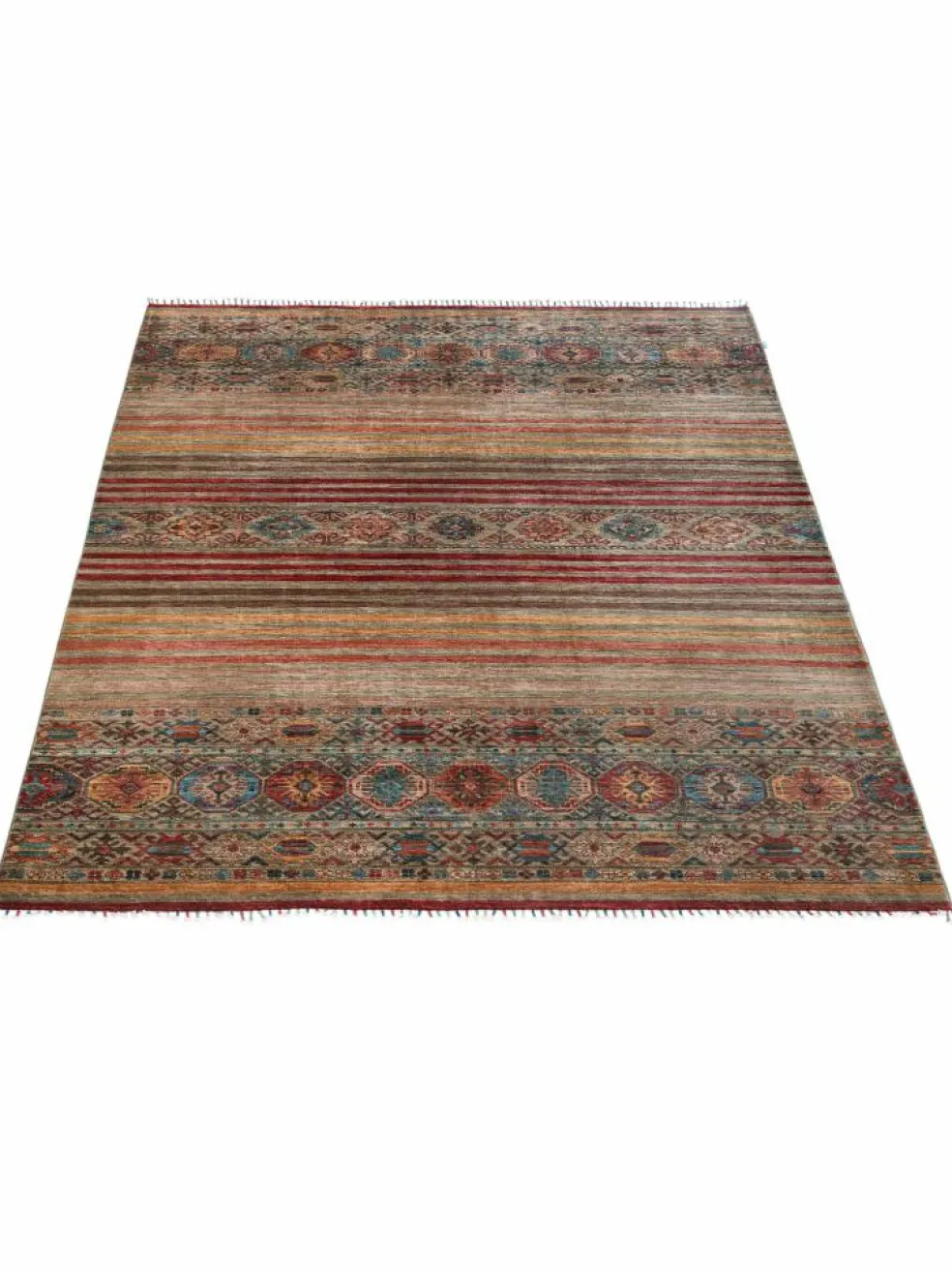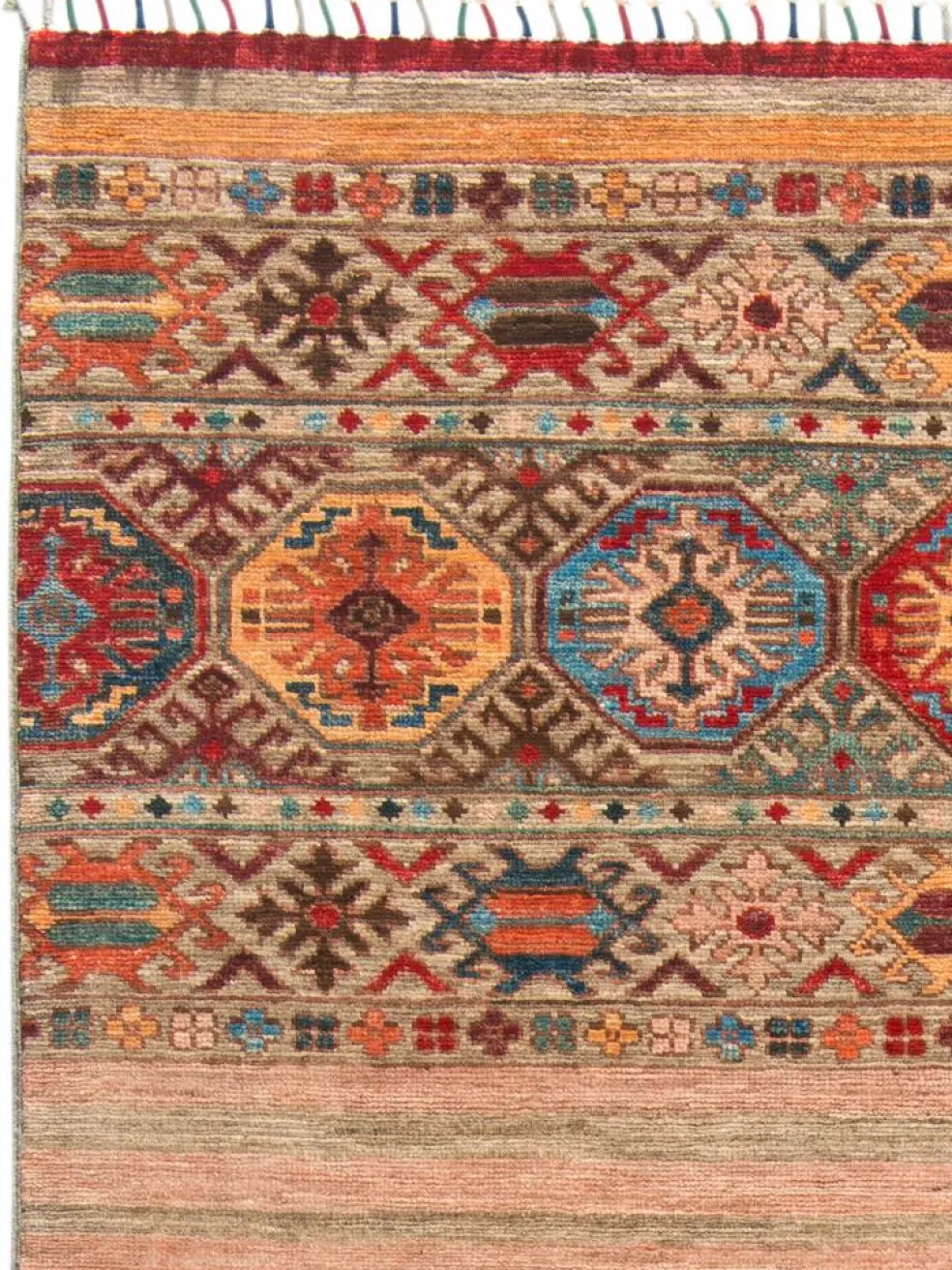 -Muster sind bunte Längsstreifen mit vielen verschiedenen Motiven gefüllt. Durch den flachen und festen Flor ist der Teppich unempfindlich gegenüber den Belastungen des Alltags.- Das Besondere an diesemOrientteppich
