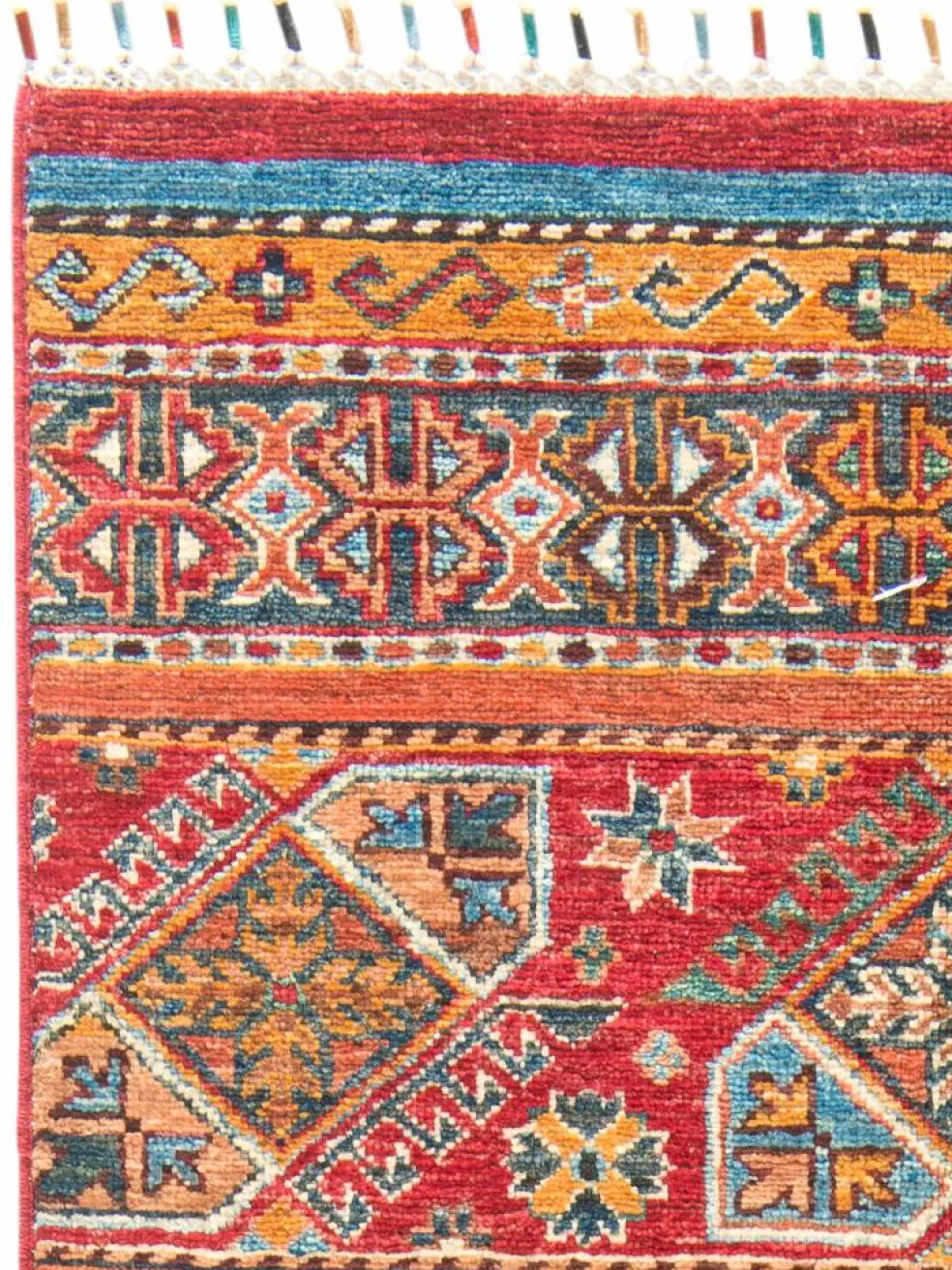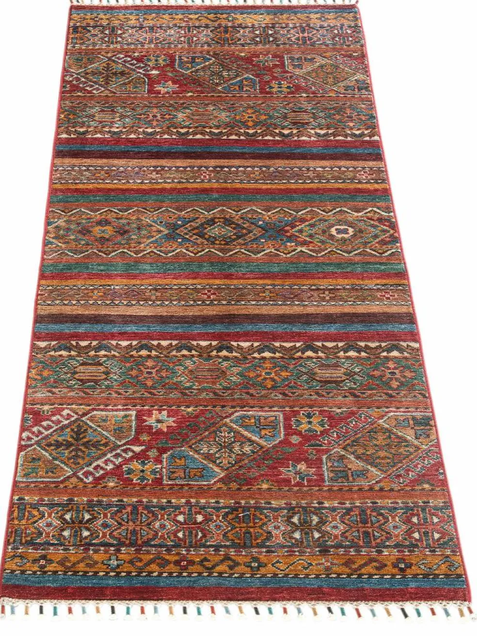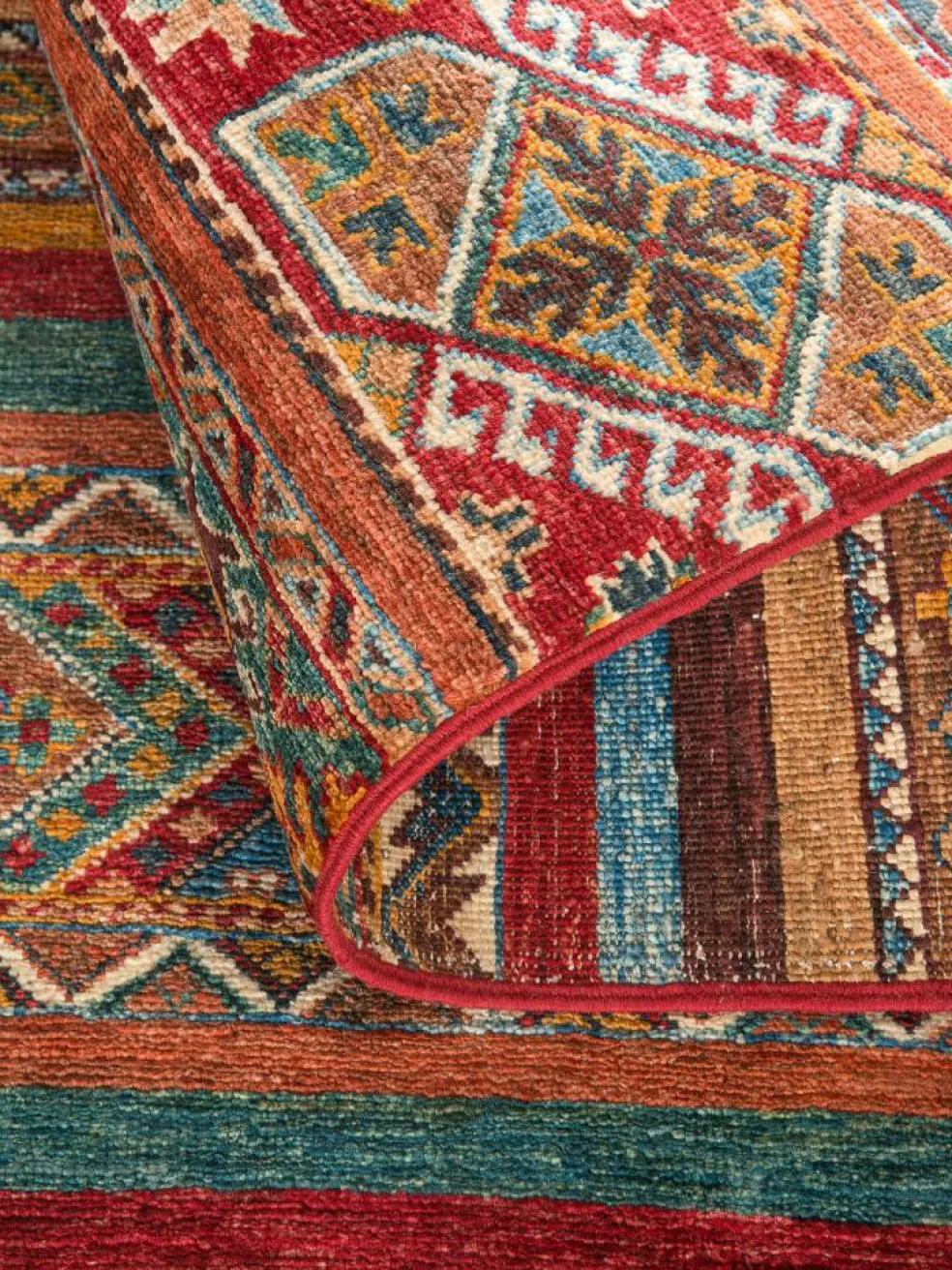 -Muster sind bunte Längsstreifen mit vielen verschiedenen Motiven gefüllt. Durch den flachen und festen Flor ist der Teppich unempfindlich gegenüber den Belastungen des Alltags.- Das Besondere an diesemOrientteppich