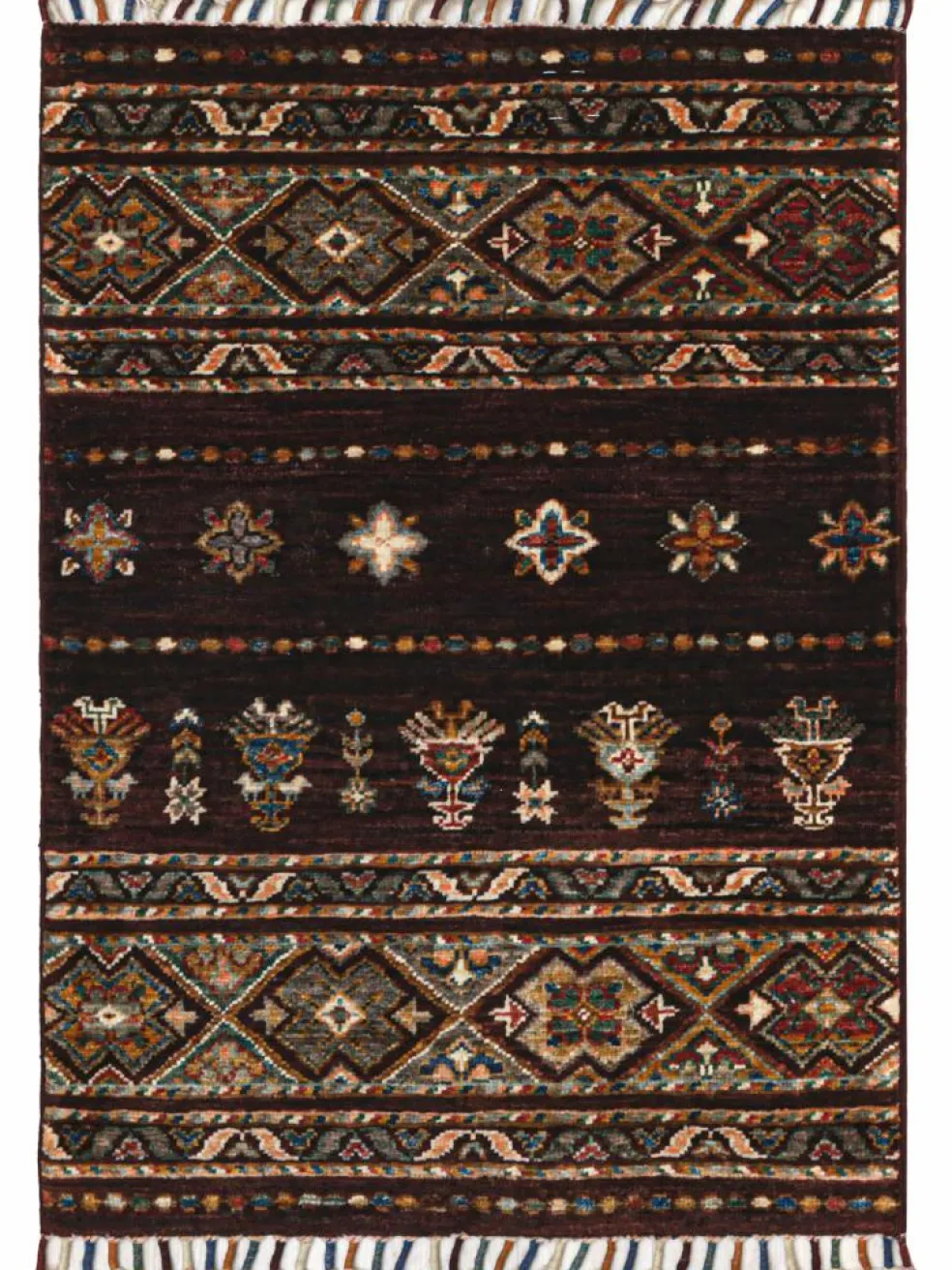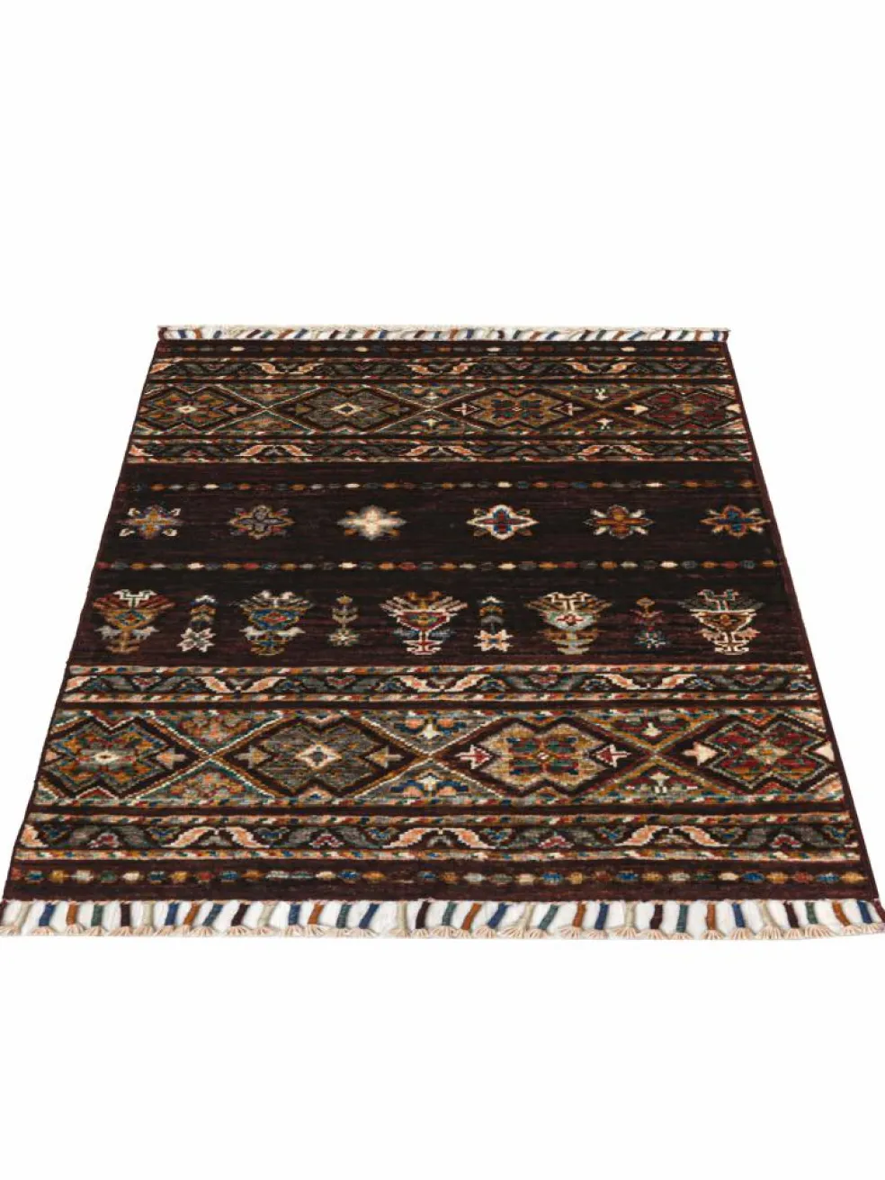 -Muster sind bunte Längsstreifen mit vielen verschiedenen Motiven gefüllt. Durch den flachen und festen Flor ist der Teppich unempfindlich gegenüber den Belastungen des Alltags. – Das Besondere an diesemOrientteppich