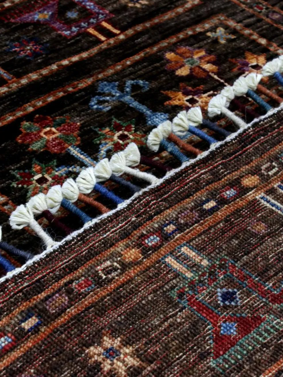 -Muster sind bunte Längsstreifen mit vielen verschiedenen Motiven gefüllt. Durch den flachen und festen Flor ist der Teppich unempfindlich gegenüber den Belastungen des Alltags. – Das Besondere an diesemOrientteppich