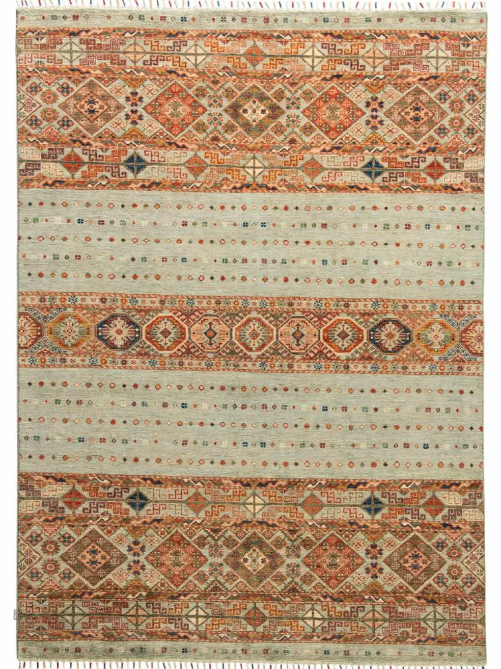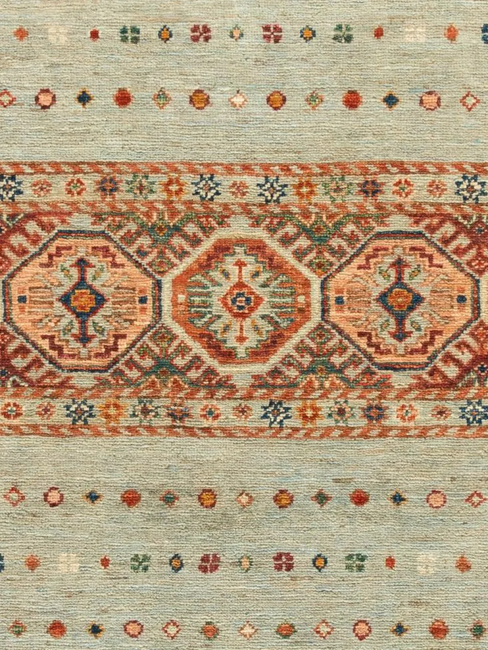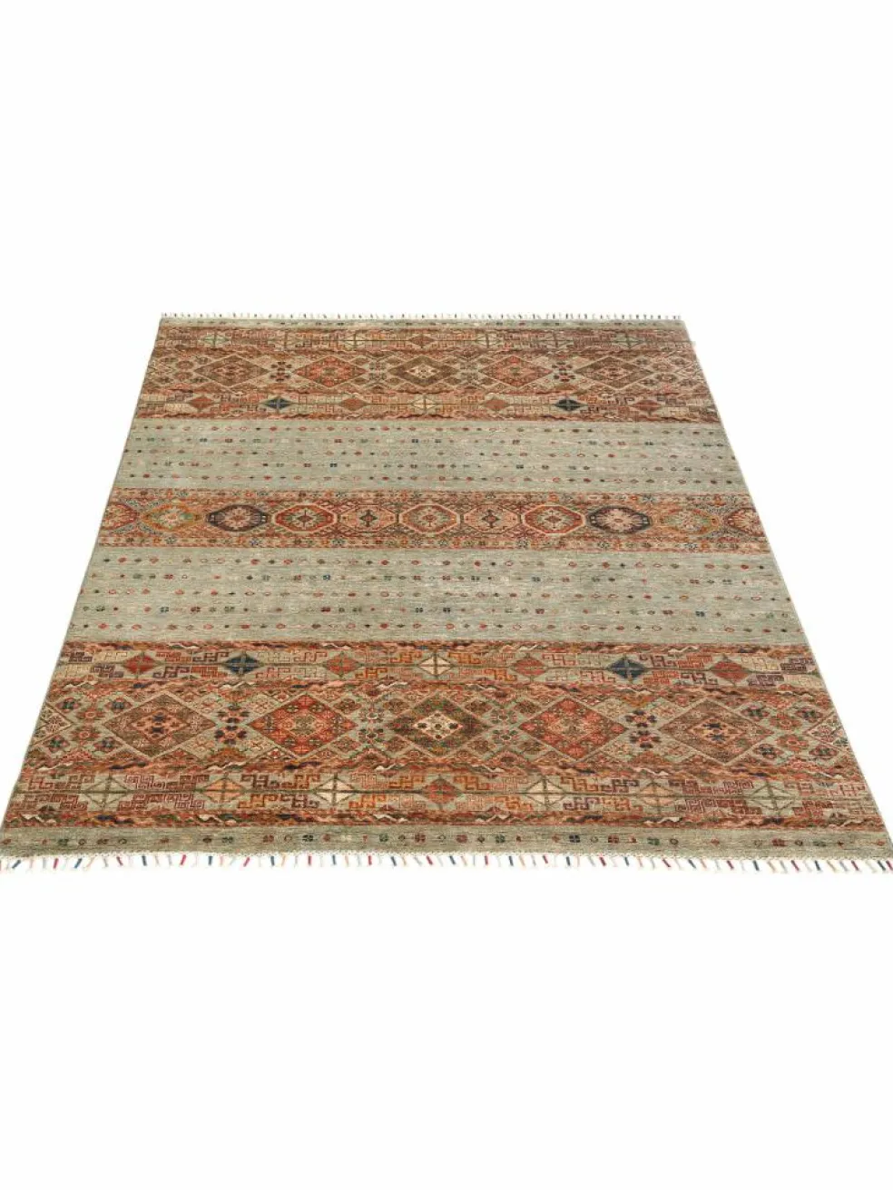 -Muster sind bunte Längsstreifen mit vielen verschiedenen Motiven gefüllt. Durch den flachen und festen Flor ist der Teppich unempfindlich gegenüber den Belastungen des Alltags.- Das Besondere an diesemOrientteppich
