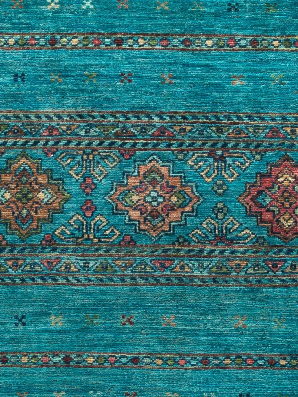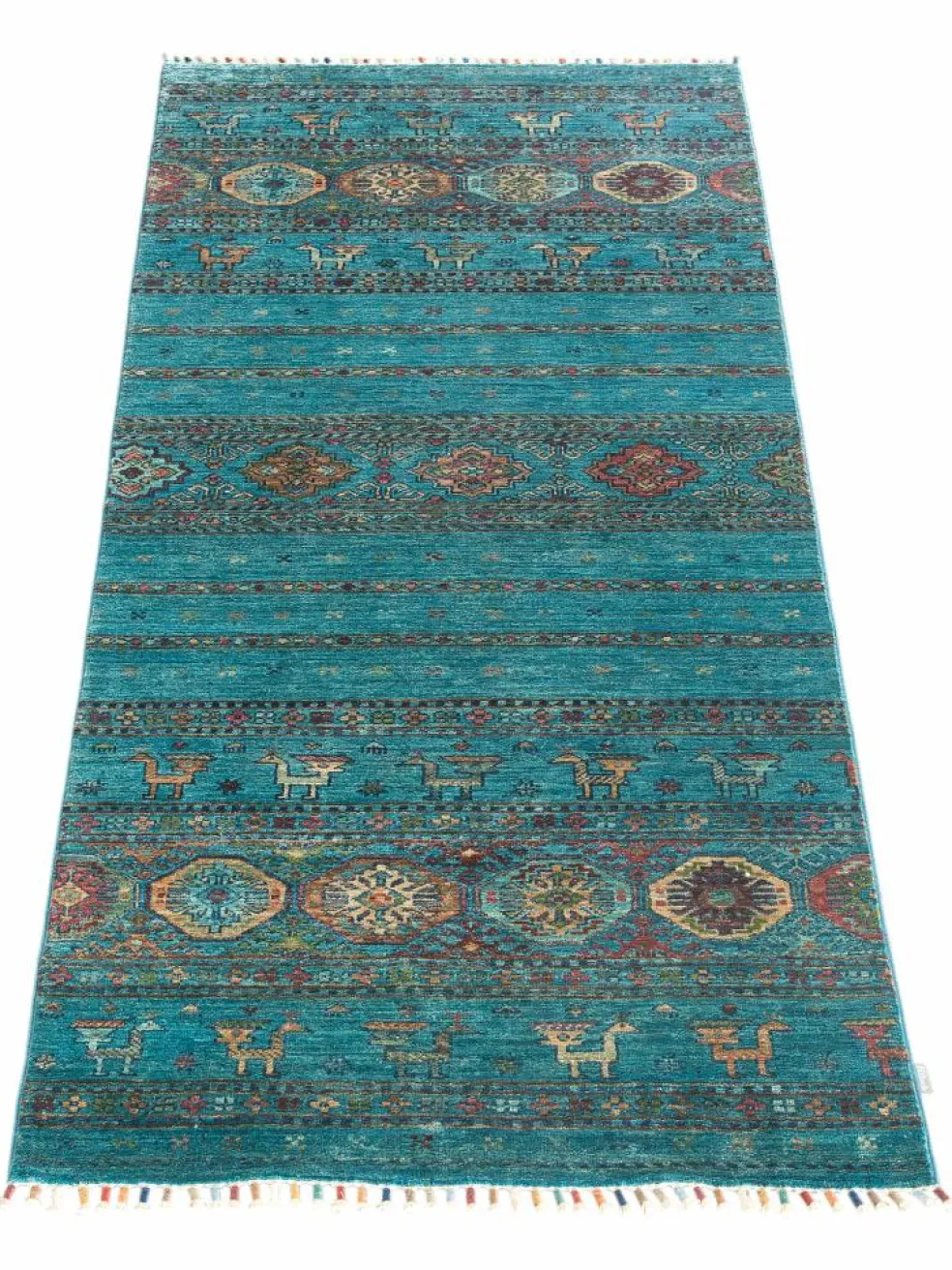 -Muster sind bunte Längsstreifen mit vielen verschiedenen Motiven gefüllt. Durch den flachen und festen Flor ist der Teppich unempfindlich gegenüber den Belastungen des Alltags.- Das Besondere an diesemOrientteppich