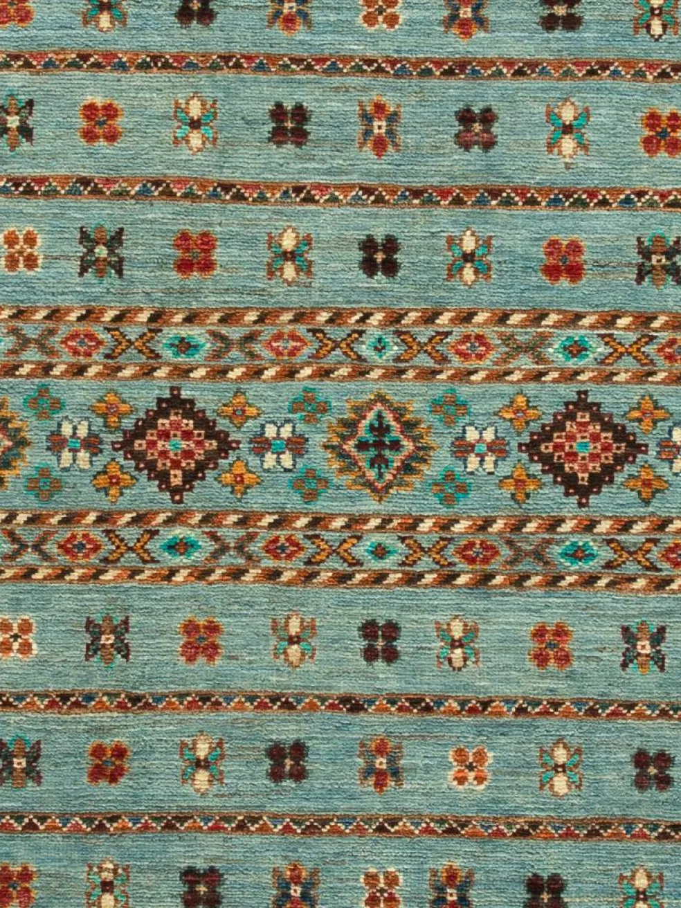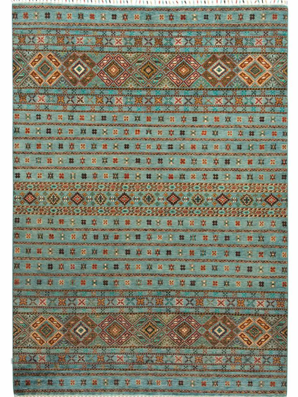 -Muster sind bunte Längsstreifen mit vielen verschiedenen Motiven gefüllt. Durch den flachen und festen Flor ist der Teppich unempfindlich gegenüber den Belastungen des Alltags.- Das Besondere an diesemOrientteppich