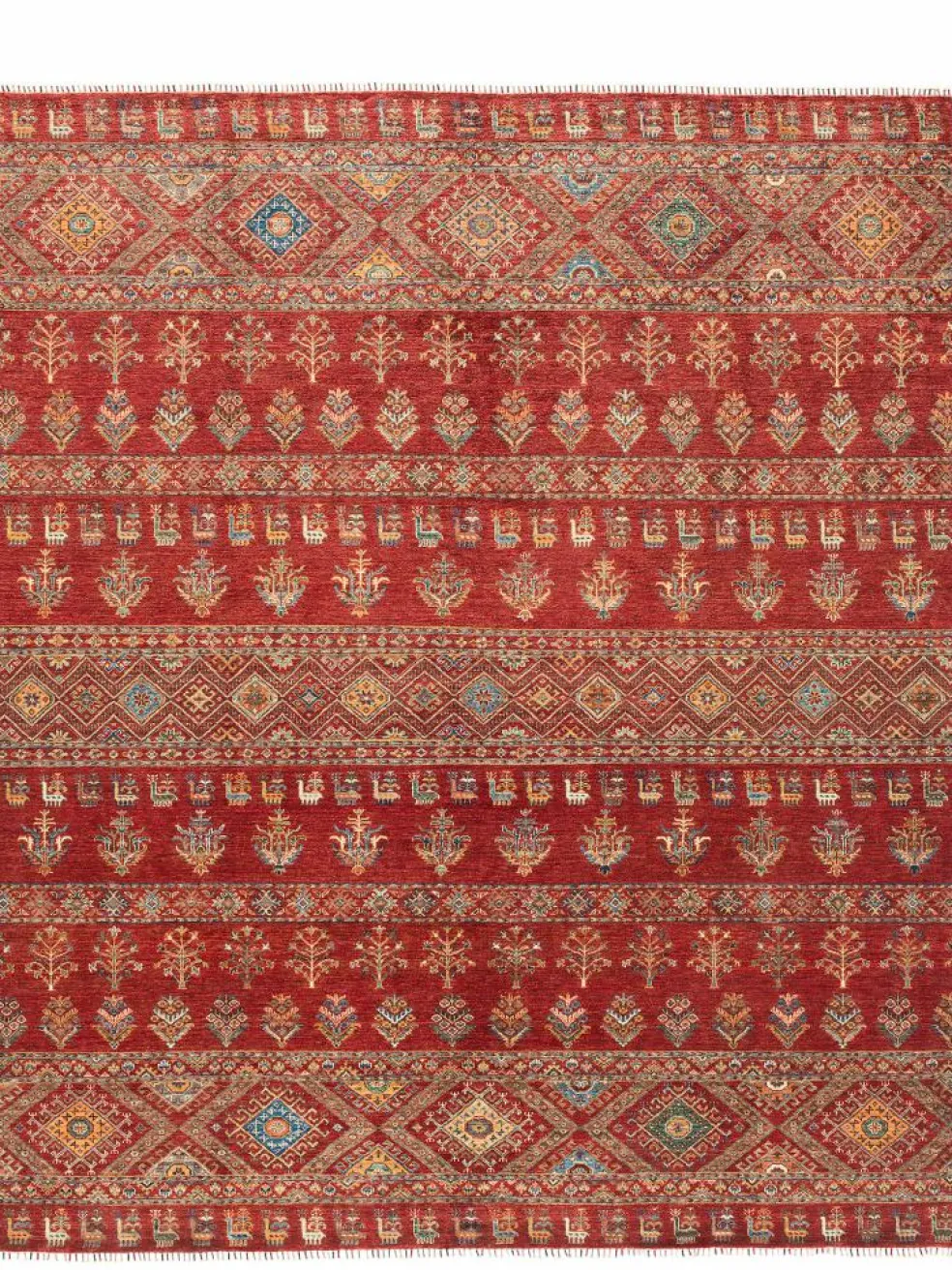 -Muster sind bunte Längsstreifen mit vielen verschiedenen Motiven gefüllt. Durch den flachen und festen Flor ist der Teppich unempfindlich gegenüber den Belastungen des Alltags.- Das Besondere an diesemOrientteppich