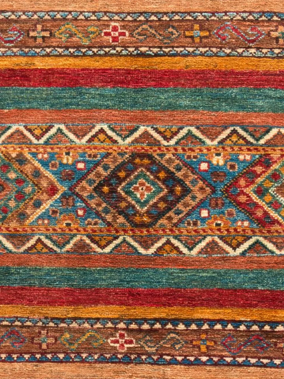-Muster sind bunte Längsstreifen mit vielen verschiedenen Motiven gefüllt. Durch den flachen und festen Flor ist der Teppich unempfindlich gegenüber den Belastungen des Alltags.- Das Besondere an diesemOrientteppich