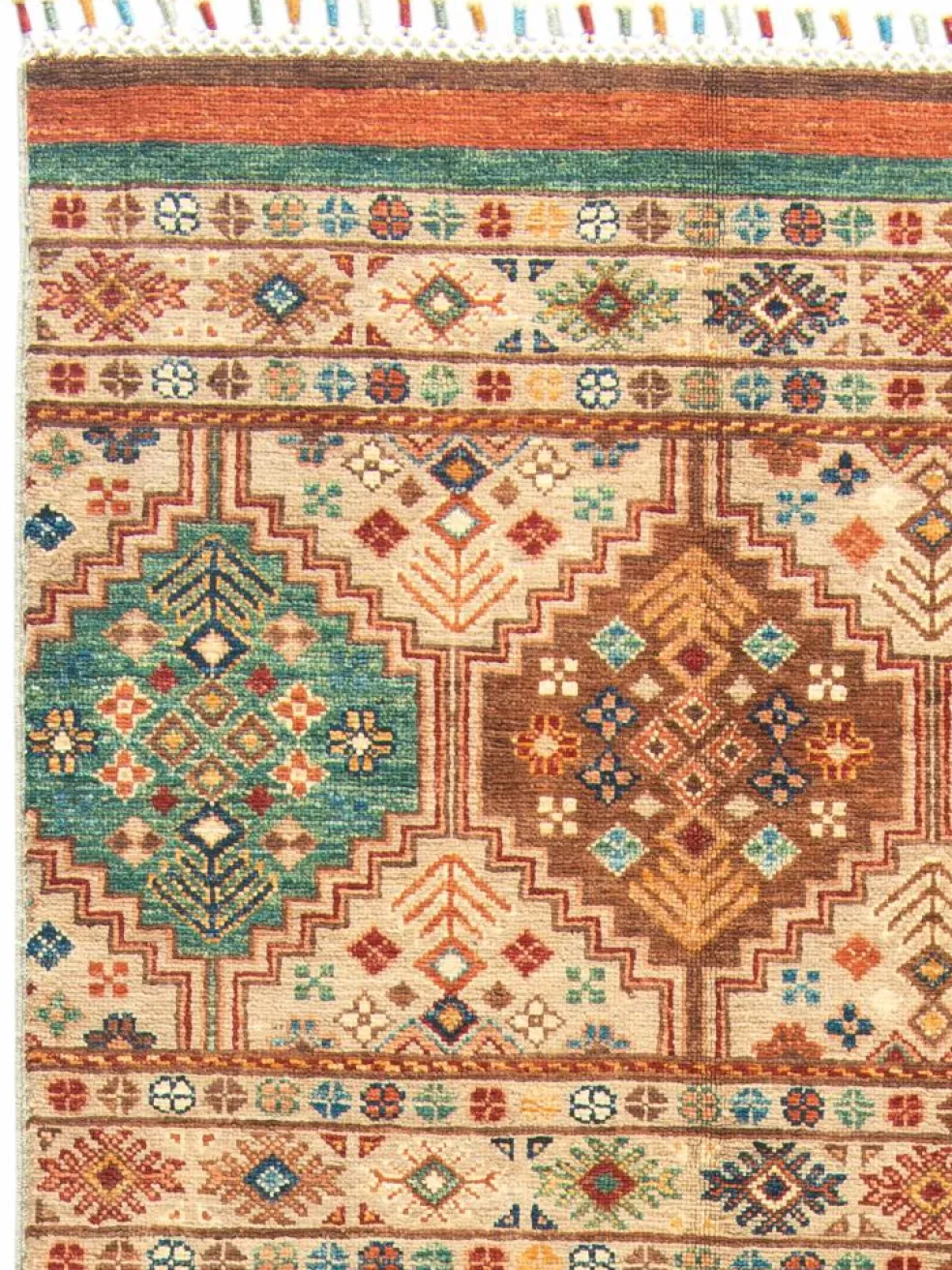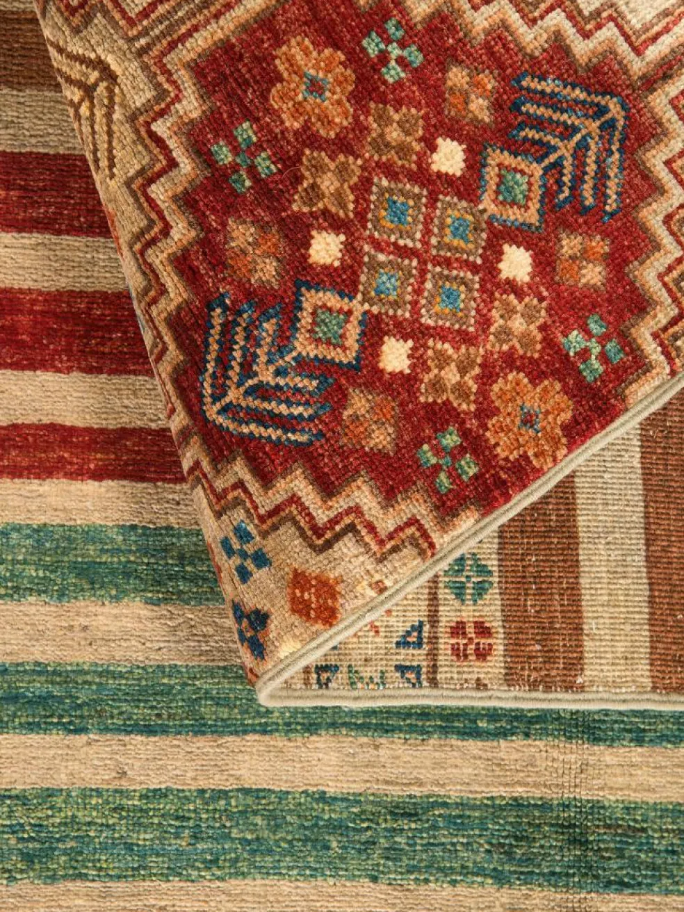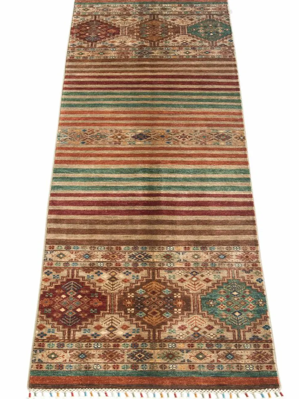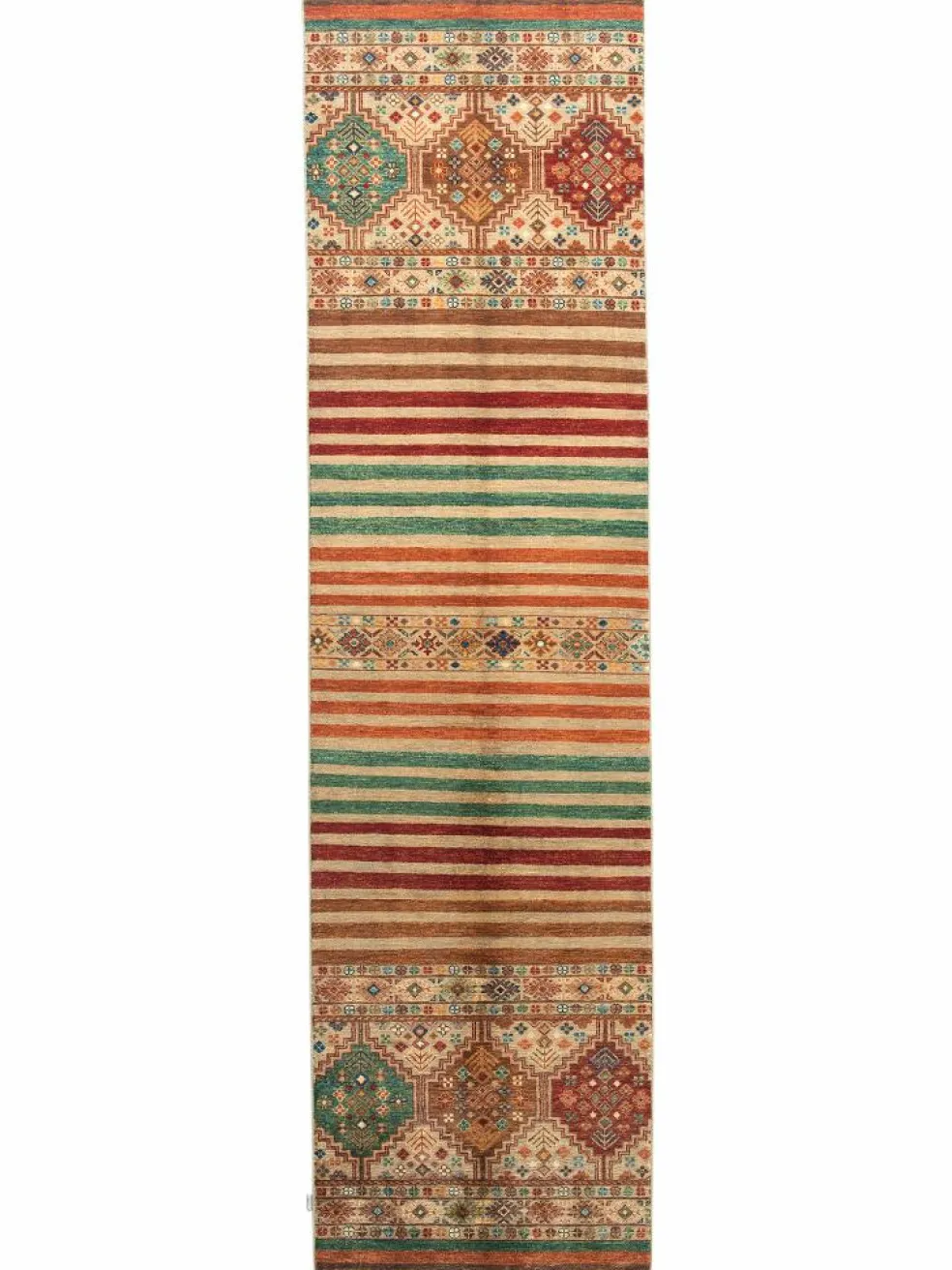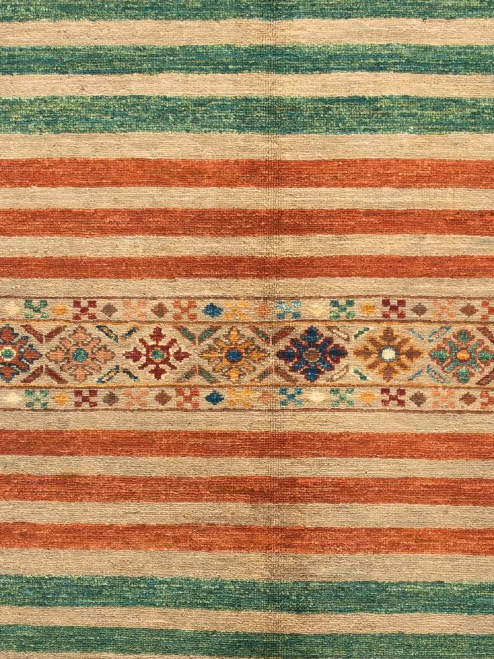 -Muster sind bunte Längsstreifen mit vielen verschiedenen Motiven gefüllt. Durch den flachen und festen Flor ist der Teppich unempfindlich gegenüber den Belastungen des Alltags.- Das Besondere an diesemOrientteppich