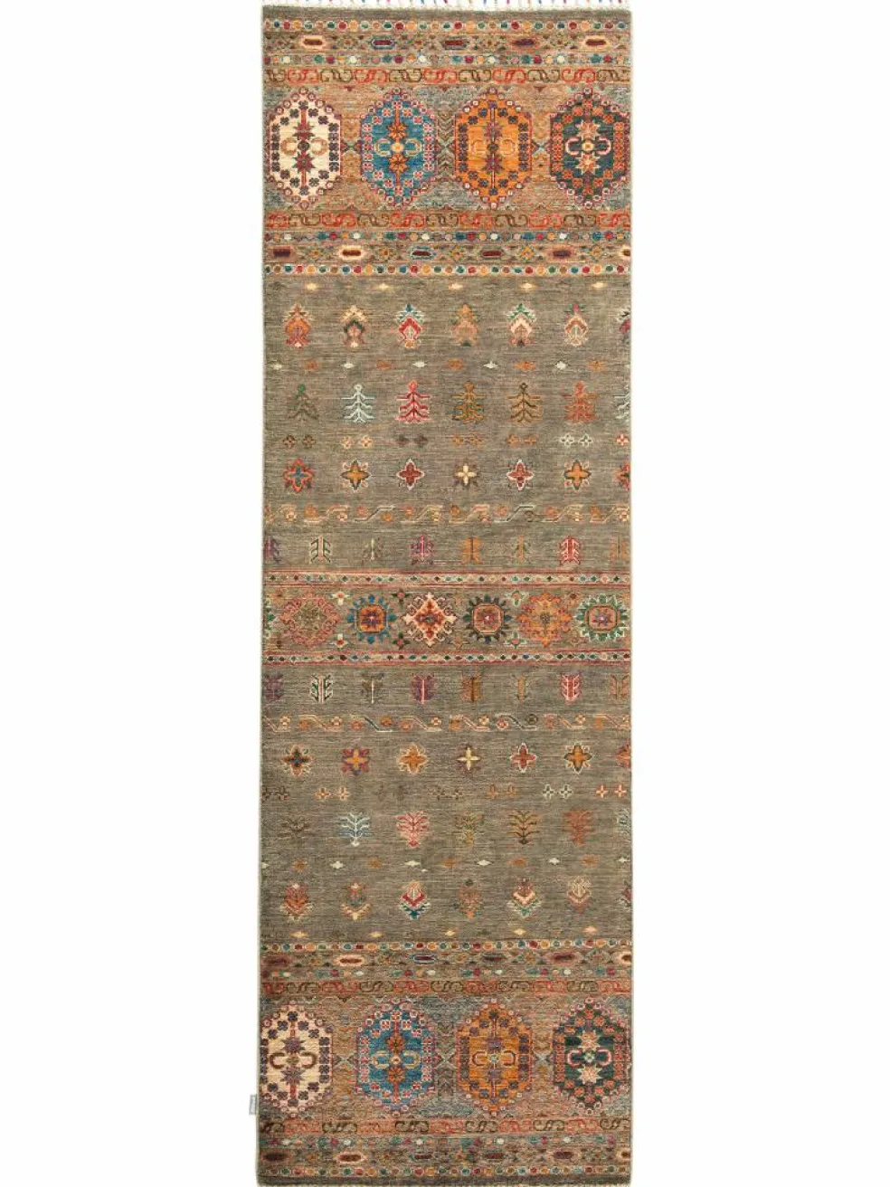 -Muster sind bunte Längsstreifen mit vielen verschiedenen Motiven gefüllt. Durch den flachen und festen Flor ist der Teppich unempfindlich gegenüber den Belastungen des Alltags.- Das Besondere an diesemOrientteppich