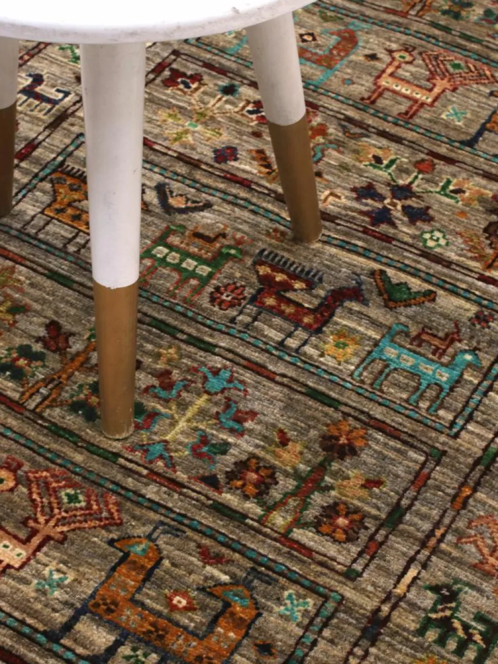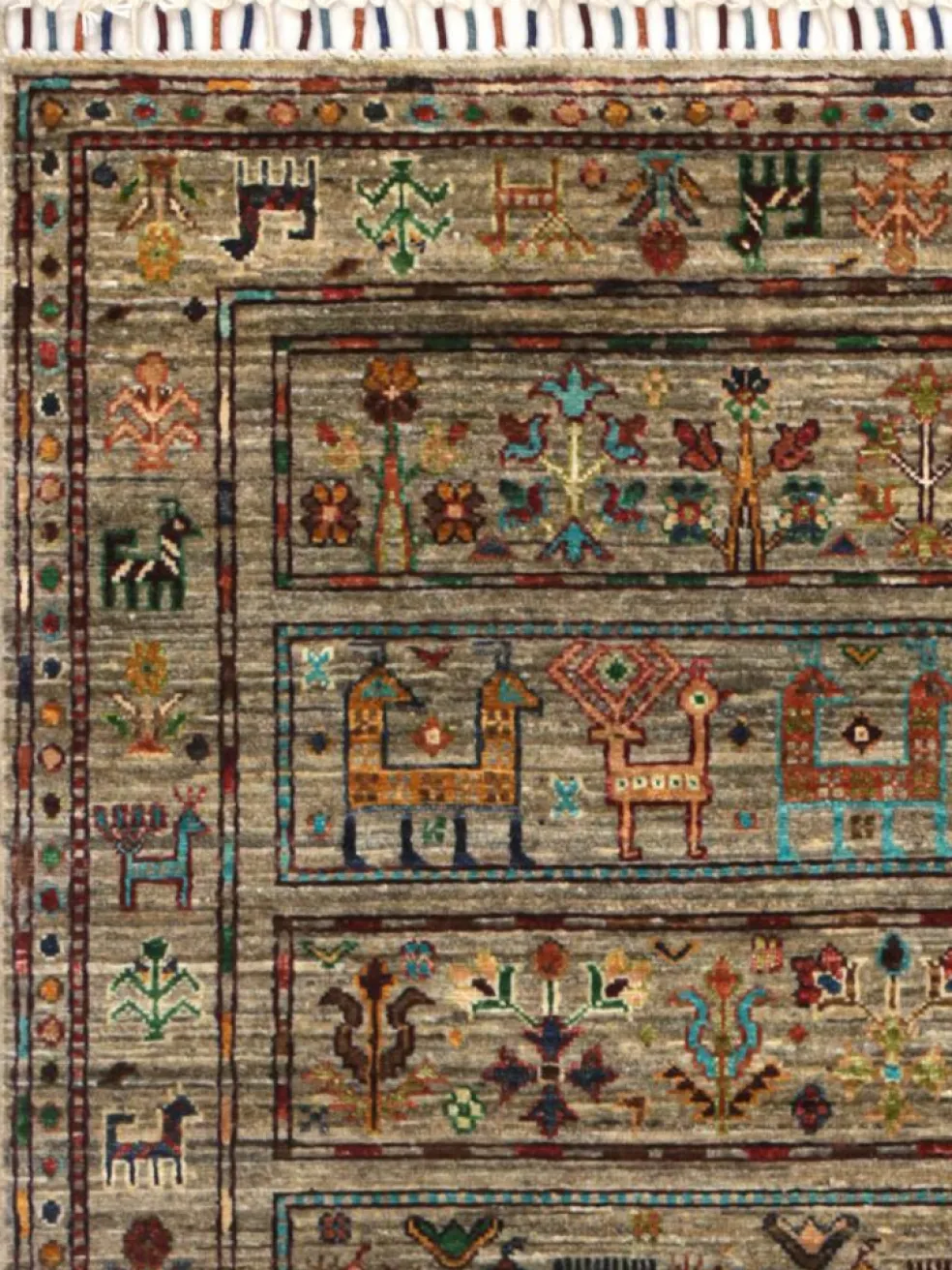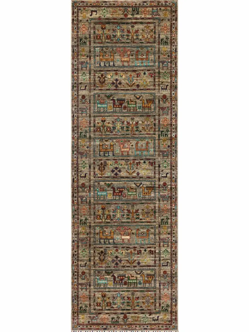 -Muster sind bunte Längsstreifen mit vielen verschiedenen Motiven gefüllt. Durch den flachen und festen Flor ist der Teppich unempfindlich gegenüber den Belastungen des Alltags. – Das Besondere an diesemOrientteppich