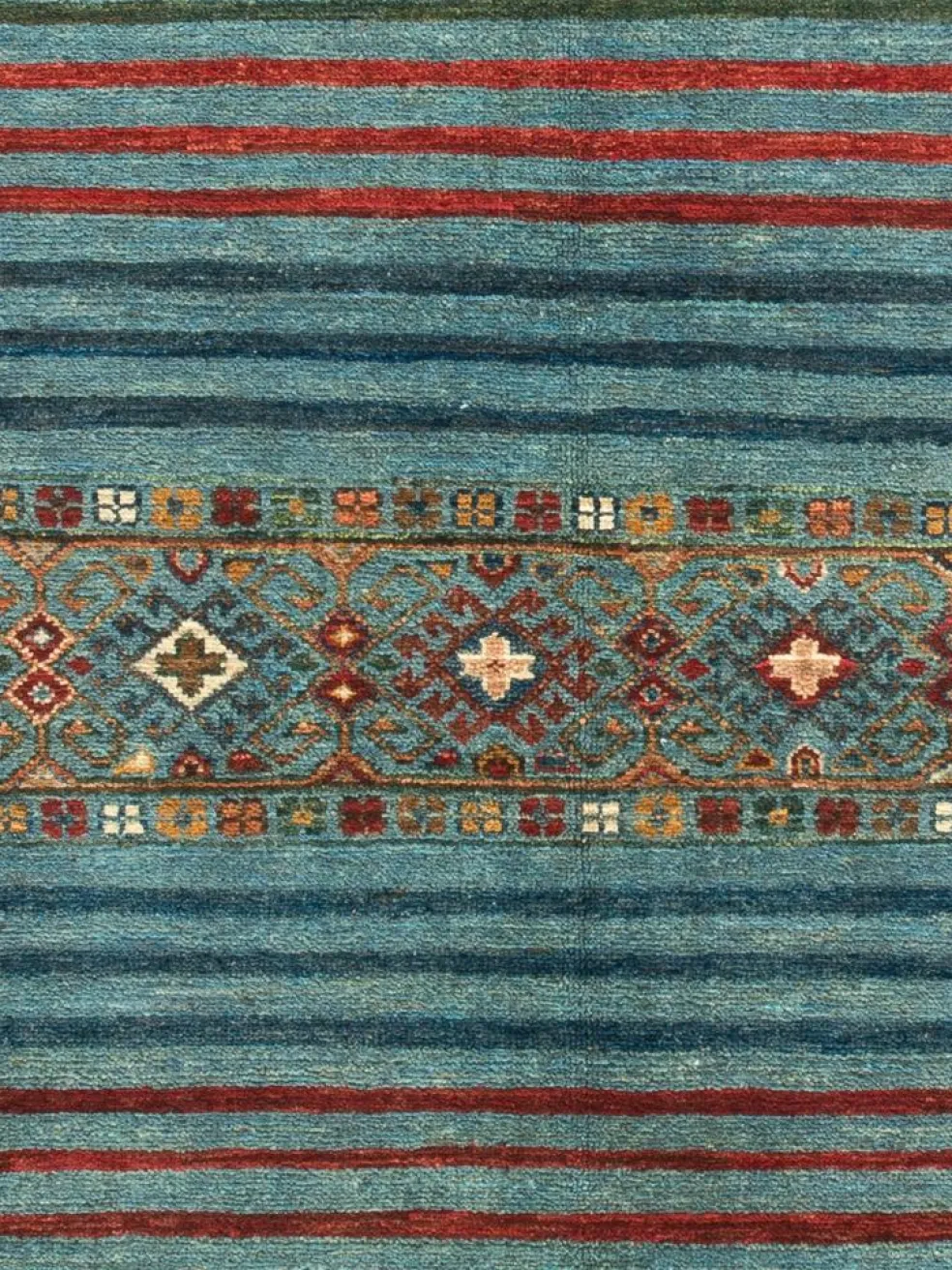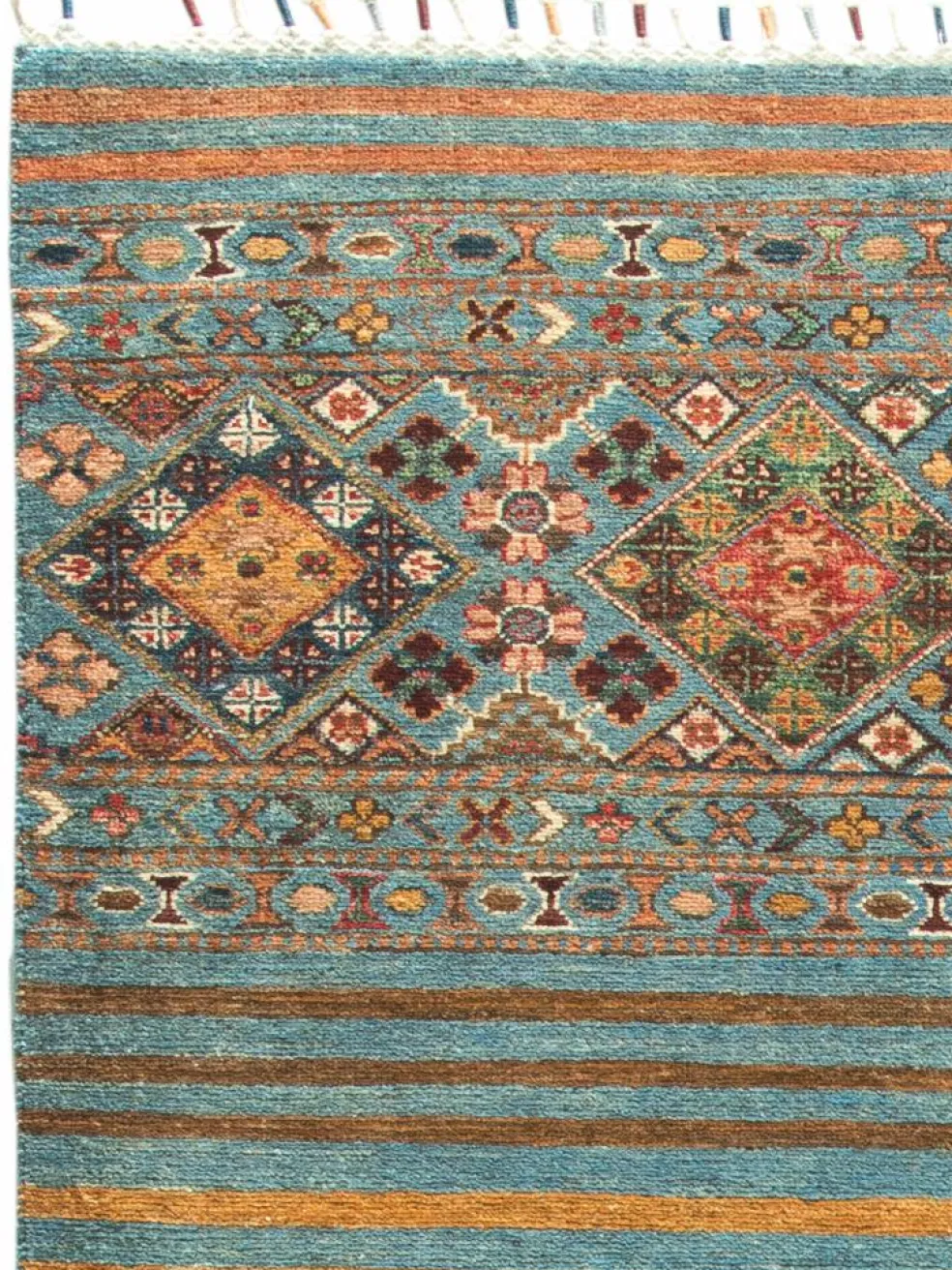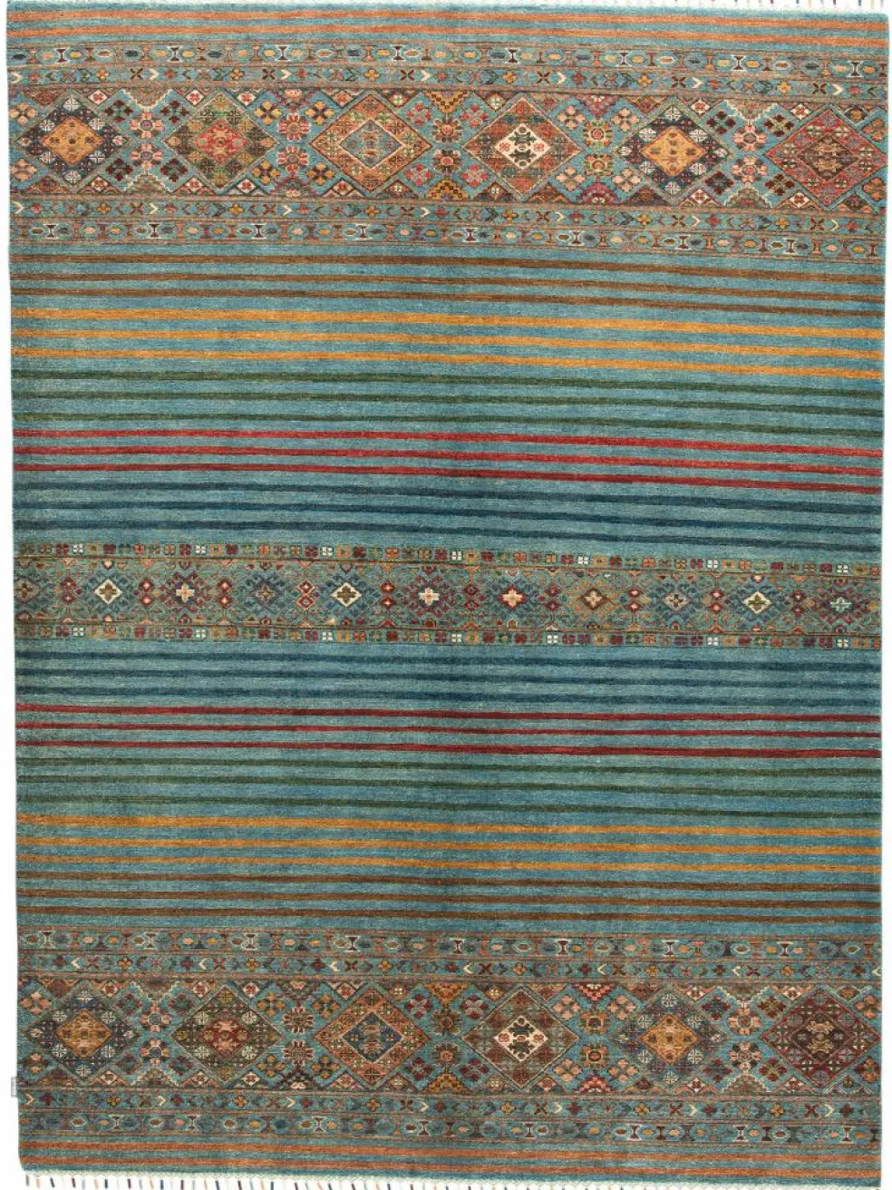 -Muster sind bunte Längsstreifen mit vielen verschiedenen Motiven gefüllt. Durch den flachen und festen Flor ist der Teppich unempfindlich gegenüber den Belastungen des Alltags.- Das Besondere an diesemOrientteppich