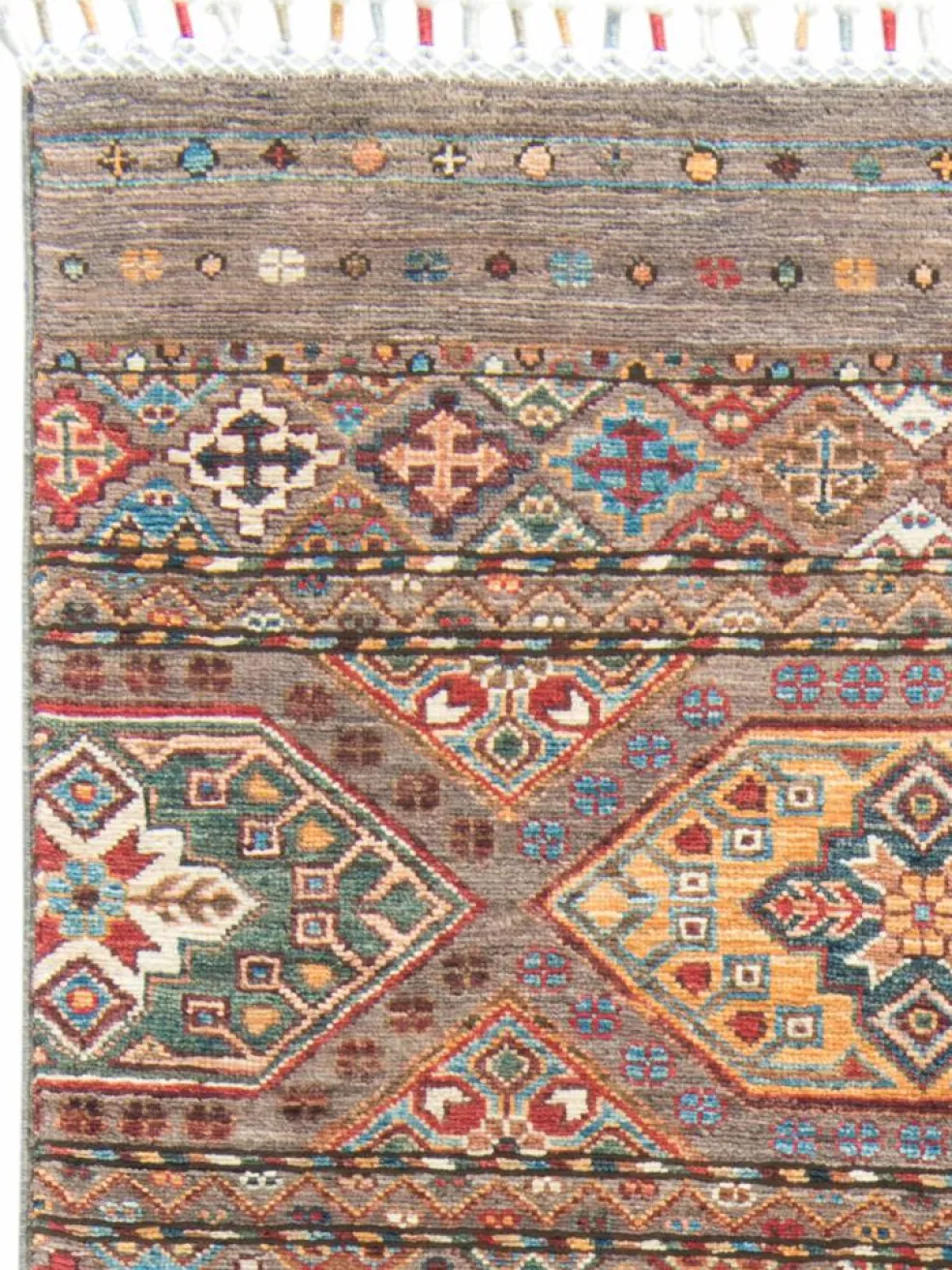 -Muster sind bunte Längsstreifen mit vielen verschiedenen Motiven gefüllt. Oft sind dieFransen