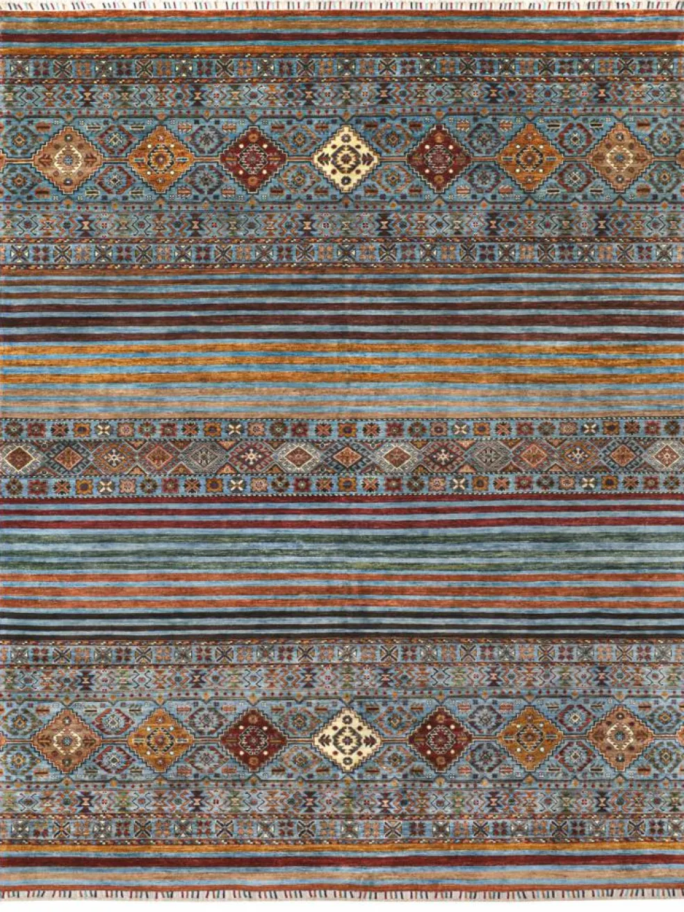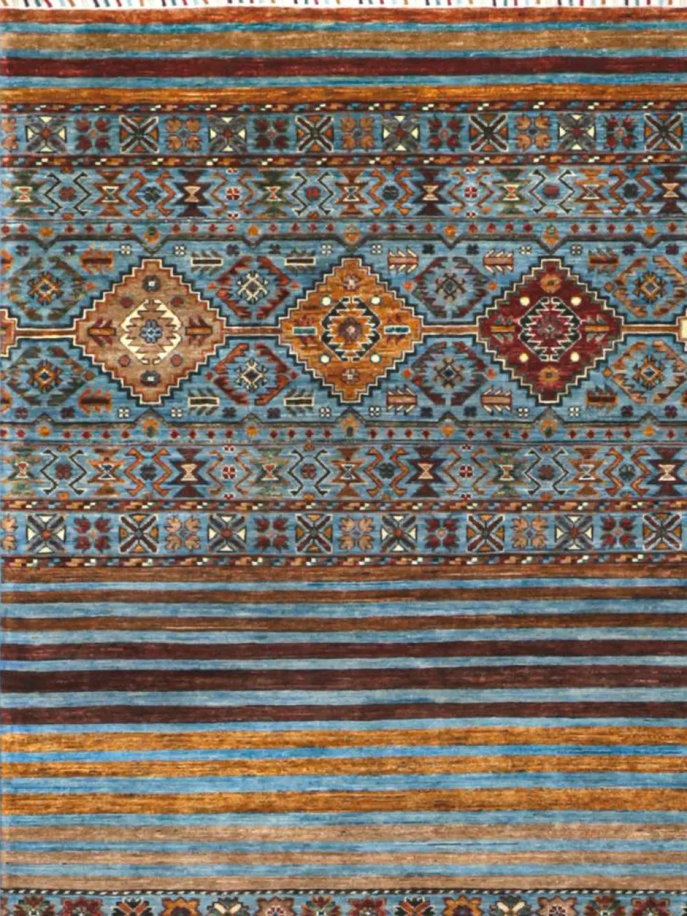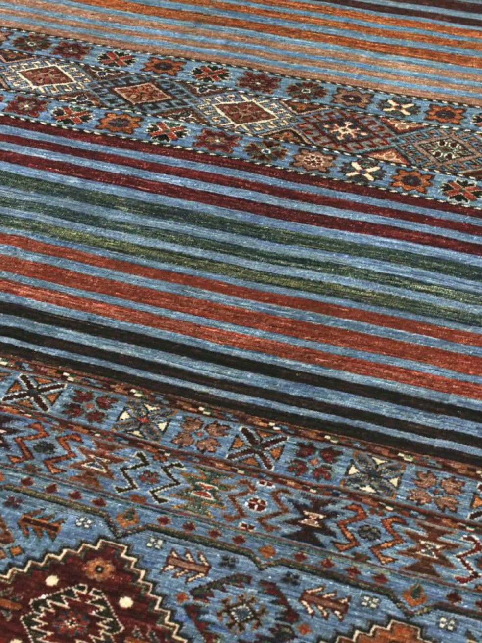 -Muster sind bunte Längsstreifen mit vielen verschiedenen Motiven gefüllt. Durch den flachen und festen Flor ist der Teppich unempfindlich gegenüber den Belastungen des Alltags. – Das Besondere an diesemOrientteppich