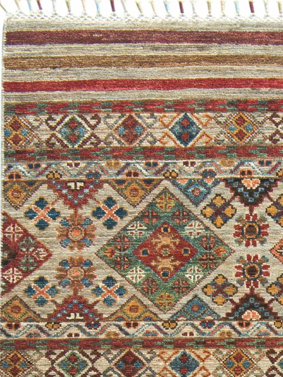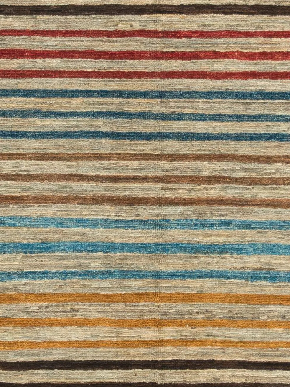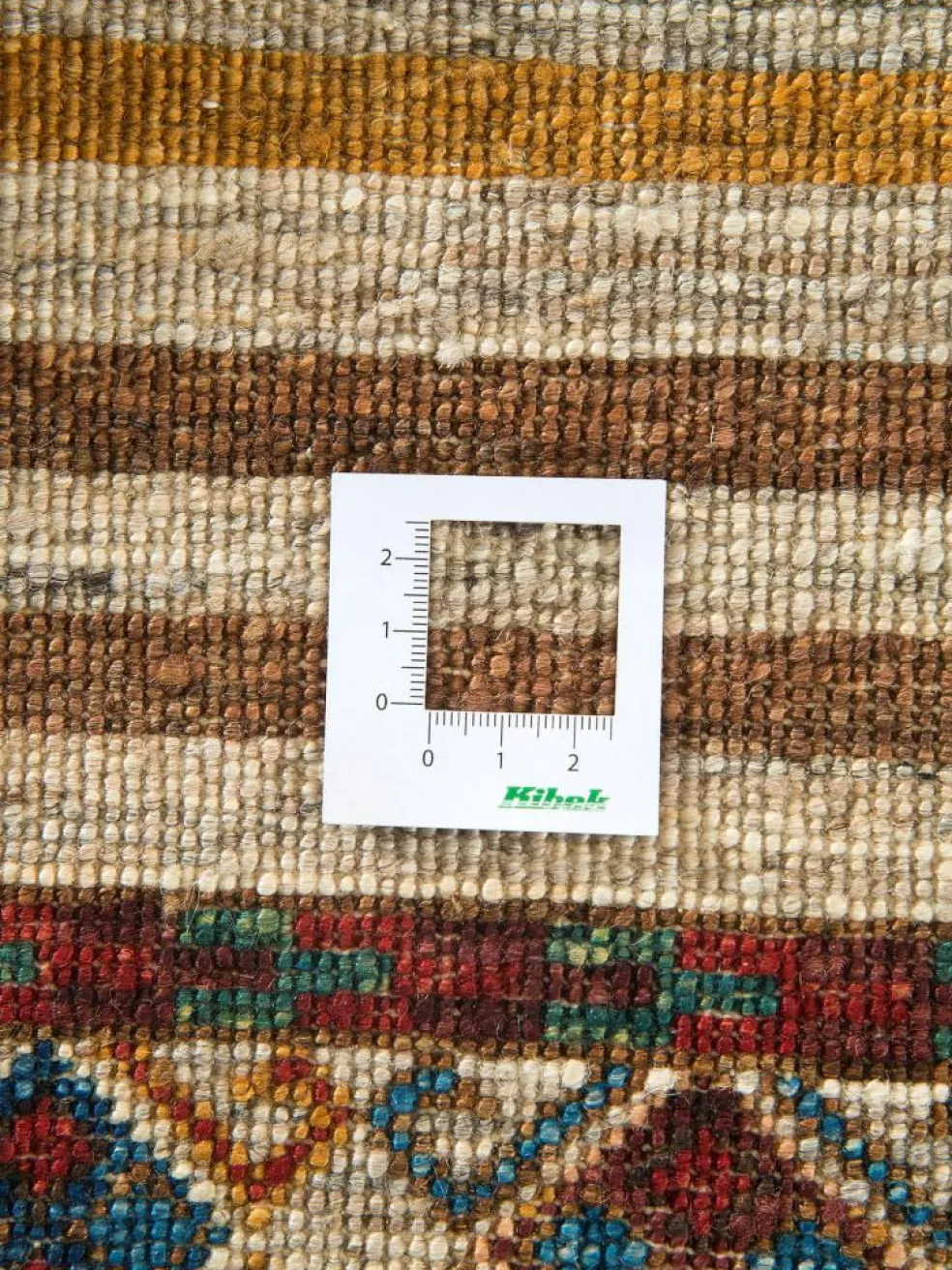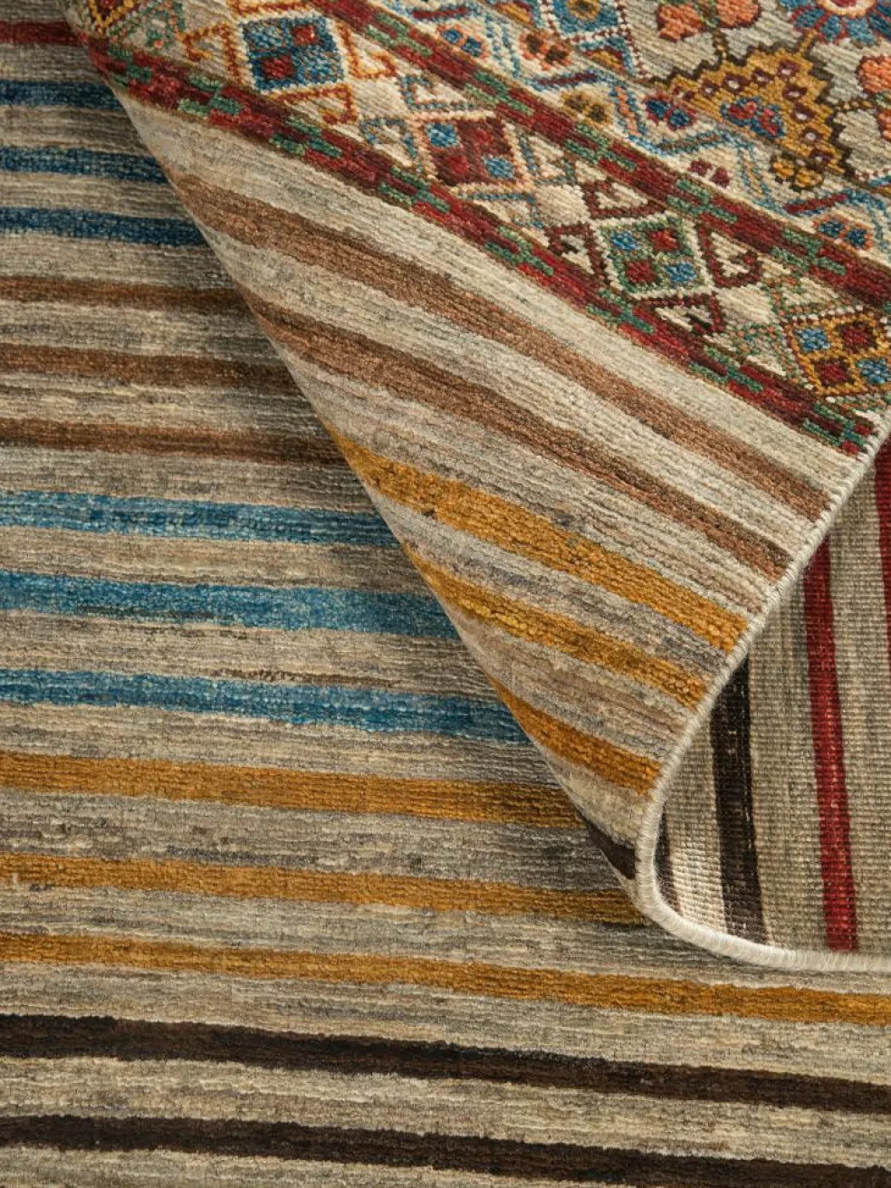 -Muster sind bunte Längsstreifen mit vielen verschiedenen Motiven gefüllt. Durch den flachen und festen Flor ist der Teppich unempfindlich gegenüber den Belastungen des Alltags.- Das Besondere an diesemOrientteppich