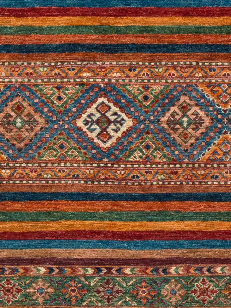 -Muster sind bunte Längsstreifen mit vielen verschiedenen Motiven gefüllt. Durch den flachen und festen Flor ist der Teppich unempfindlich gegenüber den Belastungen des Alltags.- Das Besondere an diesemOrientteppich
