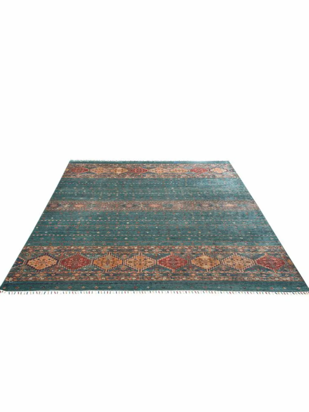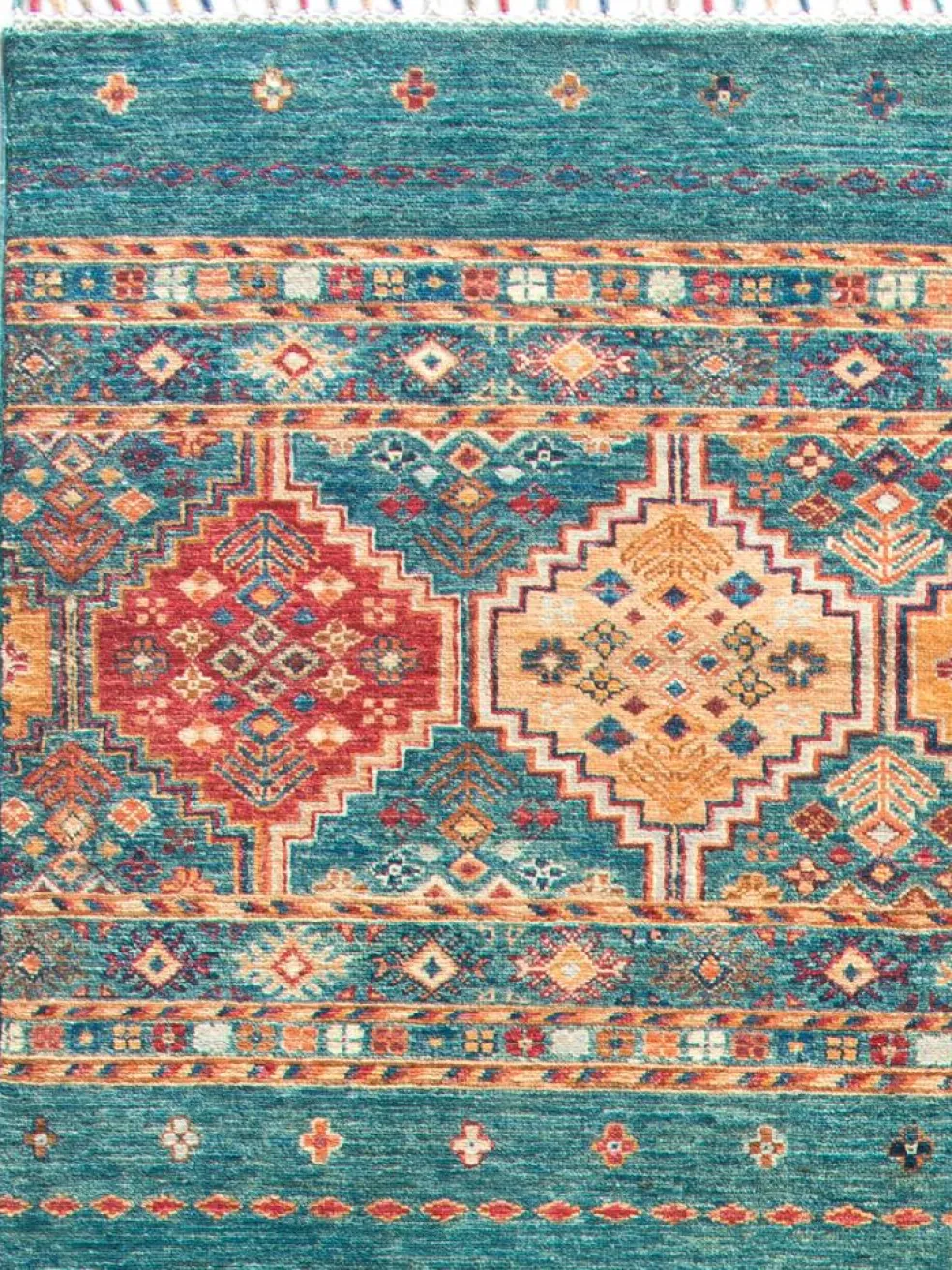 -Muster sind bunte Längsstreifen mit vielen verschiedenen Motiven gefüllt. Durch den flachen und festen Flor ist der Teppich unempfindlich gegenüber den Belastungen des Alltags.- Das Besondere an diesemOrientteppich