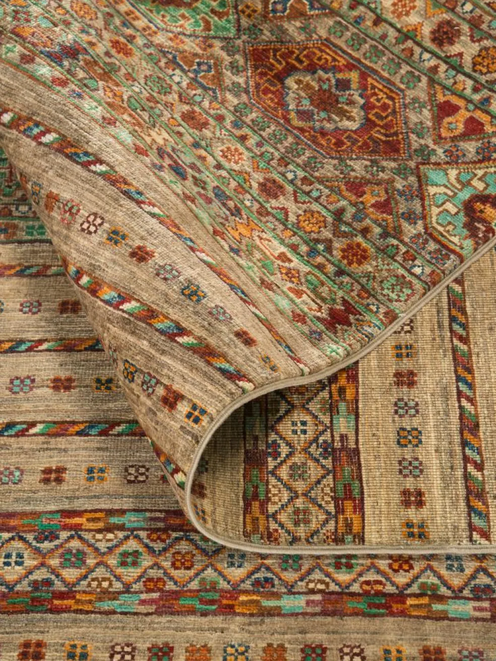 -Muster sind bunte Längsstreifen mit vielen verschiedenen Motiven gefüllt. Durch den flachen und festen Flor ist der Teppich unempfindlich gegenüber den Belastungen des Alltags.- Das Besondere an diesemOrientteppich