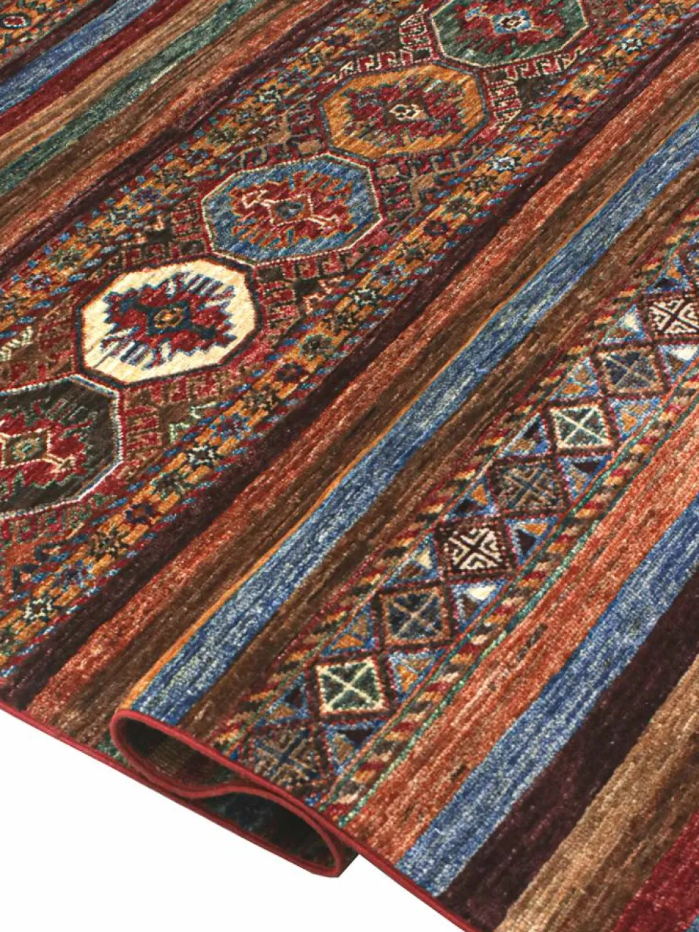 -Muster sind bunte Längsstreifen mit vielen verschiedenen Motiven gefüllt. Durch den flachen und festen Flor ist der Teppich unempfindlich gegenüber den Belastungen des Alltags. – Das Besondere an diesemOrientteppich