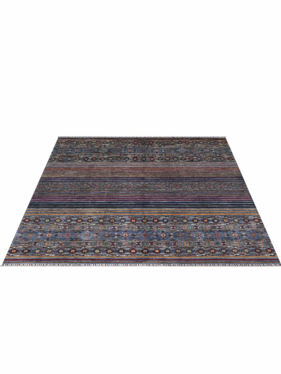 -Muster sind bunte Längsstreifen mit vielen verschiedenen Motiven gefüllt. Durch den flachen und festen Flor ist der Teppich unempfindlich gegenüber den Belastungen des Alltags. – Das Besondere an diesemOrientteppich