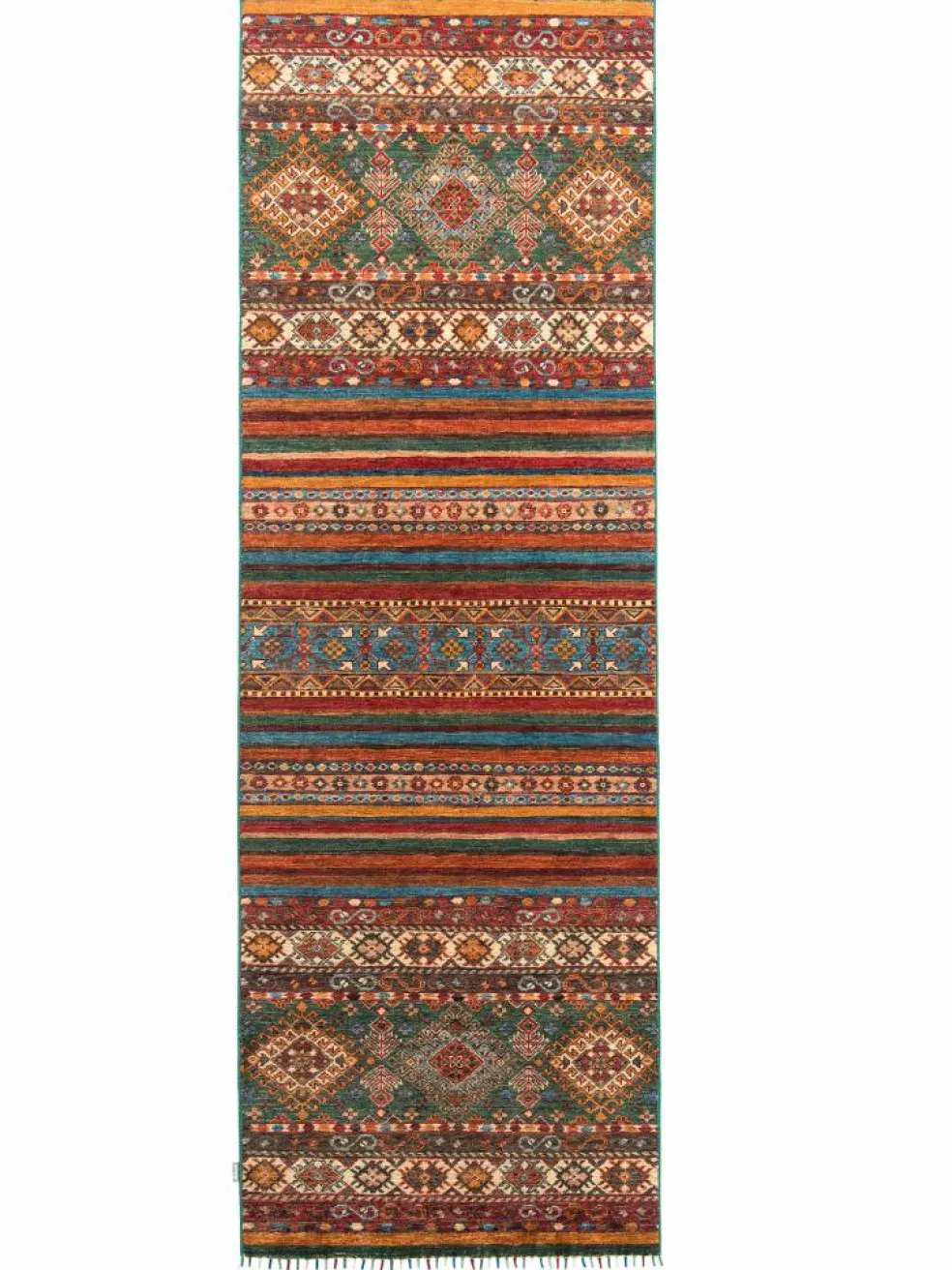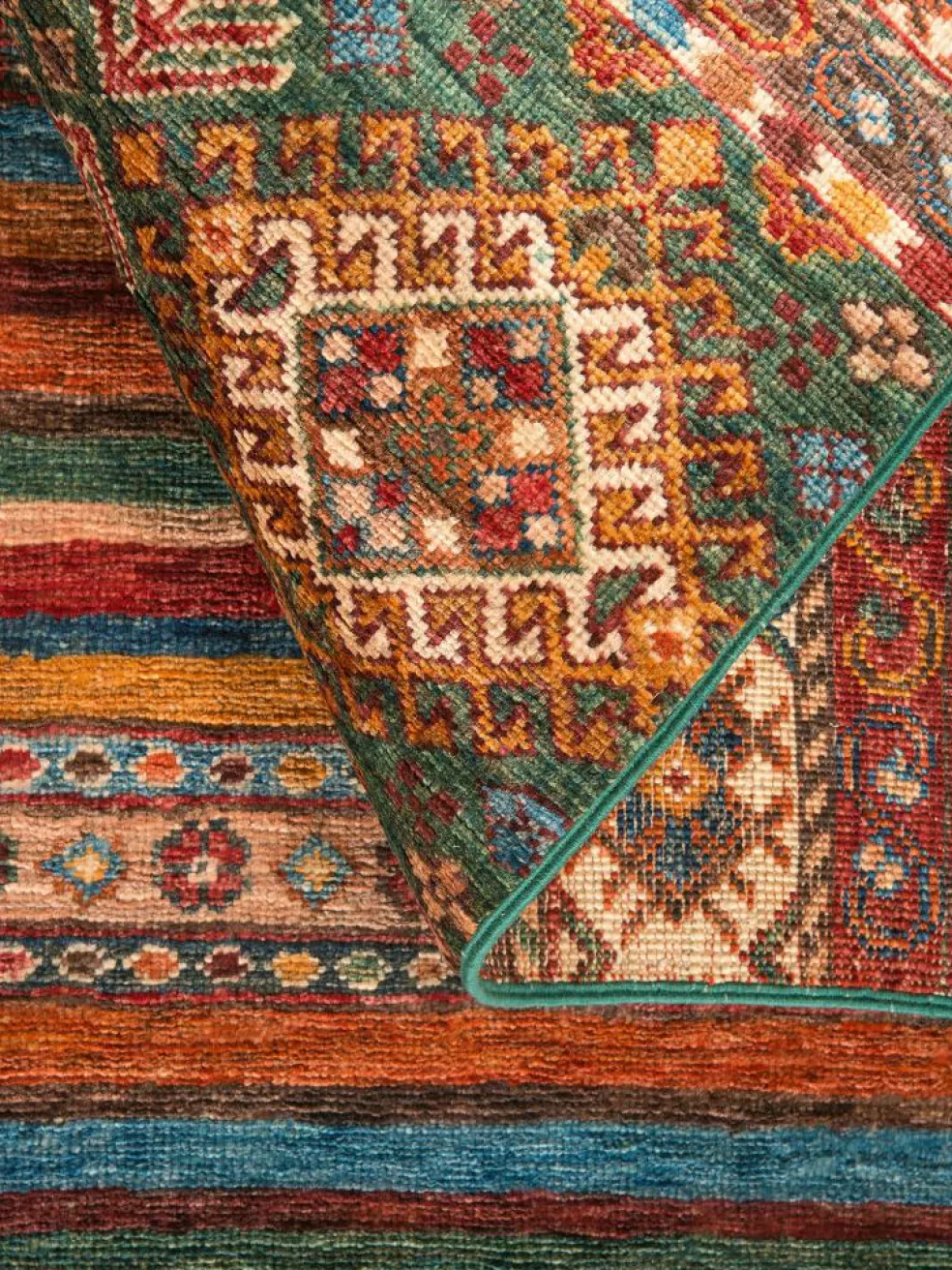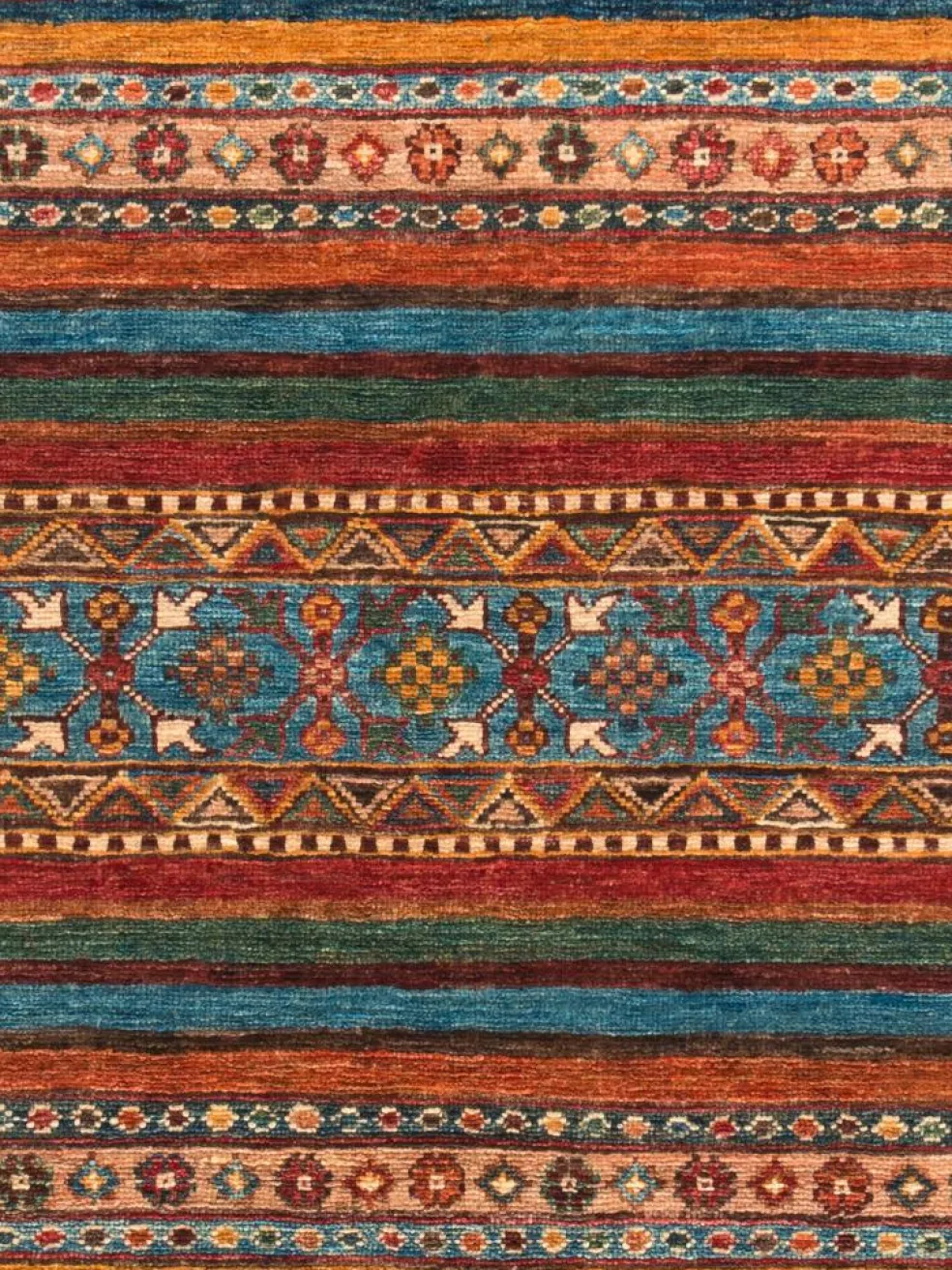 -Muster sind bunte Längsstreifen mit vielen verschiedenen Motiven gefüllt. Durch den flachen und festen Flor ist der Teppich unempfindlich gegenüber den Belastungen des Alltags.- Das Besondere an diesemOrientteppich
