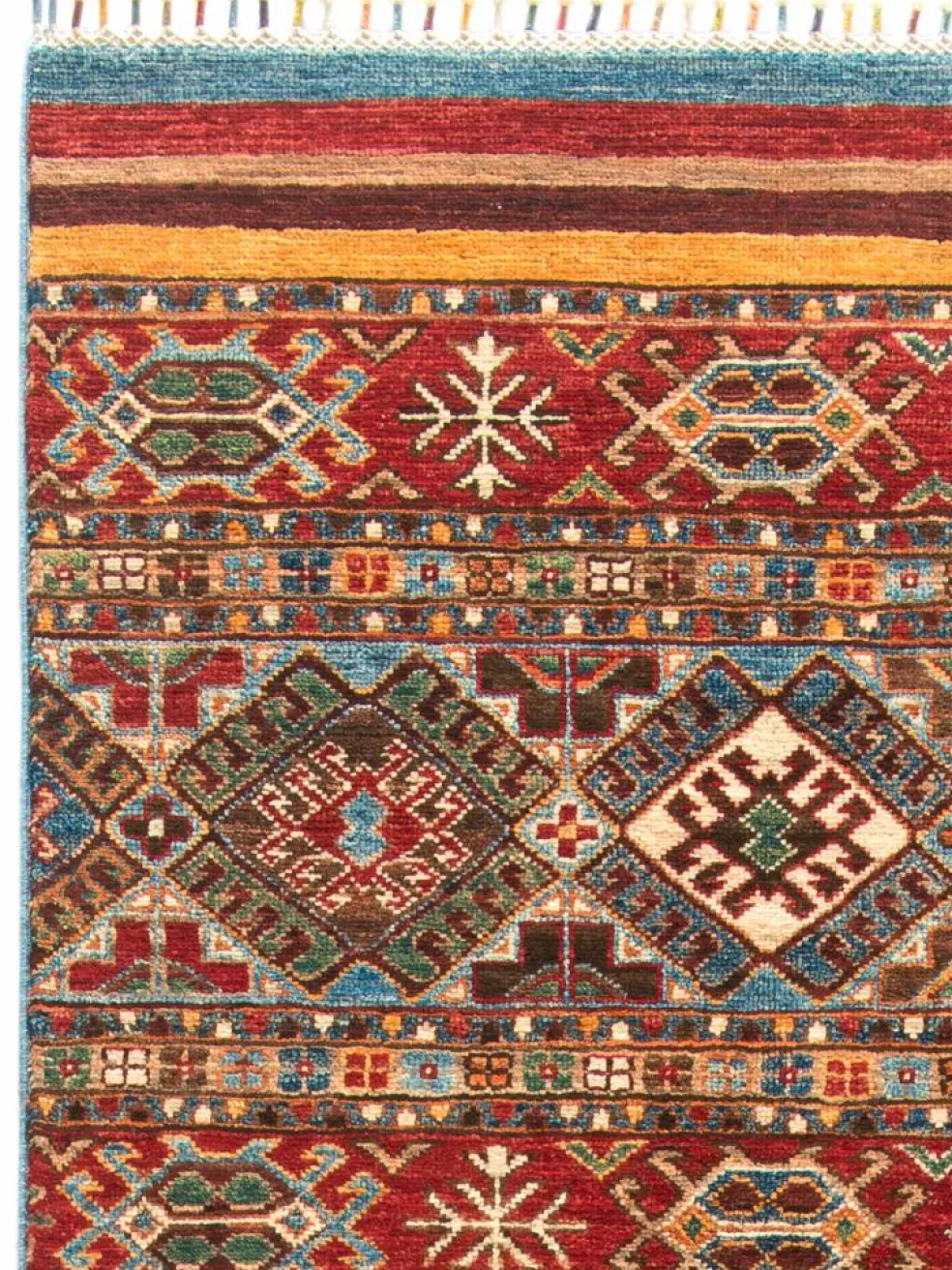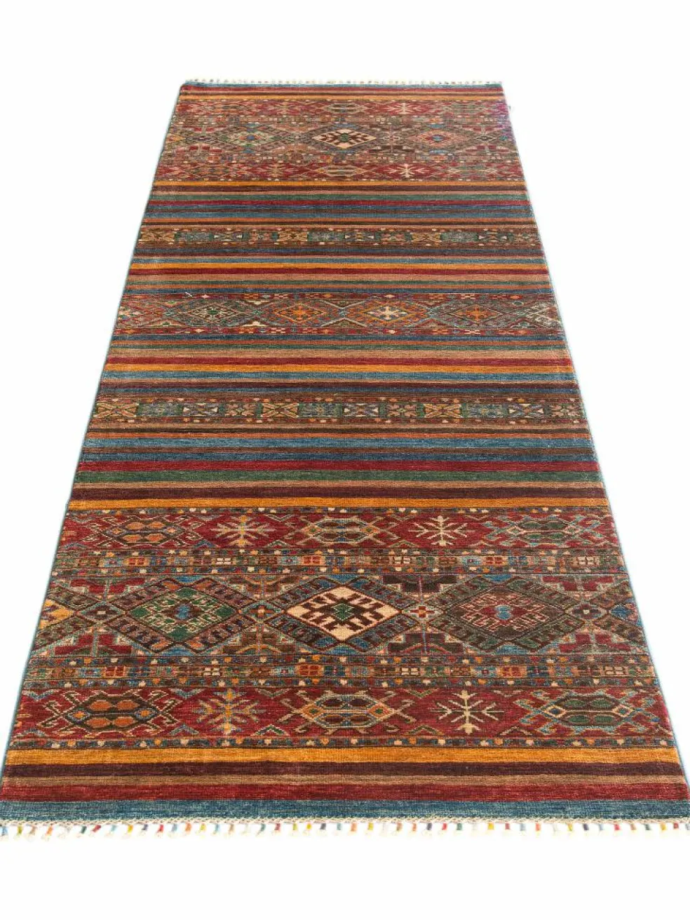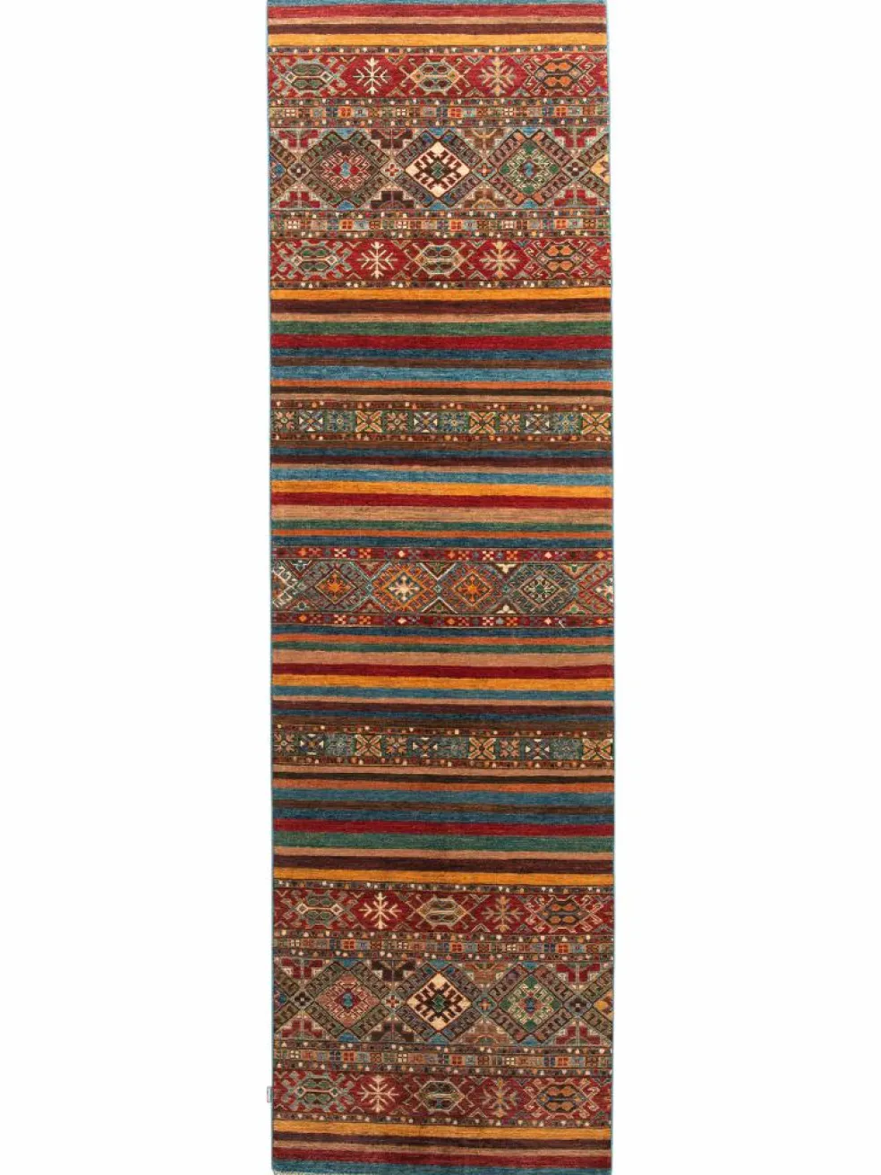 -Muster sind bunte Längsstreifen mit vielen verschiedenen Motiven gefüllt. Durch den flachen und festen Flor ist der Teppich unempfindlich gegenüber den Belastungen des Alltags.- Das Besondere an diesemOrientteppich