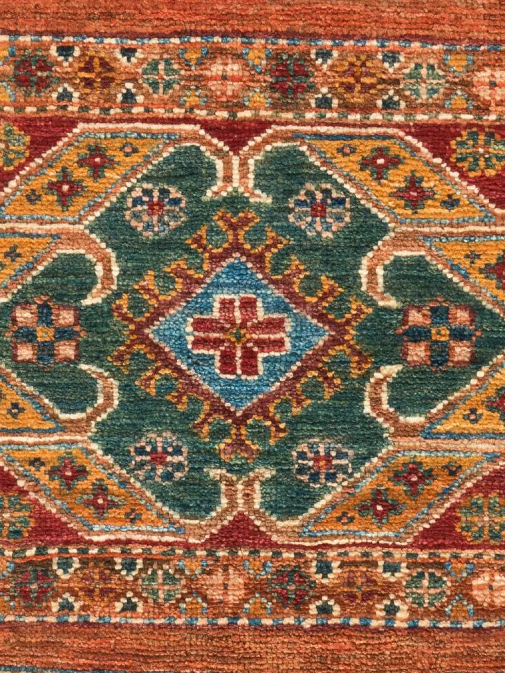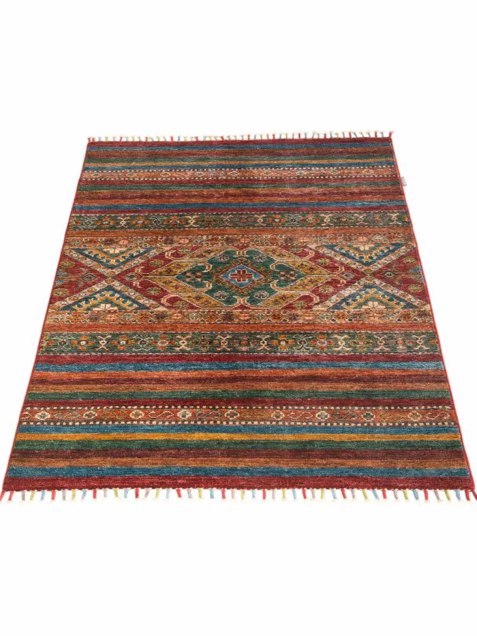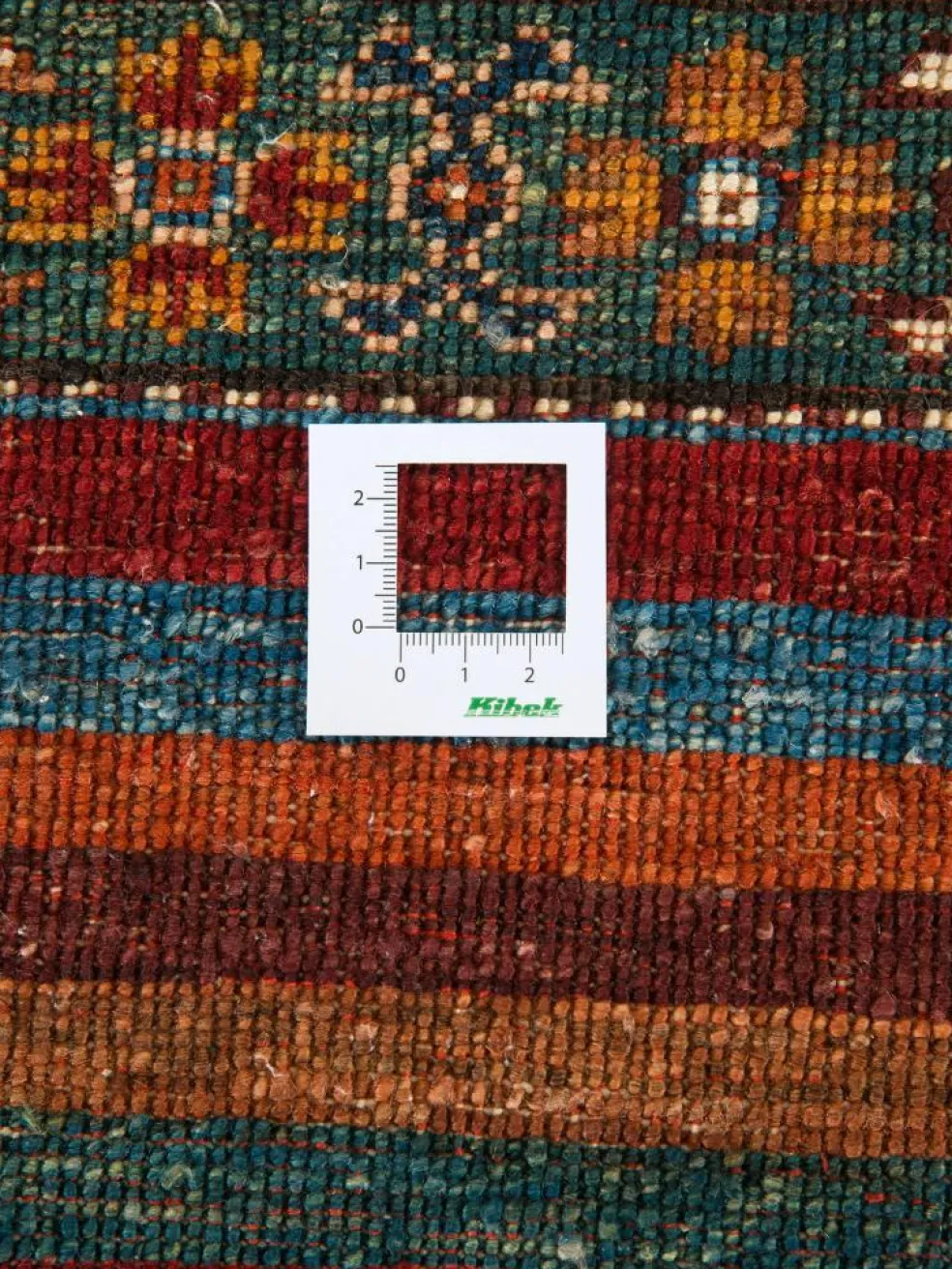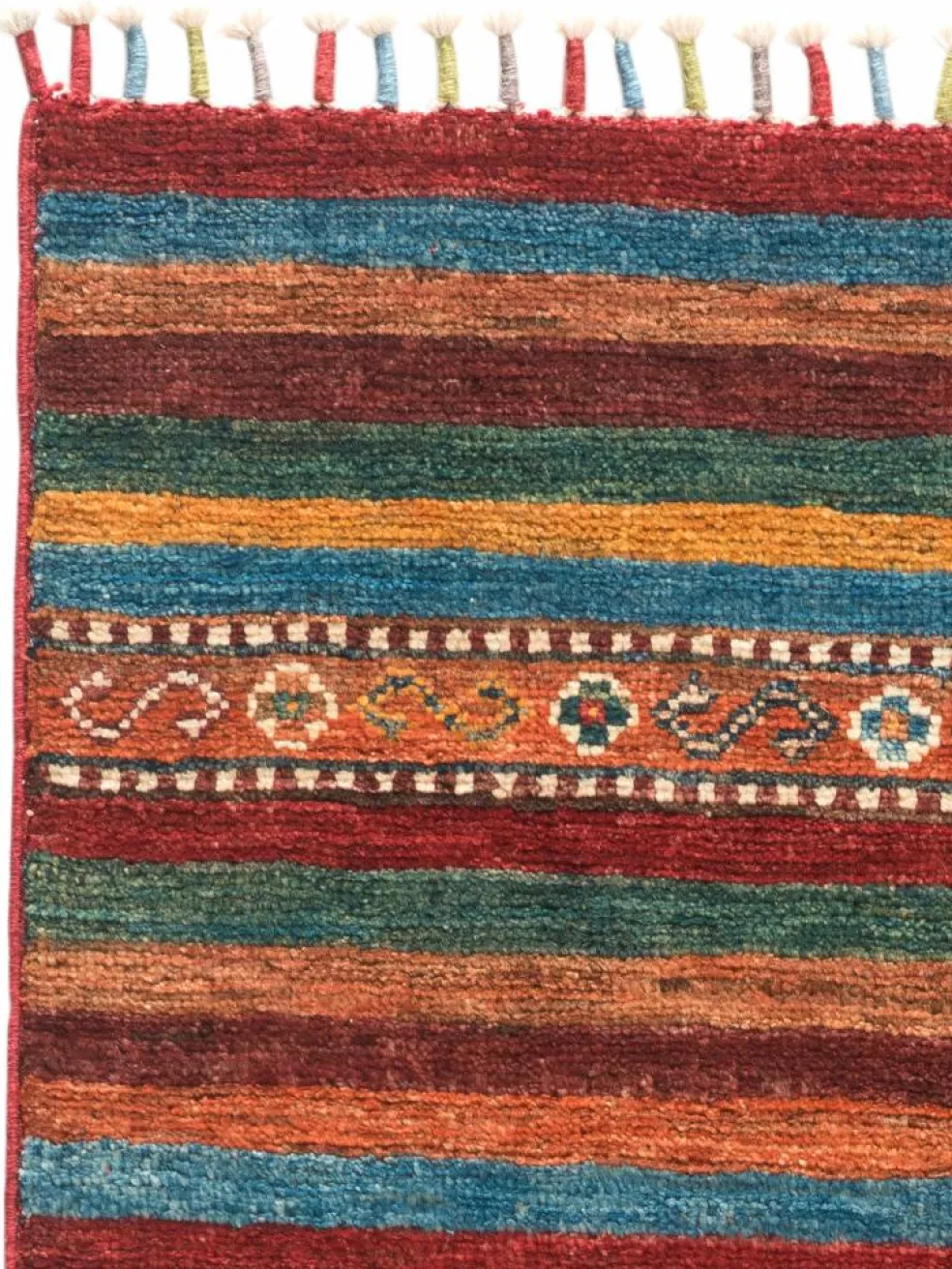 -Muster sind bunte Längsstreifen mit vielen verschiedenen Motiven gefüllt. Durch den flachen und festen Flor ist der Teppich unempfindlich gegenüber den Belastungen des Alltags.- Das Besondere an diesemOrientteppich