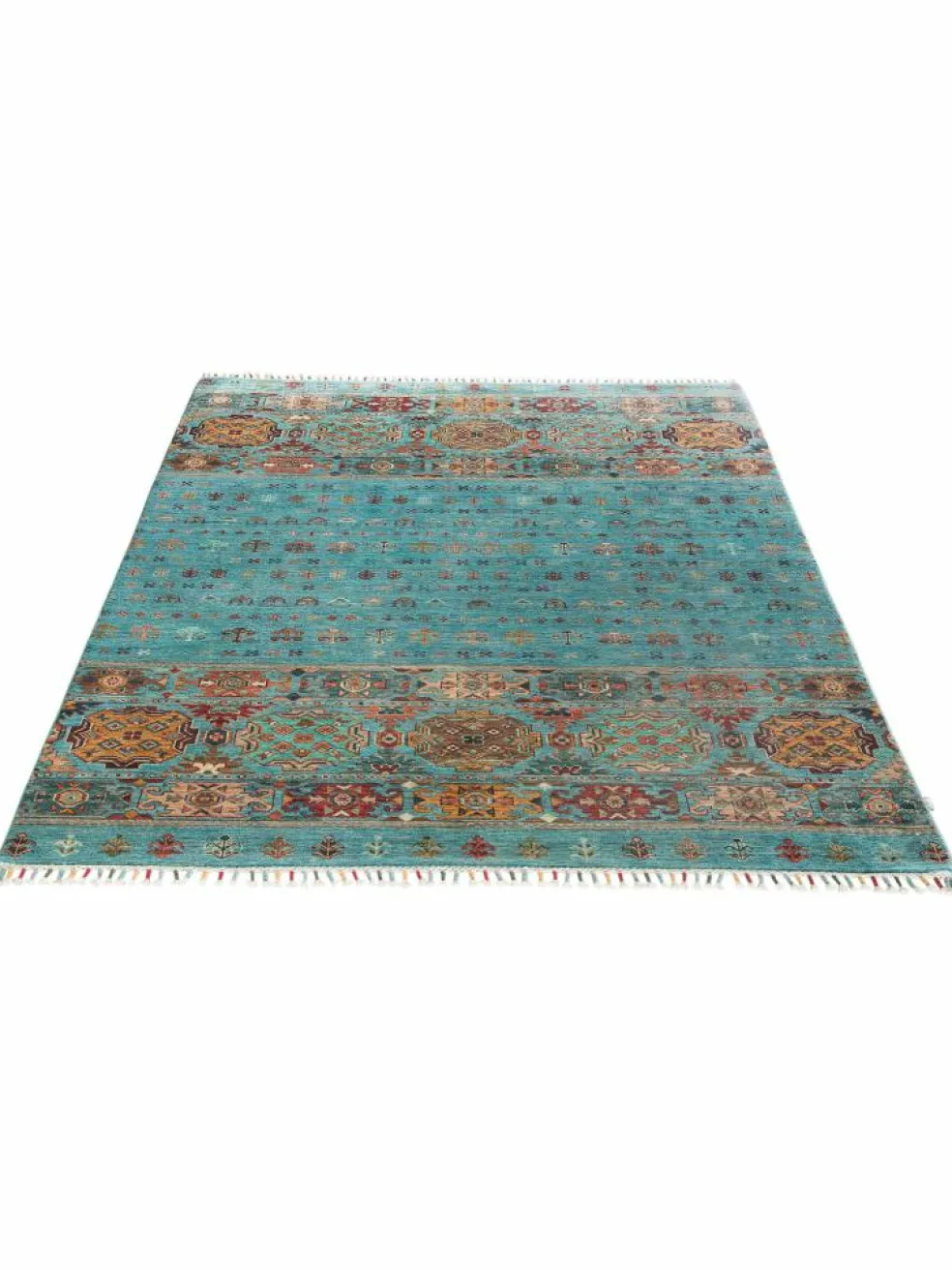 mit bunten Fäden zusammen gebunden. Durch den flachen und festen Flor ist der Teppich unempfindlich gegenüber den Belastungen des Alltags.| Gesamthöhe: | ca. 6 mm |