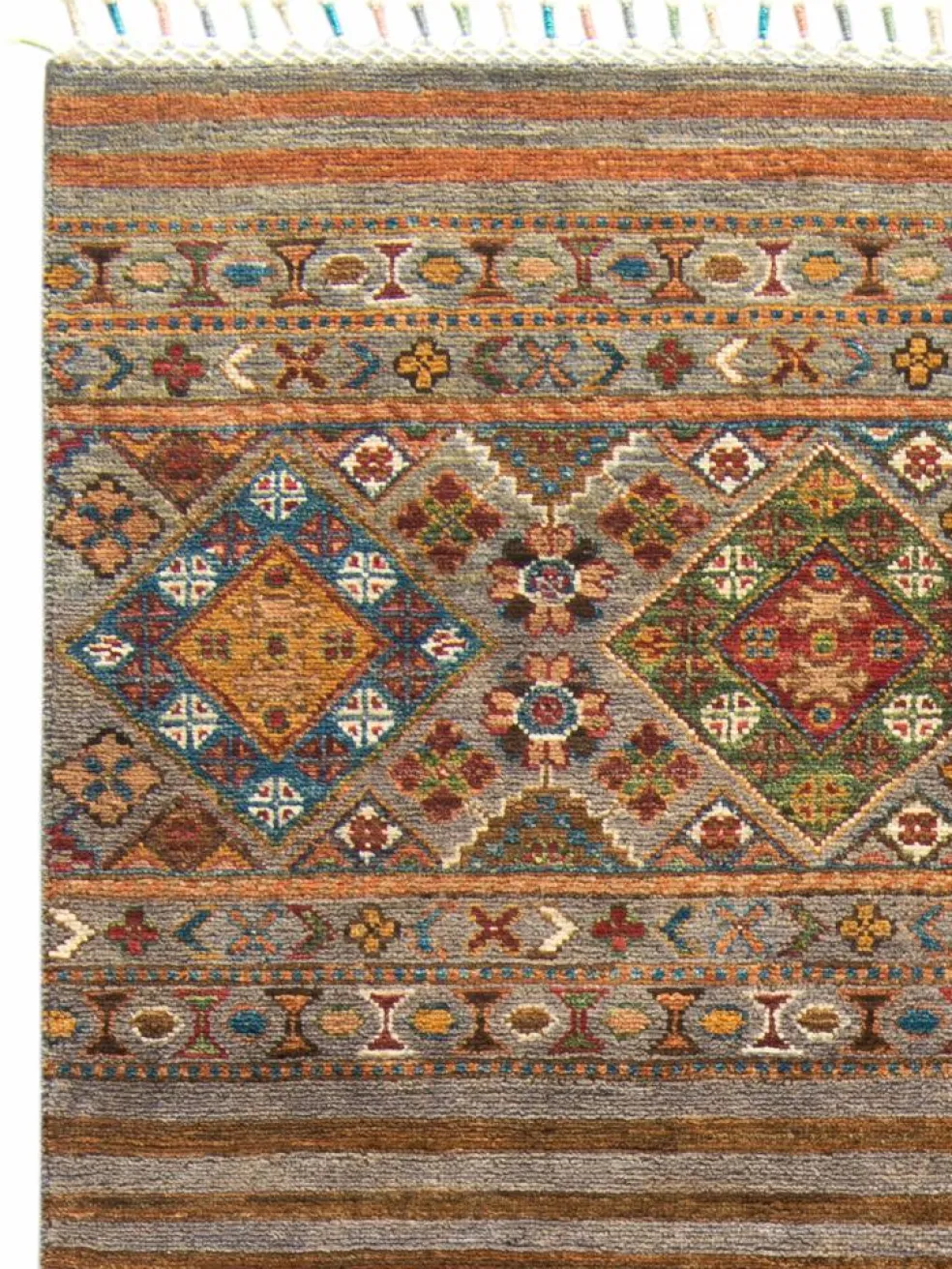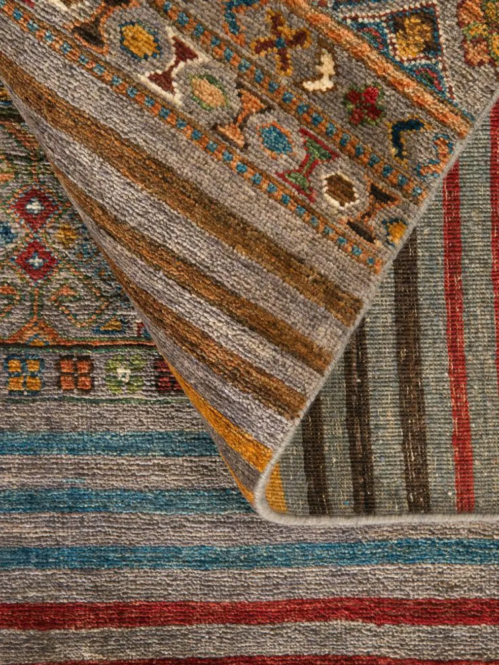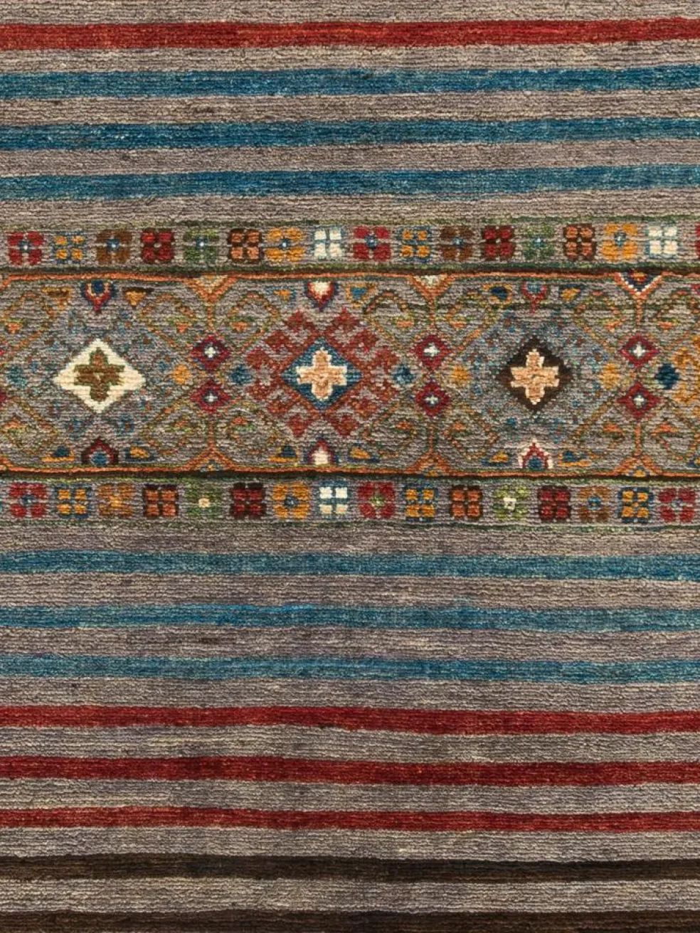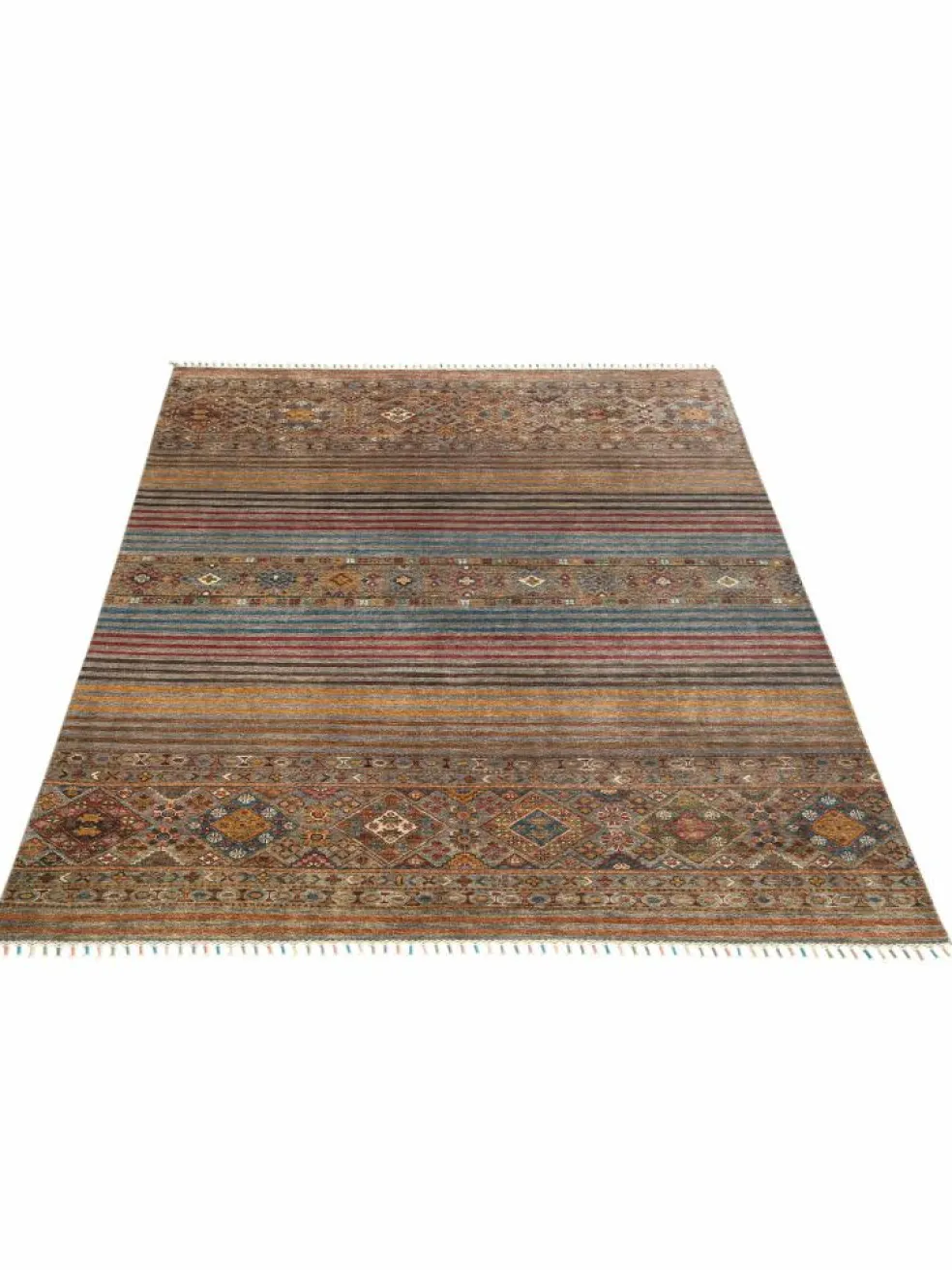 -Muster sind bunte Längsstreifen mit vielen verschiedenen Motiven gefüllt. Durch den flachen und festen Flor ist der Teppich unempfindlich gegenüber den Belastungen des Alltags.- Das Besondere an diesemOrientteppich