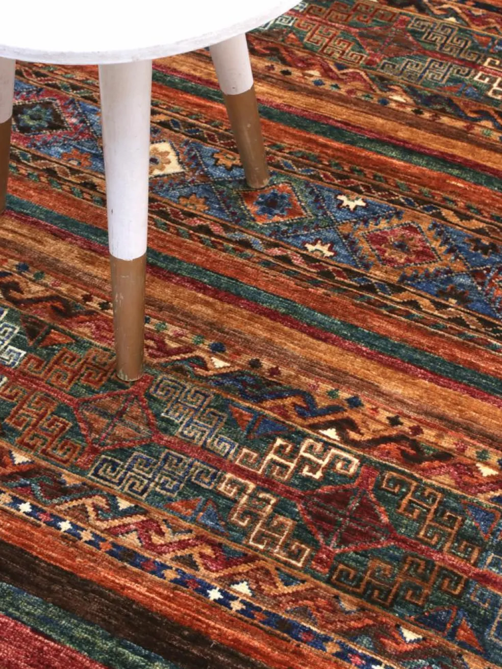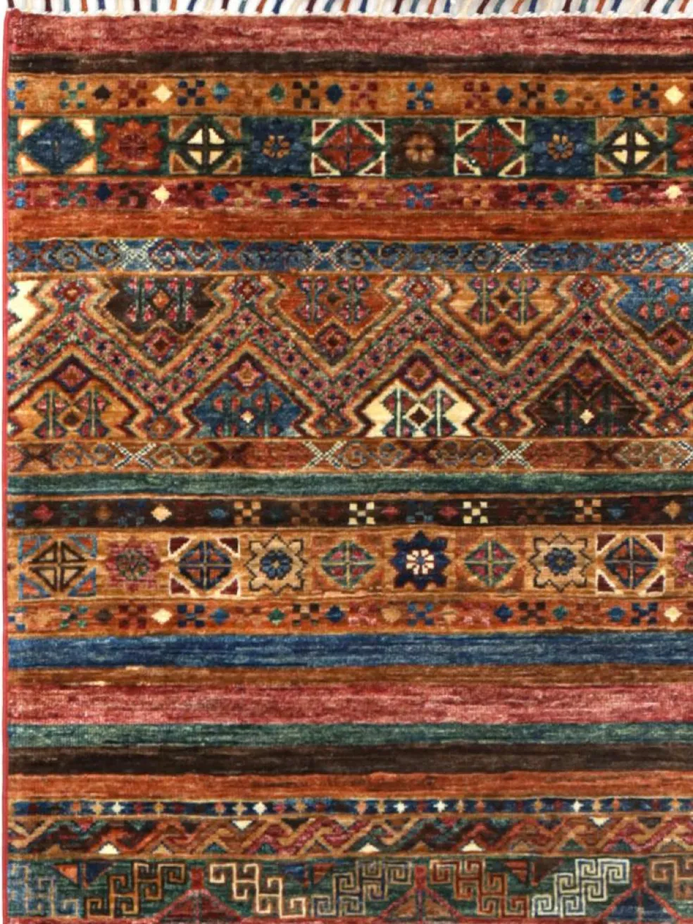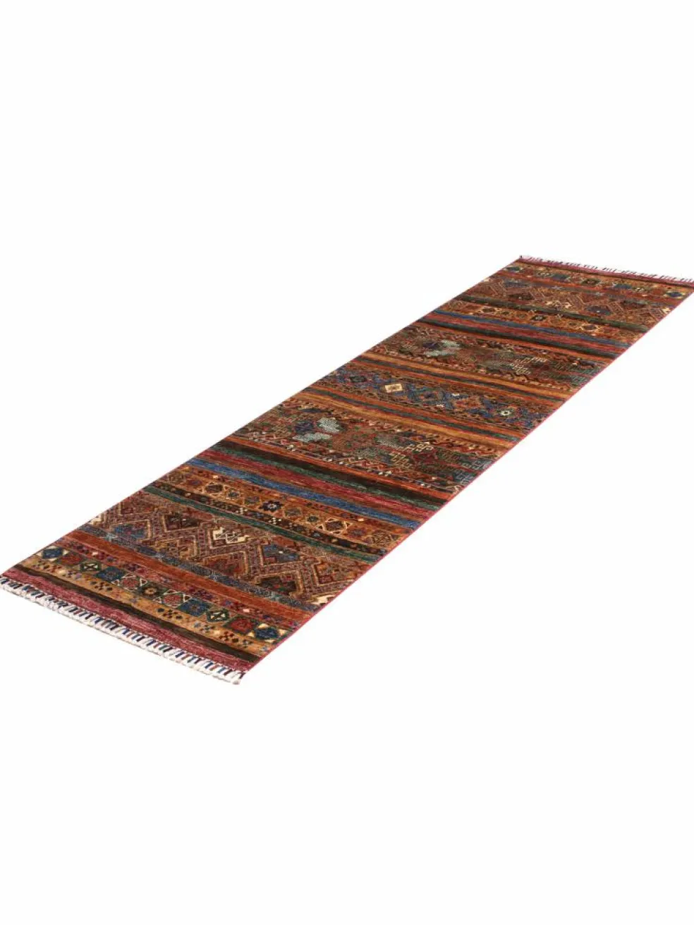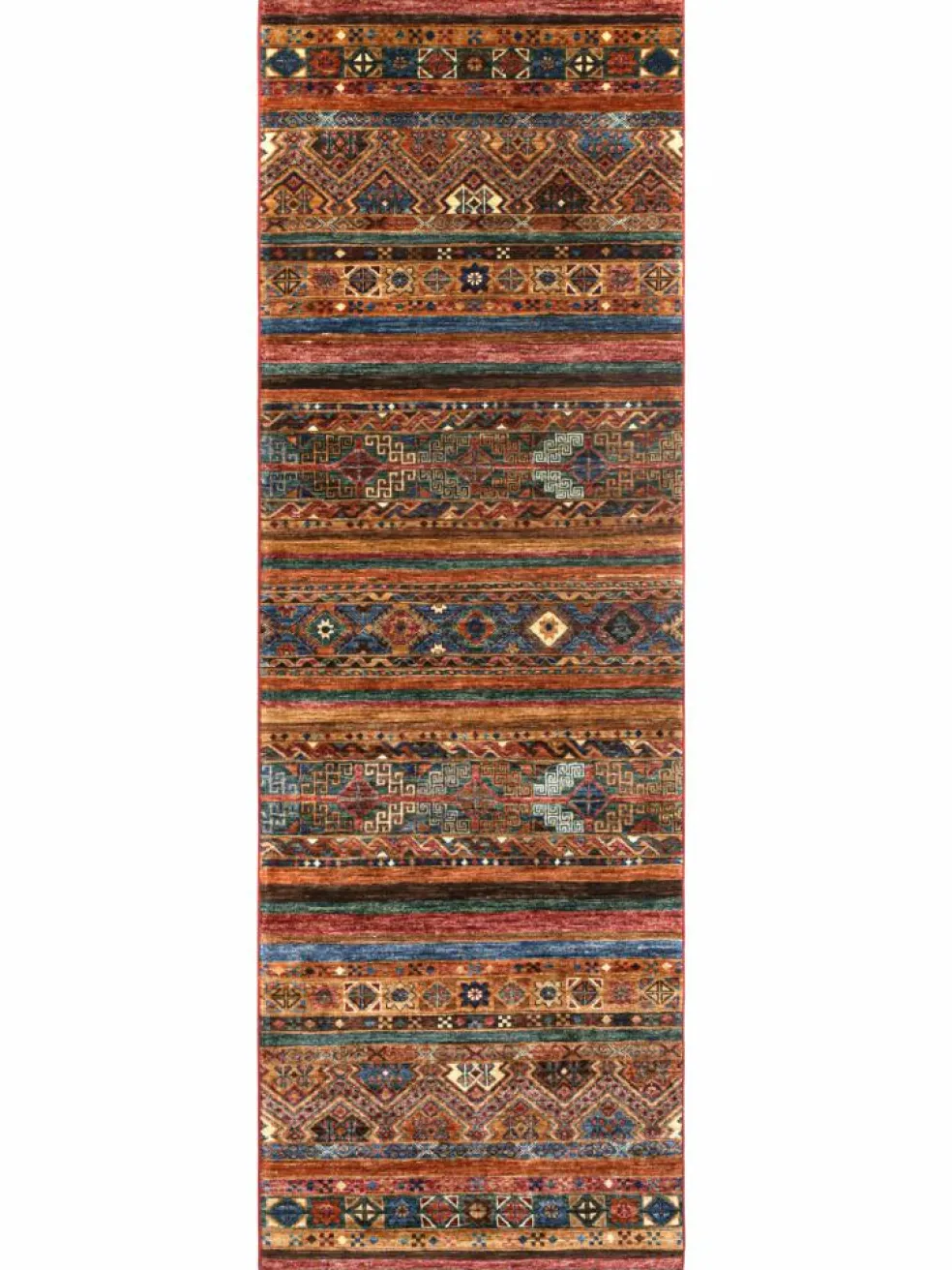 -Muster sind bunte Längsstreifen mit vielen verschiedenen Motiven gefüllt. Durch den flachen und festen Flor ist der Teppich unempfindlich gegenüber den Belastungen des Alltags. – Das Besondere an diesemOrientteppich