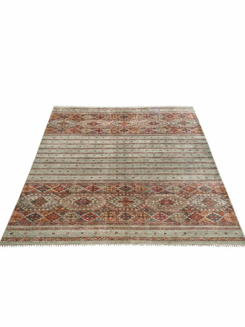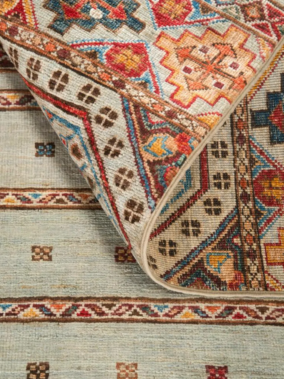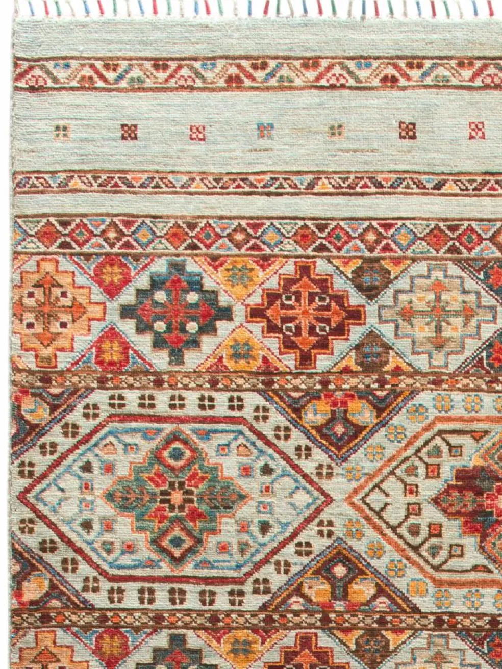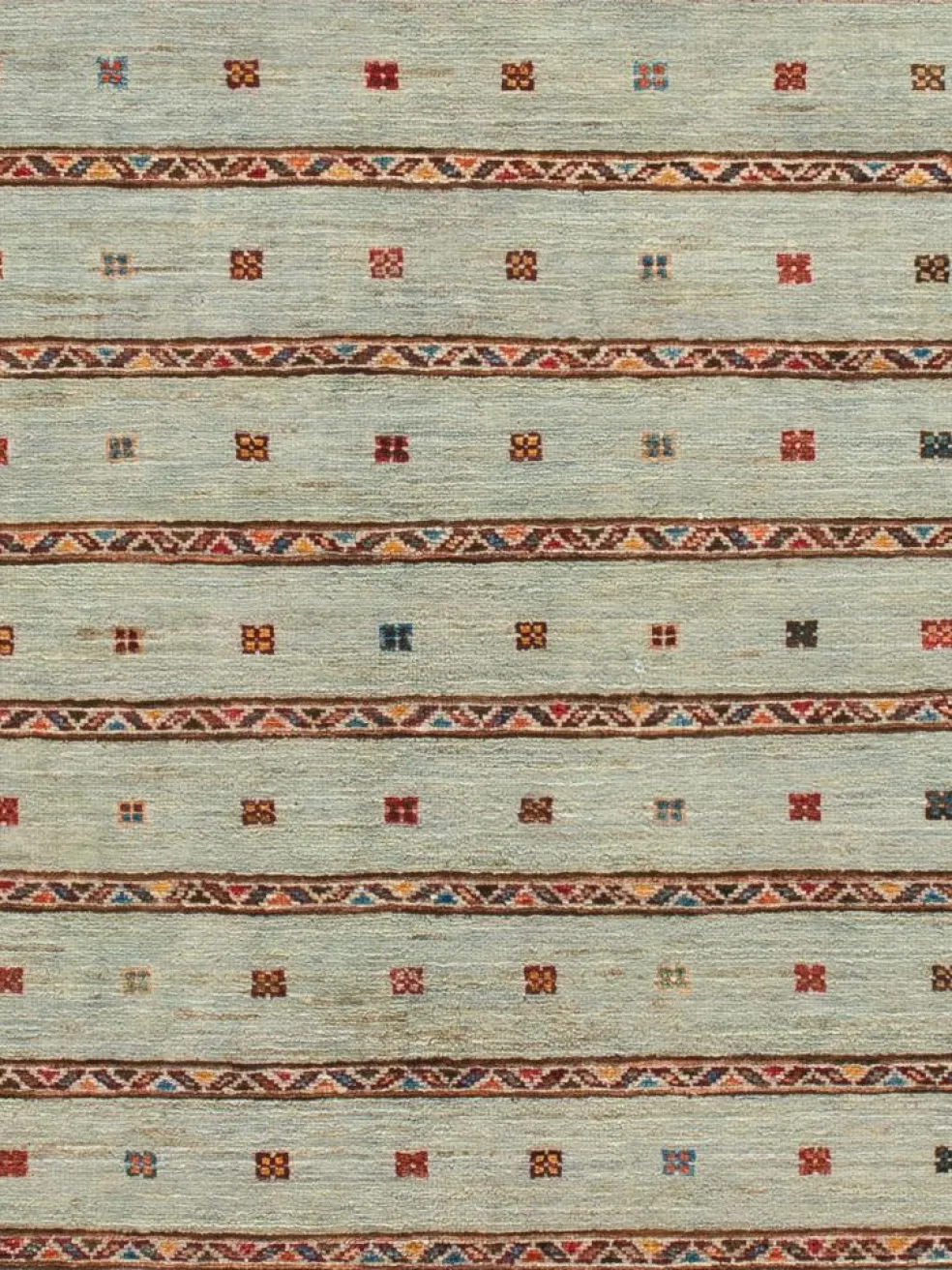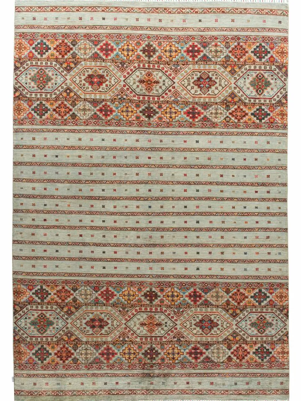 -Muster sind bunte Längsstreifen mit vielen verschiedenen Motiven gefüllt. Durch den flachen und festen Flor ist der Teppich unempfindlich gegenüber den Belastungen des Alltags.- Das Besondere an diesemOrientteppich