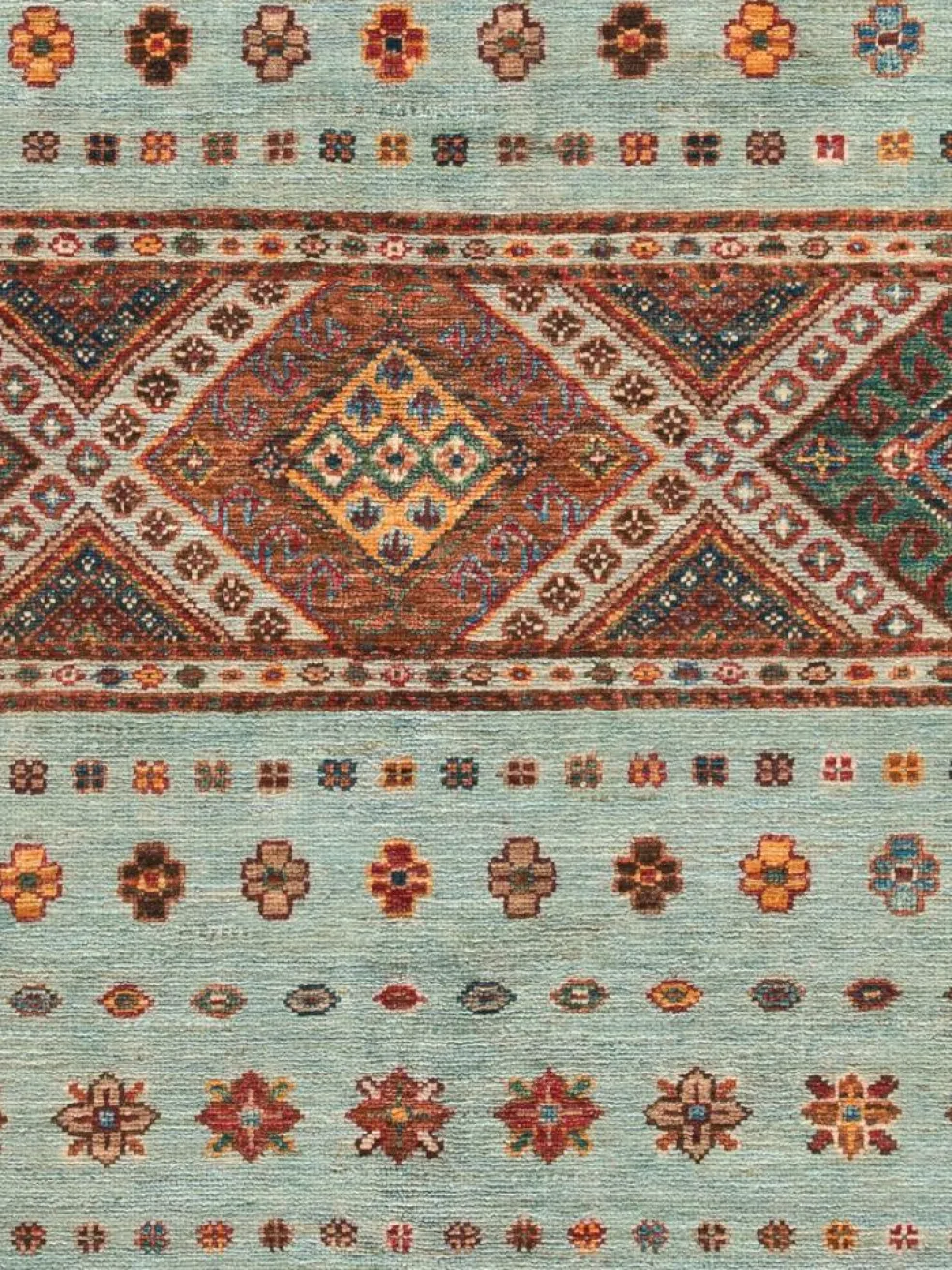 -Muster sind bunte Längsstreifen mit vielen verschiedenen Motiven gefüllt. Durch den flachen und festen Flor ist der Teppich unempfindlich gegenüber den Belastungen des Alltags.- Das Besondere an diesemOrientteppich