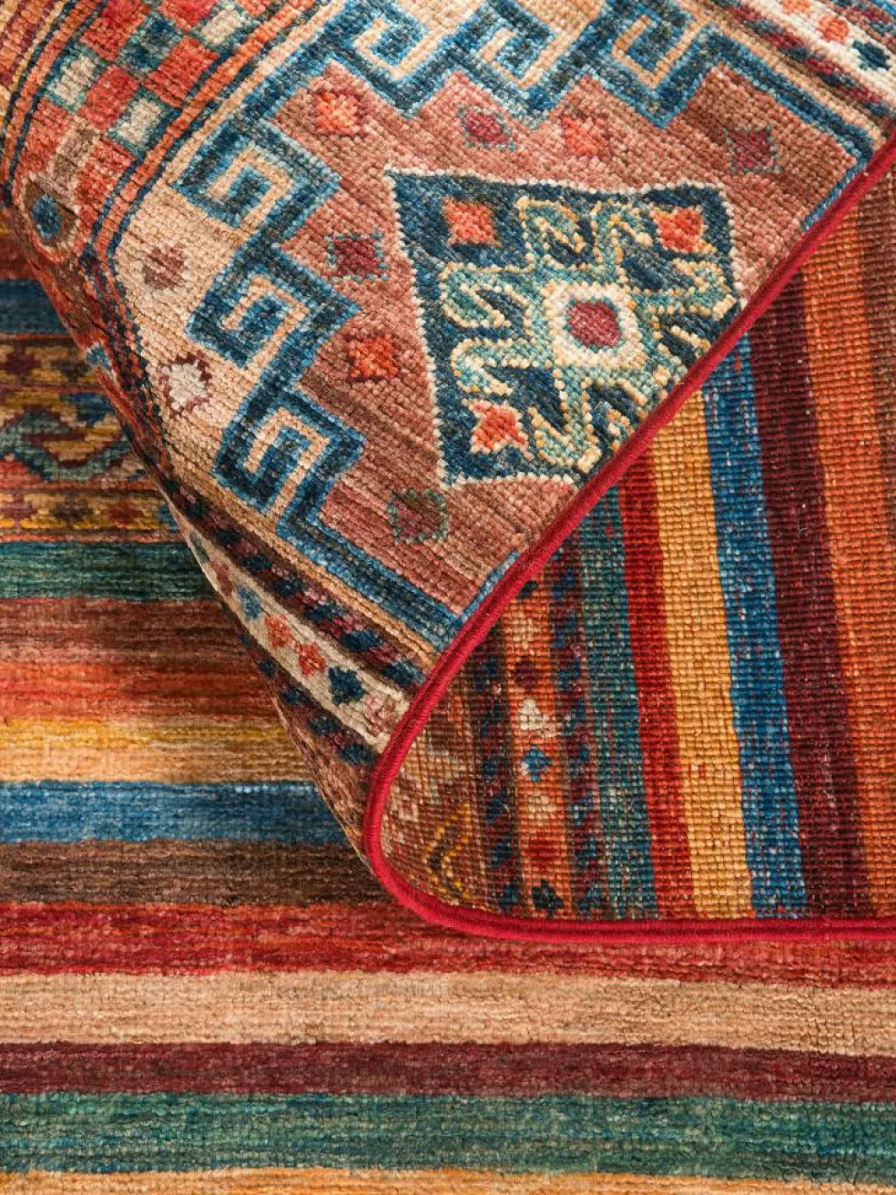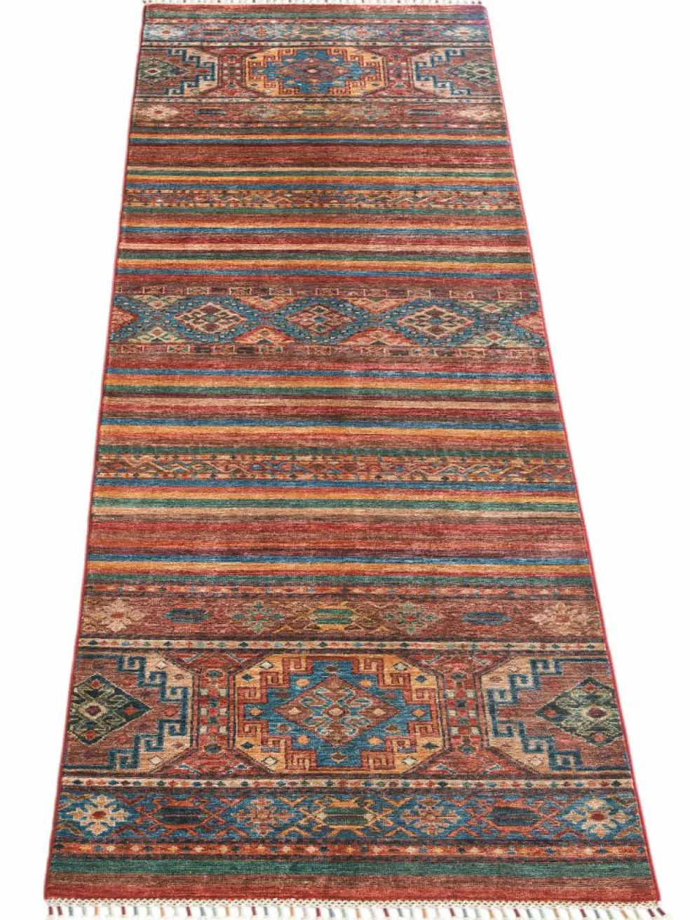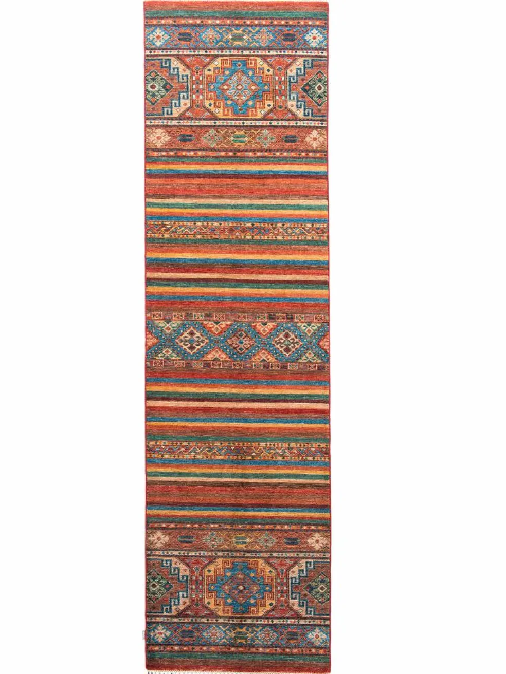 -Muster sind bunte Längsstreifen mit vielen verschiedenen Motiven gefüllt. Durch den flachen und festen Flor ist der Teppich unempfindlich gegenüber den Belastungen des Alltags.- Das Besondere an diesemOrientteppich