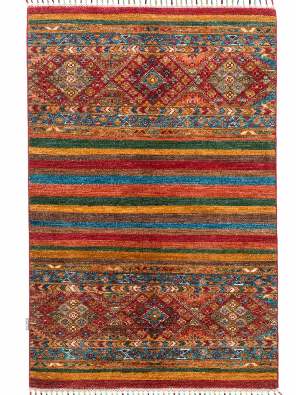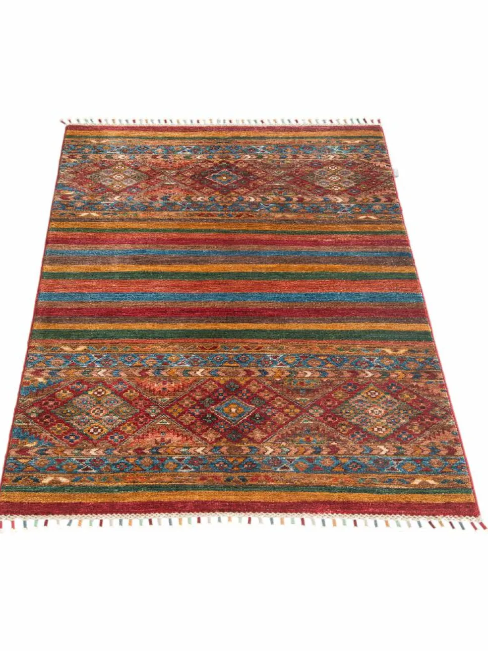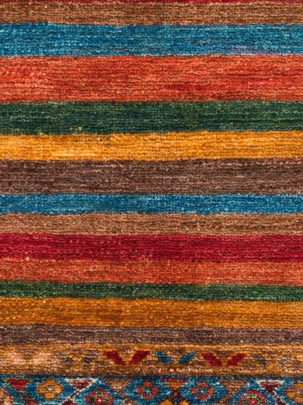 -Muster sind bunte Längsstreifen mit vielen verschiedenen Motiven gefüllt. Durch den flachen und festen Flor ist der Teppich unempfindlich gegenüber den Belastungen des Alltags.- Das Besondere an diesemOrientteppich