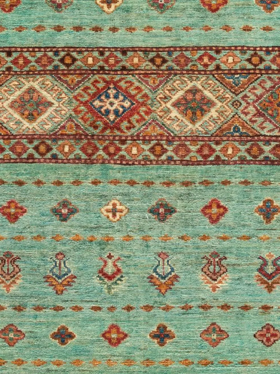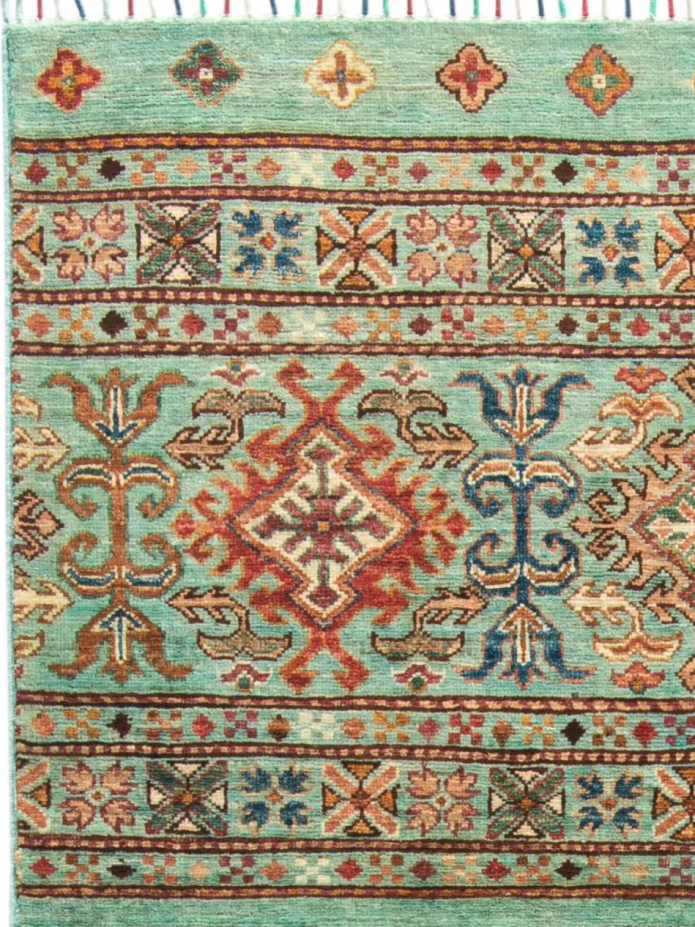 -Muster sind bunte Längsstreifen mit vielen verschiedenen Motiven gefüllt. Durch den flachen und festen Flor ist der Teppich unempfindlich gegenüber den Belastungen des Alltags.- Das Besondere an diesemOrientteppich