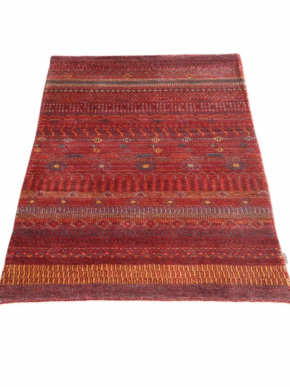 ist eine ungewöhnliche moderne Variation des traditionellen persichen Gabbehs. Er ist kürzer im Flor und feiner geknüpft. Es gibt zahllose Neukreationen in individuellen und einzigartigen Farben und Mustern.| Gesamthöhe: | ca. 10 mm |