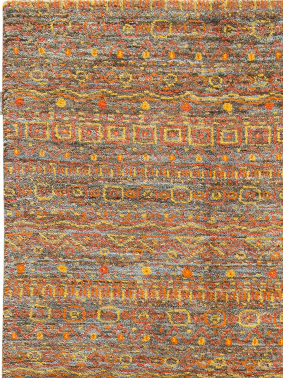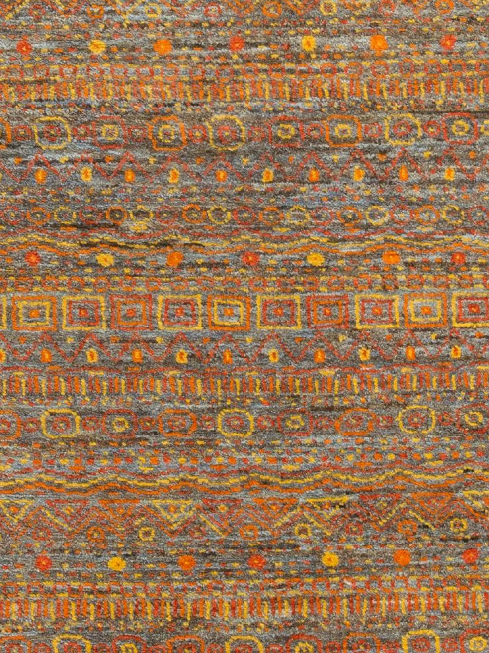 ist eine ungewöhnliche moderne Variation des traditionellen persichen Gabbehs. Er ist kürzer im Flor und feiner geknüpft. Es gibt zahllose Neukreationen in individuellen und einzigartigen Farben und Mustern. – Fein geknüpft inDouble-Knot
