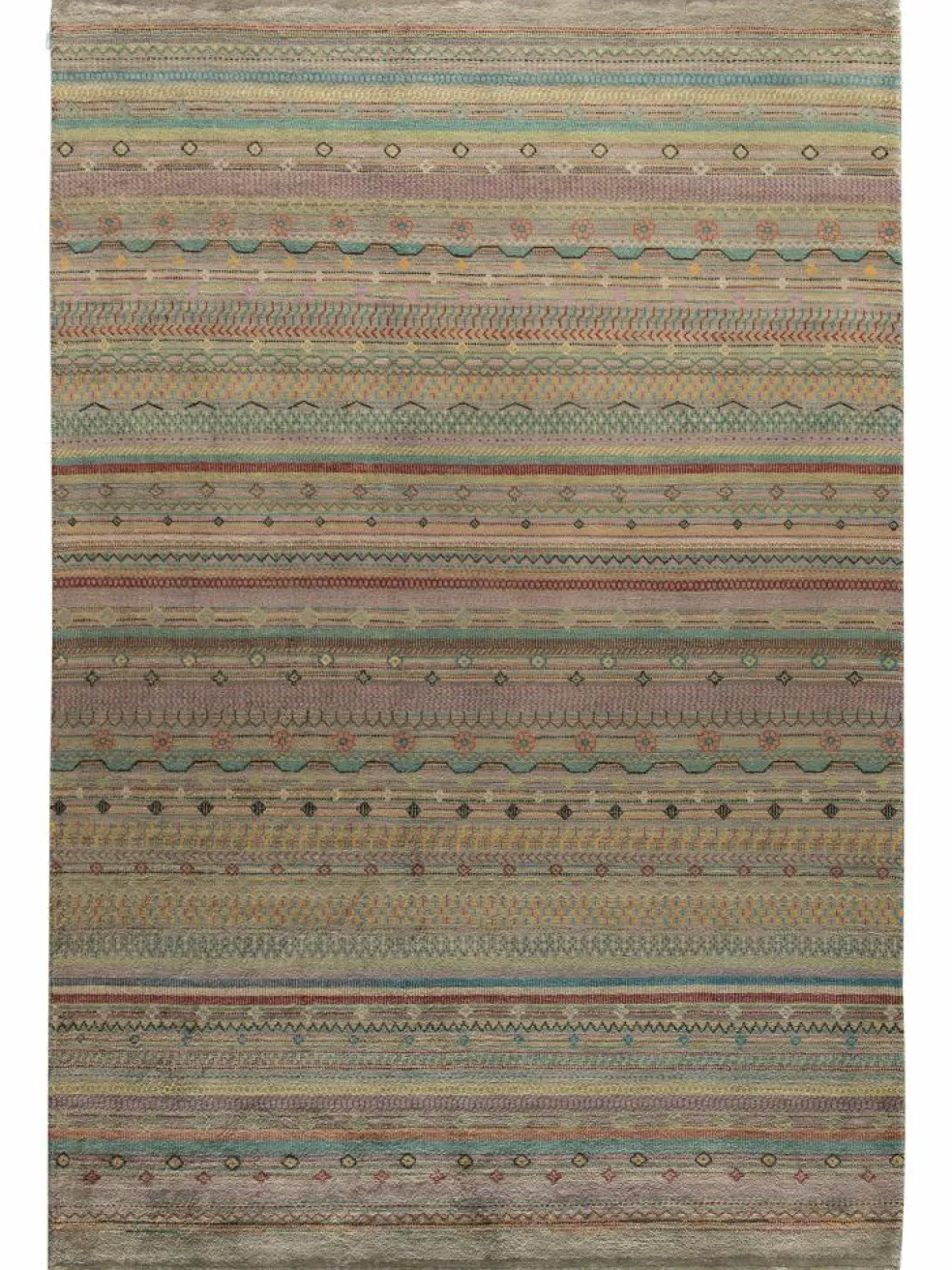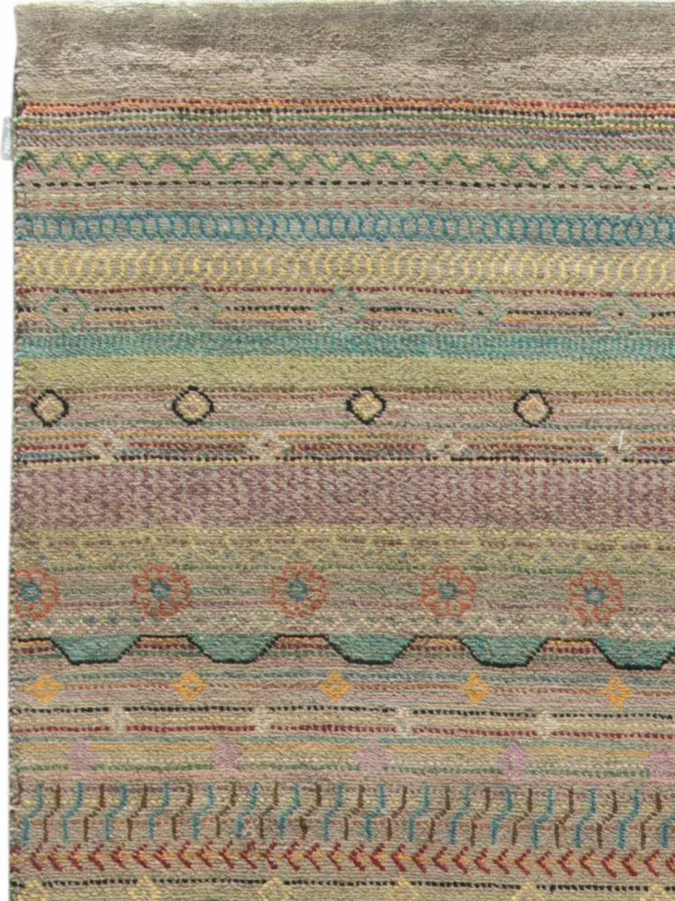 ist eine ungewöhnliche moderne Variation des traditionellen persichen Gabbehs. Er ist kürzer im Flor und feiner geknüpft. Es gibt zahllose Neukreationen in individuellen und einzigartigen Farben und Mustern.| Gesamthöhe: | ca. 10 mm |