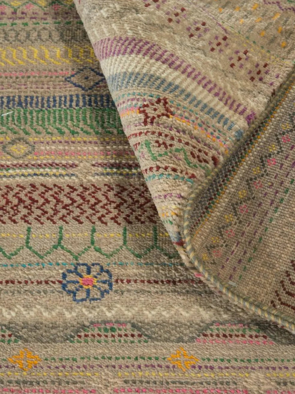 ist eine ungewöhnliche moderne Variation des traditionellen persichen Gabbehs. Er ist kürzer im Flor und feiner geknüpft. Es gibt zahllose Neukreationen in individuellen und einzigartigen Farben und Mustern.| Gesamthöhe: | ca. 10 mm |