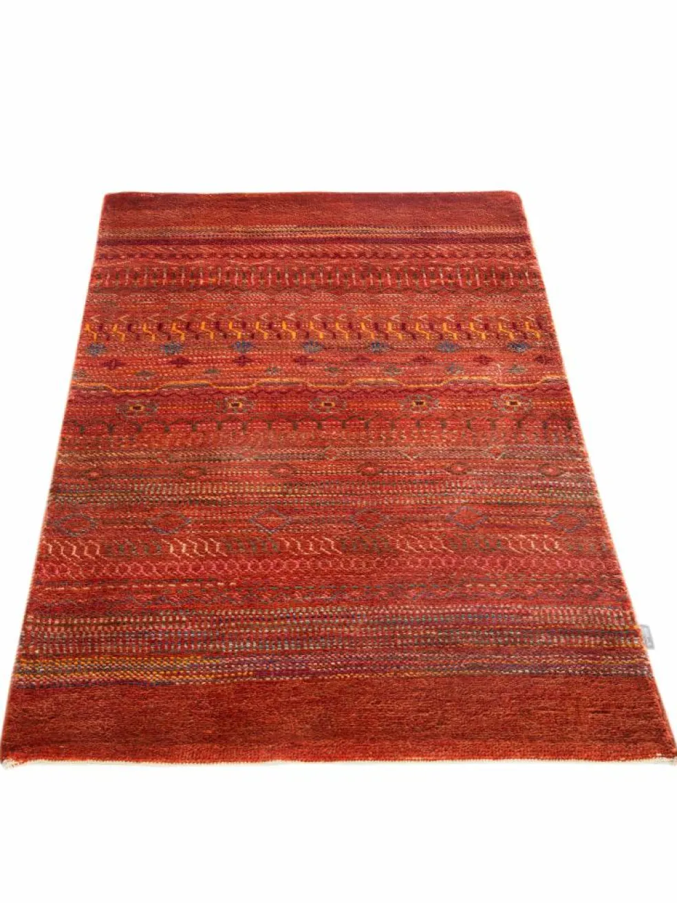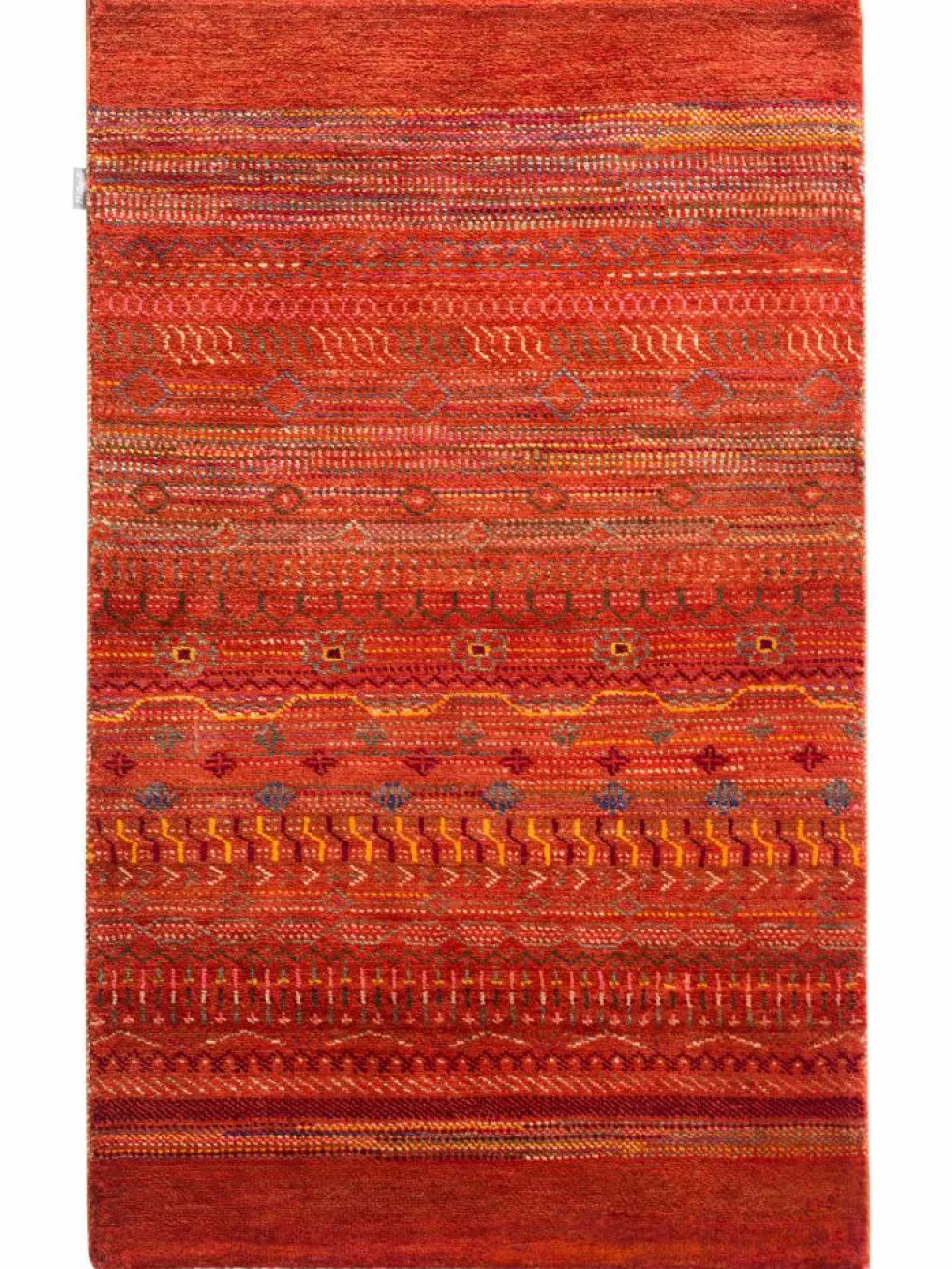 ist eine ungewöhnliche moderne Variation des traditionellen persichen Gabbehs. Er ist kürzer im Flor und feiner geknüpft. Es gibt zahllose Neukreationen in individuellen und einzigartigen Farben und Mustern. – Fein geknüpft inDouble-Knot