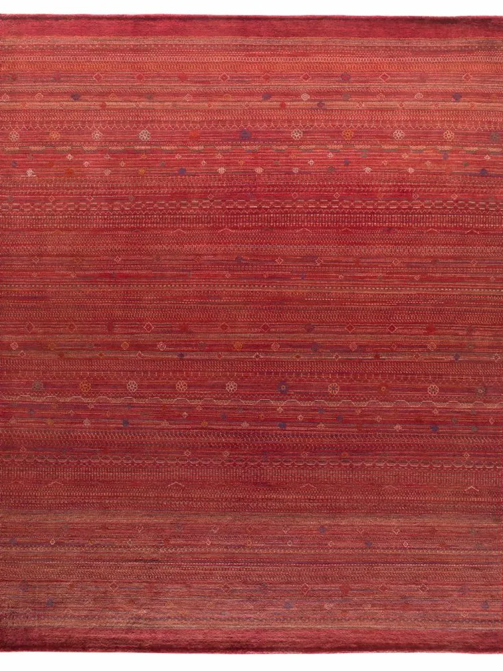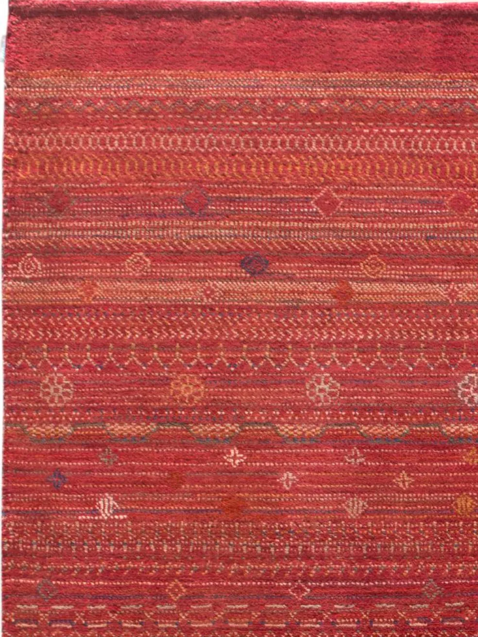 ist eine ungewöhnliche moderne Variation des traditionellen persichen Gabbehs. Er ist kürzer im Flor und feiner geknüpft. Es gibt zahllose Neukreationen in individuellen und einzigartigen Farben und Mustern.| Gesamthöhe: | ca. 7 mm |