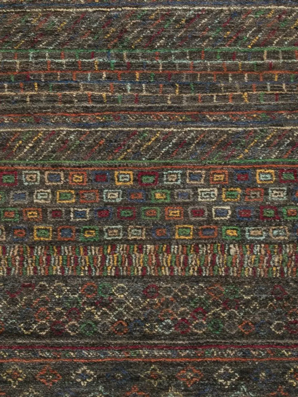 ist eine ungewöhnliche moderne Variation des traditionellen persichen Gabbehs. Er ist kürzer im Flor und feiner geknüpft. Es gibt zahllose Neukreationen in individuellen und einzigartigen Farben und Mustern.| Gesamthöhe: | ca. 7 mm |