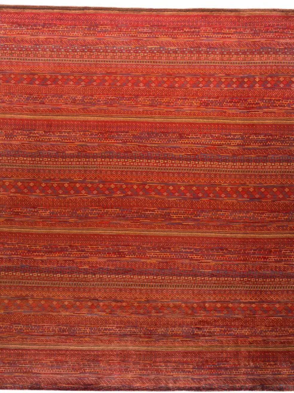 ist eine ungewöhnliche moderne Variation des traditionellen persichen Gabbehs. Er ist kürzer im Flor und feiner geknüpft. Es gibt zahllose Neukreationen in individuellen und einzigartigen Farben und Mustern.| Gesamthöhe: | ca. 10 mm |