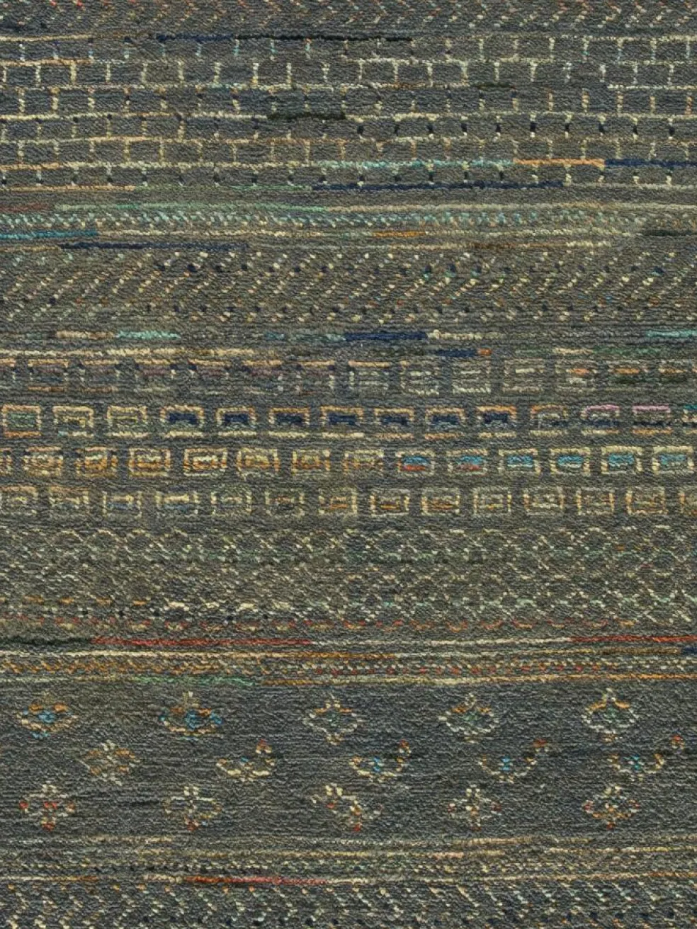 ist eine ungewöhnliche moderne Variation des traditionellen persichen Gabbehs. Er ist kürzer im Flor und feiner geknüpft. Es gibt zahllose Neukreationen in individuellen und einzigartigen Farben und Mustern.| Gesamthöhe: | ca. 7 mm |