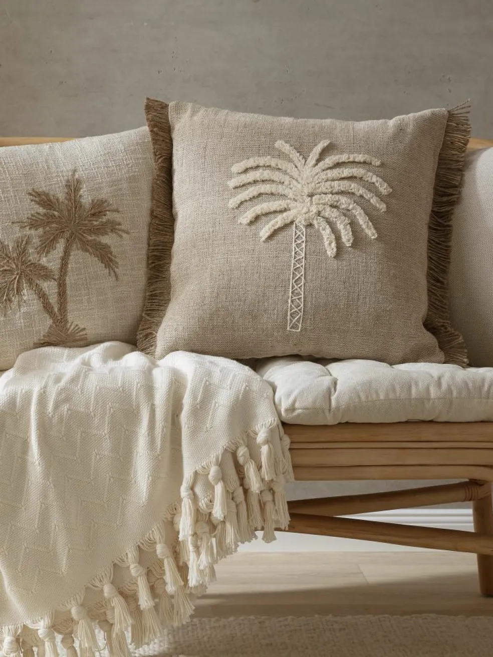 Ein Motiv, dass zum Träumen einlädt: Unser Dekokissen Corifa mit besonderer Palmenstickerei bringt natürlichen Charme und Eleganz in jedes zu Hause. Die schönen Naturmaterialien verleihen jedem Raum einen natürlichen Touch. Das Kissen besteht zu 100 % aus Baumwolle. Die seitlichen Jute-