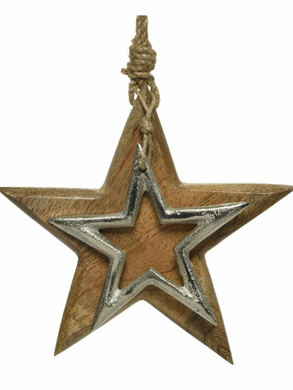 Weihnachtlicher Sternenanhänger aus Mangoholz und Metall am Juteband.